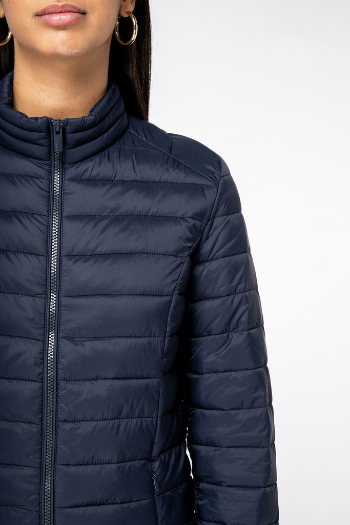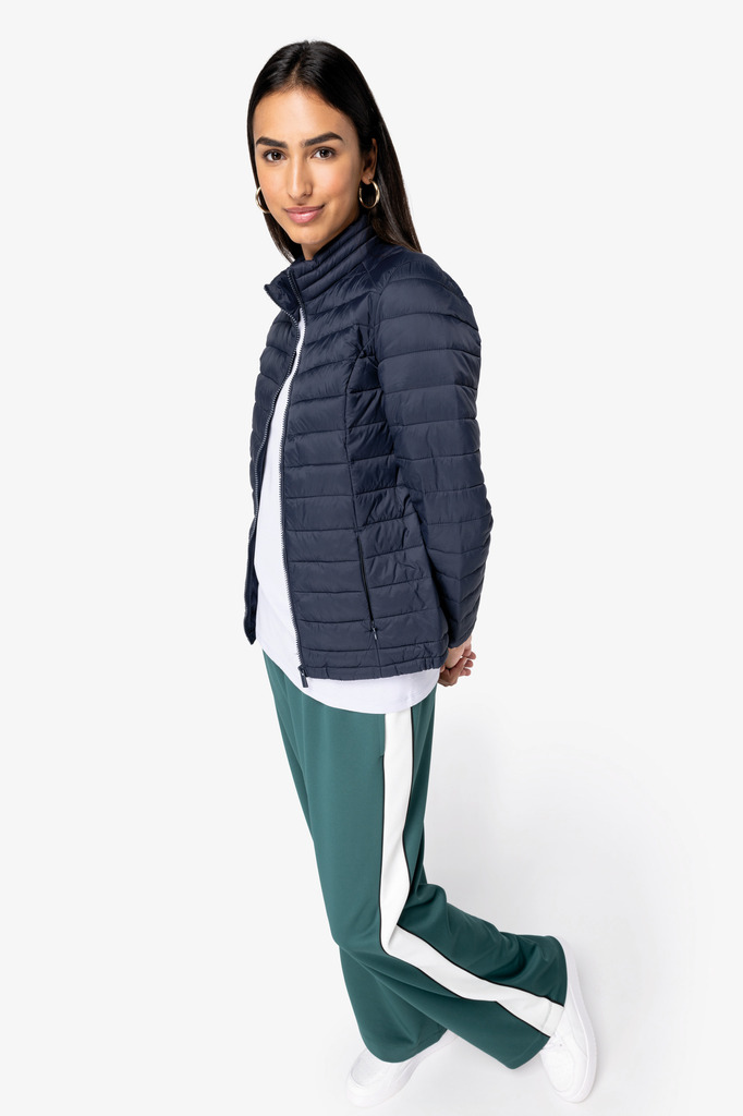 100% poliamida reciclada. Enchimento com efeito de penas em 50% Sorona® e 50% poliéster reciclado. Corte direito ligeiramenta cintado. Toque suave e liso. Tecido repelente à água nível 4 e corta-vento 3 mm/s. Gola subida. Dois bolsos laterais com fechos invisíveis em nylon reciclado. Dois bolsos interiores. Fecho principal em plástico reciclado tom sobre tom. Cós e punhos elásticos. Encaixes laterais e nos ombros. Entregue com saco para guardar. Largura entre os pespontos: 4,5 cm. Peso médio do tamanho M: 360g.