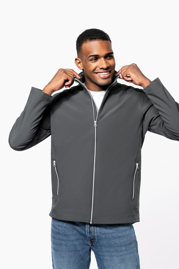 Exterior: 95% poliéster / 5% elastano. Interior: 100% poliéster micropolar. Tecido repelente à água. Corte justo. 2 bolsos exteriores com fecho. Fechos em contraste. Mais comprido nas costas. Acabamento com pespontos na zona lateral e nos ombros.