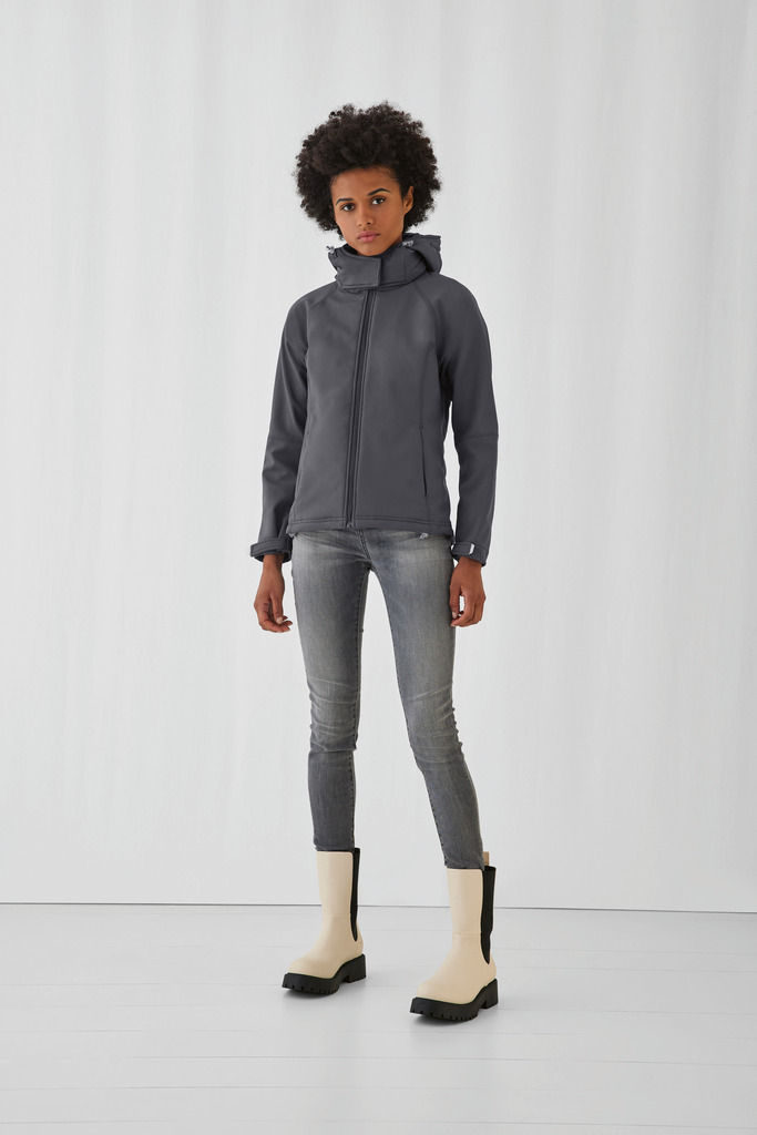 94% poliéster/6% elastano. Impermeável a 5000 mm e respirável 1000 g/m2/24h. Exterior: Tecido de softshell. Membrana: cobertura arejada microperfurada. Interior: micropolar com tratamento antiborboto. 100% poliéster em rede. Corte feminino justo. Capuz passa-montanhas amovÃvel com cordões ajustáveis e stoppers. Fecho com protecção para o queixo. Carcela interior no tecido de base. 2 bolsos frontais com fecho. Mangas raglan. Fechos invertidos. Punhos com carcela de fecho com Velcro®. Cursor em plástico com relevo. Corte não ajustável com cordões elásticos no fundo das costas e 2 stoppers. Espaço livre da costura nas costas.