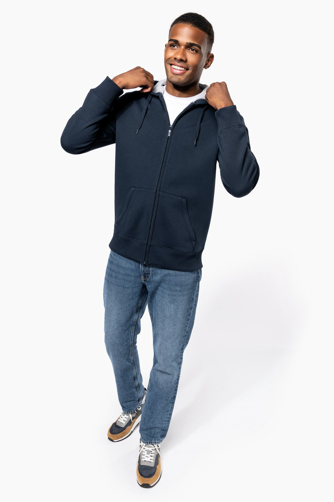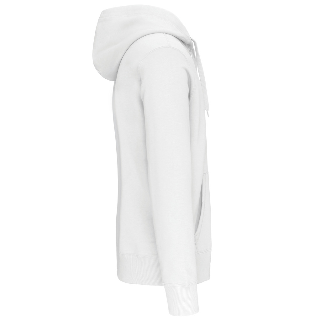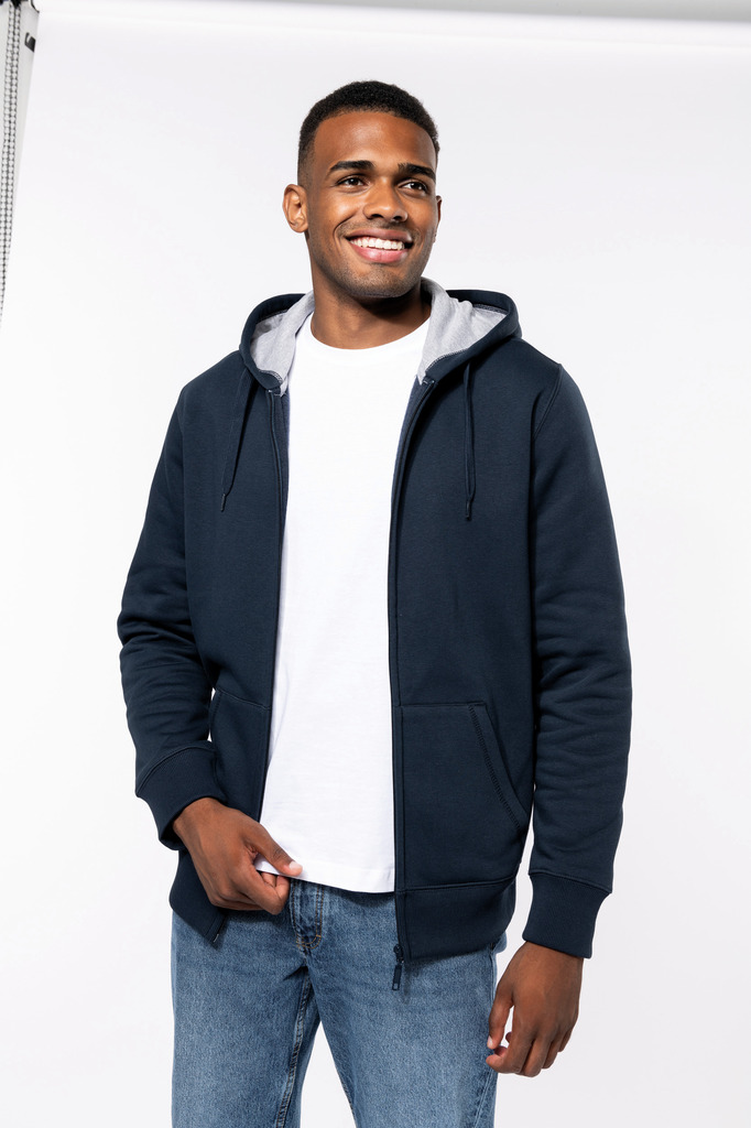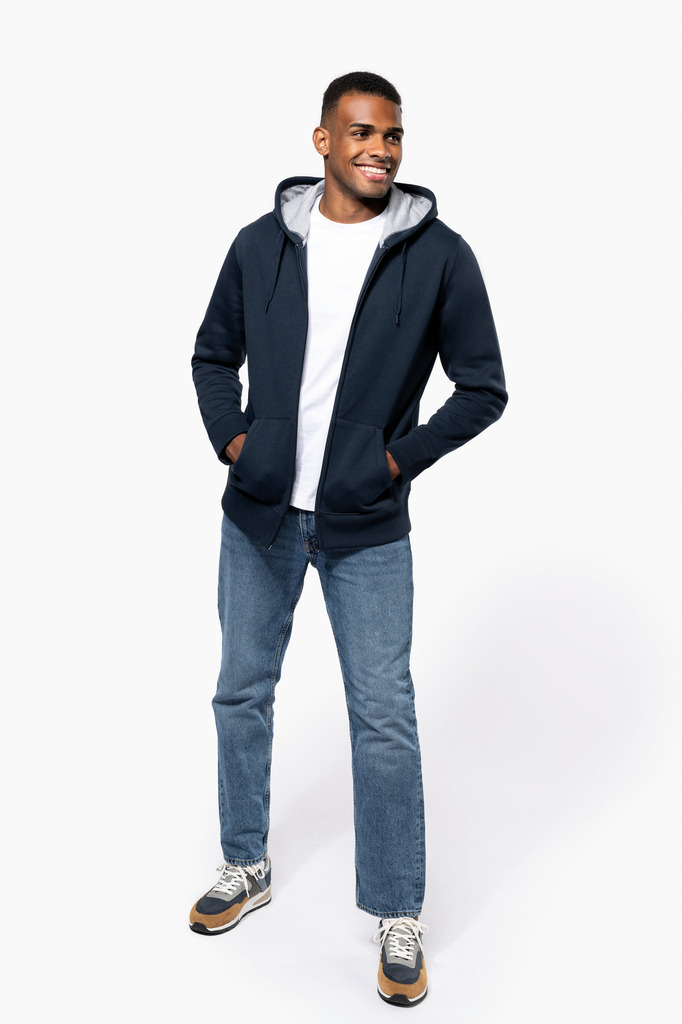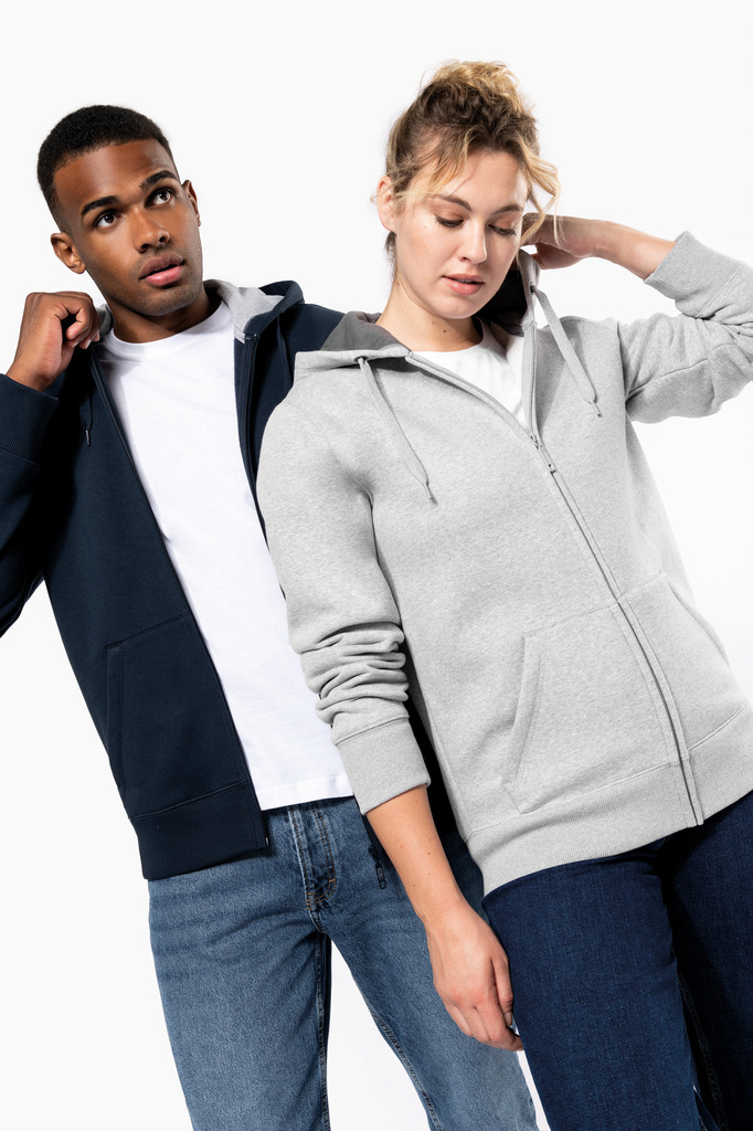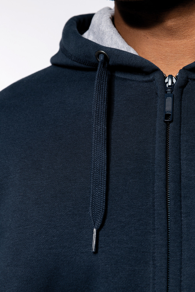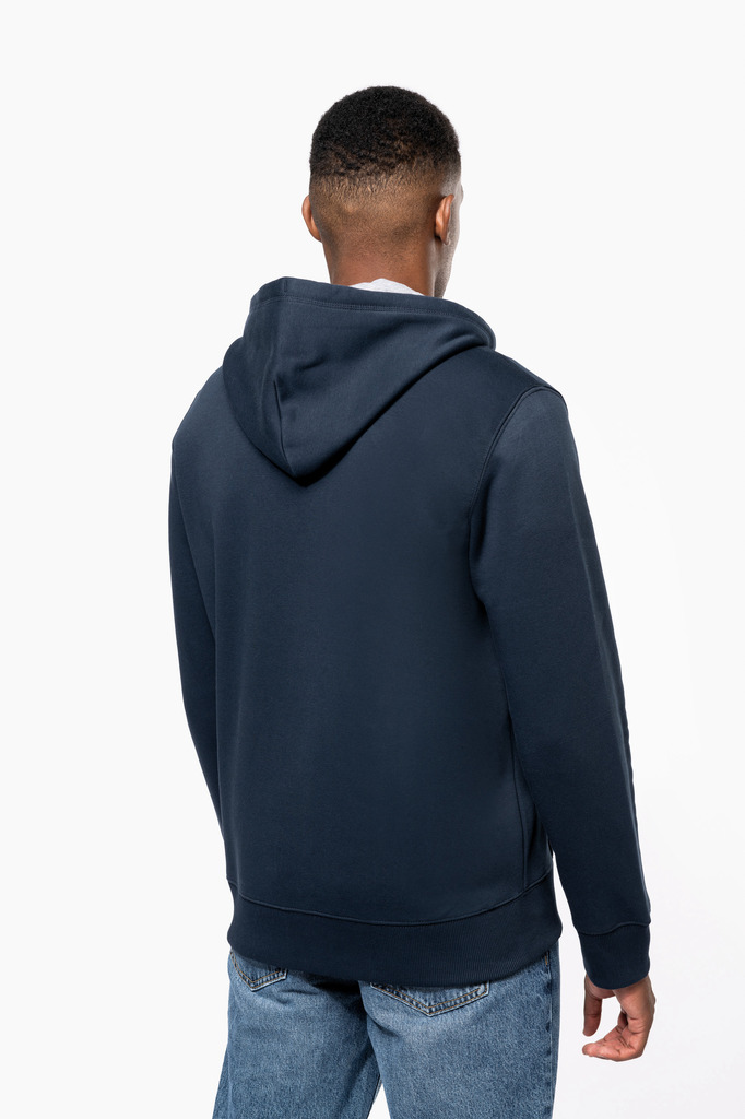 80% algodão penteado / 20% poliéster. Interior cardado. Lavagem com silicone. Interior do capuz em contraste. Tapa-costuras. Mangas set in. Bolsos frontais. Punhos e bainha com acabamento em rib.
