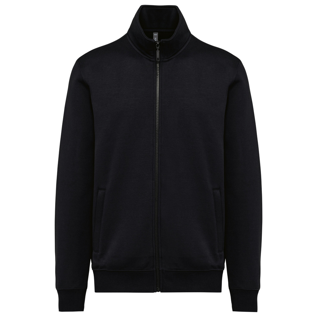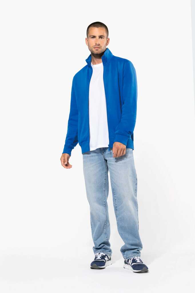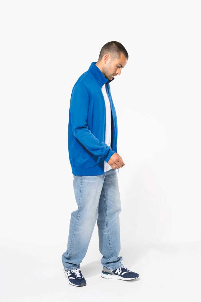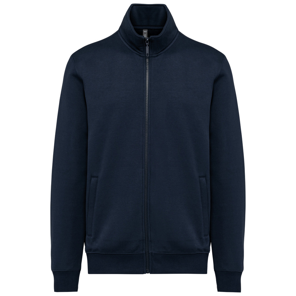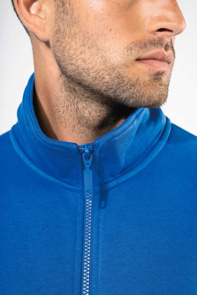 80% algodão / 20% poliéster. SuperfÃcie exterior 100% algodão. Tratamento LSF (Low Shrinkage Fleece: cardado pré-encolhido). Interior cardado com 3 fios em algodão penteado. Corte justo. Mangas direitas. Gola subida. Fecho plástico tom sobre tom. 2 bolsos com fecho e pesponto. Acabamento em meia-lua na interior da gola nas costas para facilitar a personalização. Acabamento em malha rib 1 x 1 nas mangas e no cós. Etiqueta da marca Tear-away.