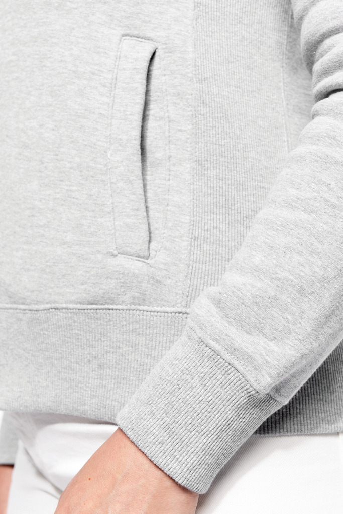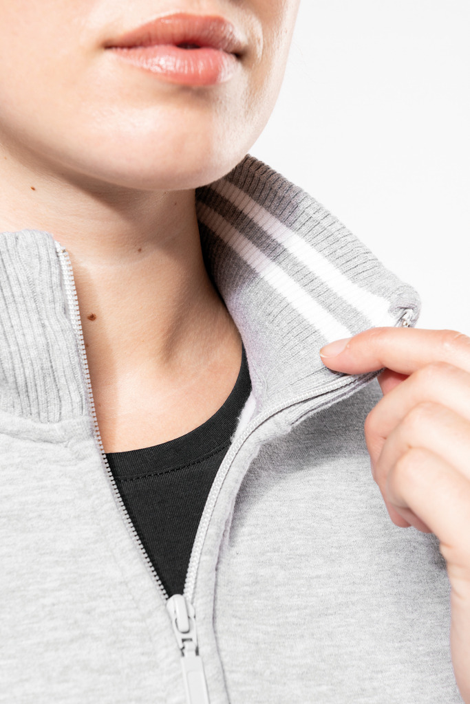 80% algodão penteado / 20% poliéster. Algodão penteado (cardado fino). Acabamento com banho de silicone. Corte justo com painéis em rib. Tapa-costuras à cor (excepto na cor White em que o tapa-costuras é em contraste, cor Oxford Grey). Gola em malha rib com contraste. 2 bolsos frontais. Punhos e cós em malha canelada rib.