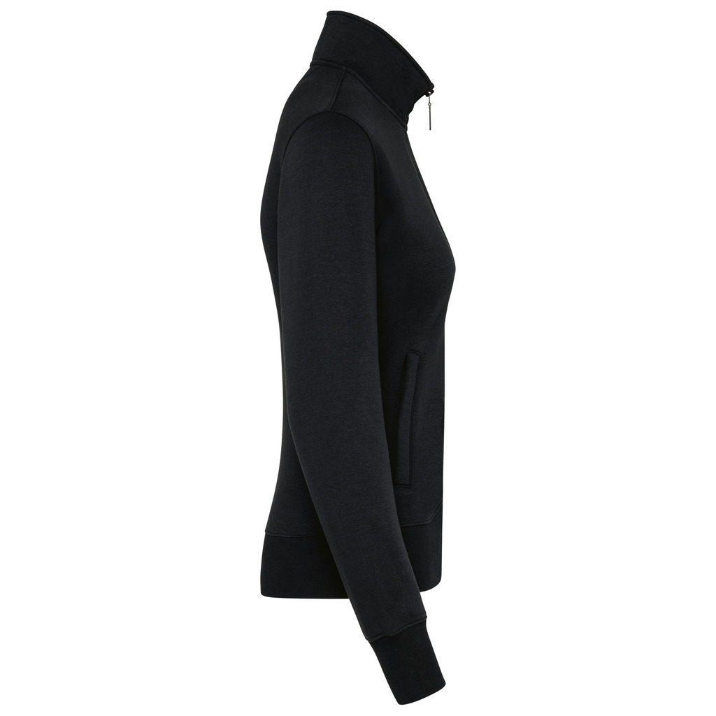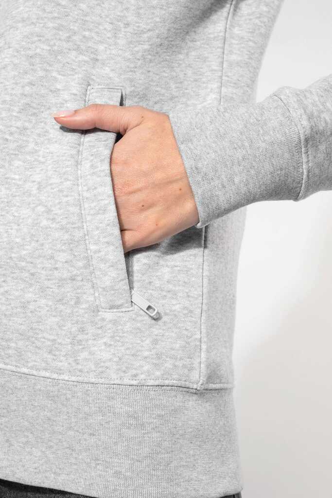80% algodão / 20% poliéster. Superfície exterior 100% algodão. Tratamento LSF (Low Shrinkage Fleece: cardado pré-encolhido). Interior cardado com 3 fios em algodão penteado. Corte justo. Mangas direitas. Gola subida. Fecho plástico tom sobre tom. 2 bolsos com fecho e pesponto. Acabamento em meia-lua no interior da gola nas costas para facilitar a personalização. Acabamento em malha rib 1 x 1 nas mangas e no cós. Etiqueta da marca Tear-away.