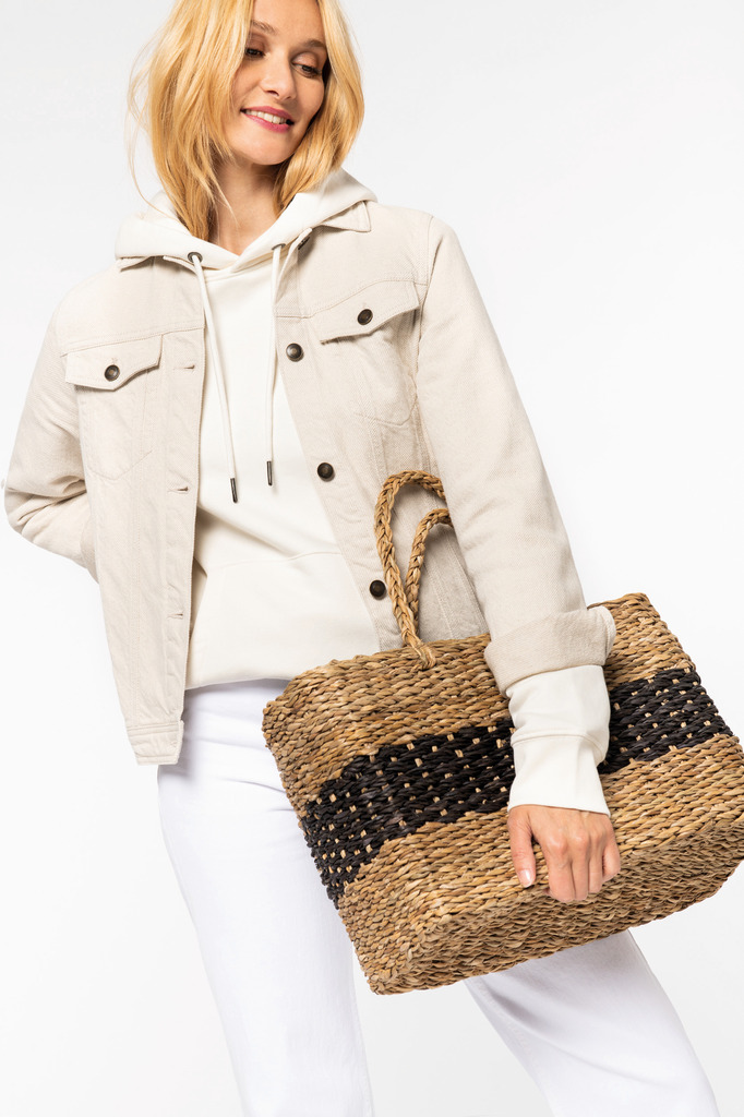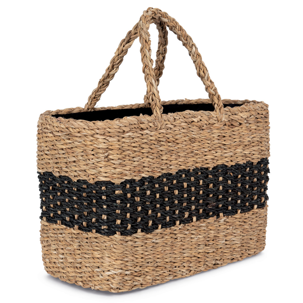 100% junco do mar. ONE SIZE (19 x 38cm x 27 cm). Capacidade: 21 l. Este produto foi entrançado à mão a partir de fibras vegetais de junco do mar. Forro interior cor Black em fio cyclo concebido a partir de 70% algodão reciclado, 28% poliéster reciclado e 2% outros materiais. Cordão de ajuste deslizante. Alças entrançadas redondas. Esta cesta nasceu de uma colaboração com a sociedade HandTouch, membro da ECOTA: organização para o comércio equitativo do Bangladesh, que contribui para uma economia mais sustentável.