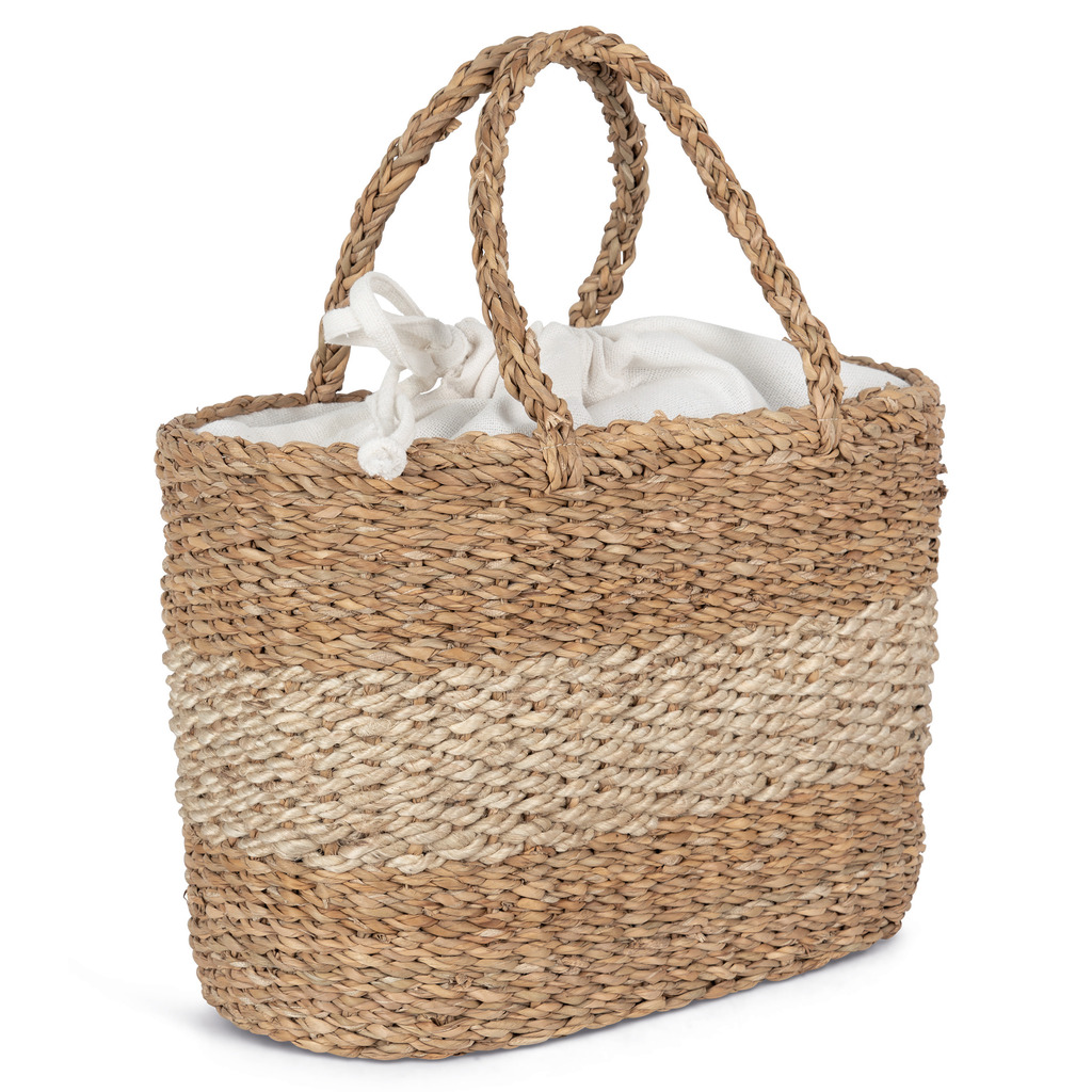 Mistura de juta e junco do mar. ONE SIZE (21 x 38 x 25,5 cm). Capacidade: 21 l. Este produto foi entrançado à mão a partir de fibras vegetais de junco do mar e juta. Forro interior cor Ecume em fio cyclo concebido a partir de 70% algodão reciclado, 28% poliéster reciclado e 2% outros materiais. Cordão de ajuste deslizante. Alças entrançadas redondas. Esta cesta nasceu de uma colaboração com a sociedade HandTouch, membro da ECOTA: organização para o comércio equitativo do Bangladesh, que contribui para uma economia mais sustentável.
