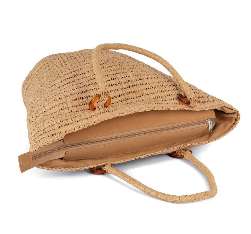 100% poliéster. Cesta de compras com alças entrançadas em corda. Forro interno em poliéster reciclado com bolso pequeno. Saco com fecho. Etiqueta grande de algodão de 12×5 cm para personalizar facilmente o produto.