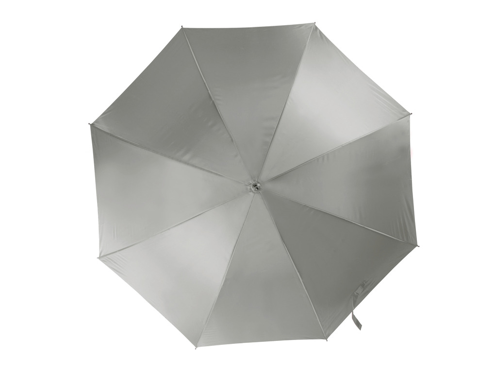 Chapéu-de-chuva com 23″ (58,5 cm), abertura automática, cabo metálico com espessura de 10 mm, tecido em poliéster 210T, pega curva em polipropileno, varetas metálicas pretas, pontinhas metálicas.