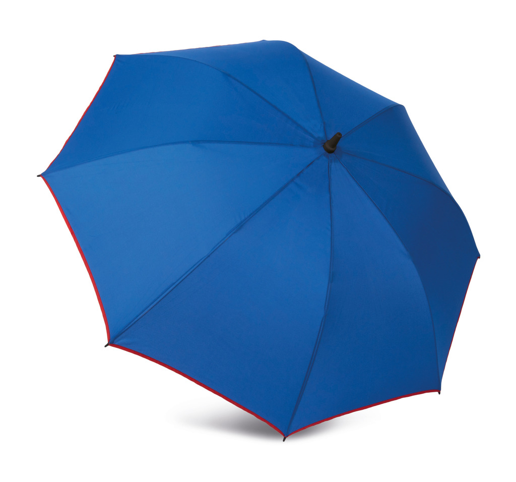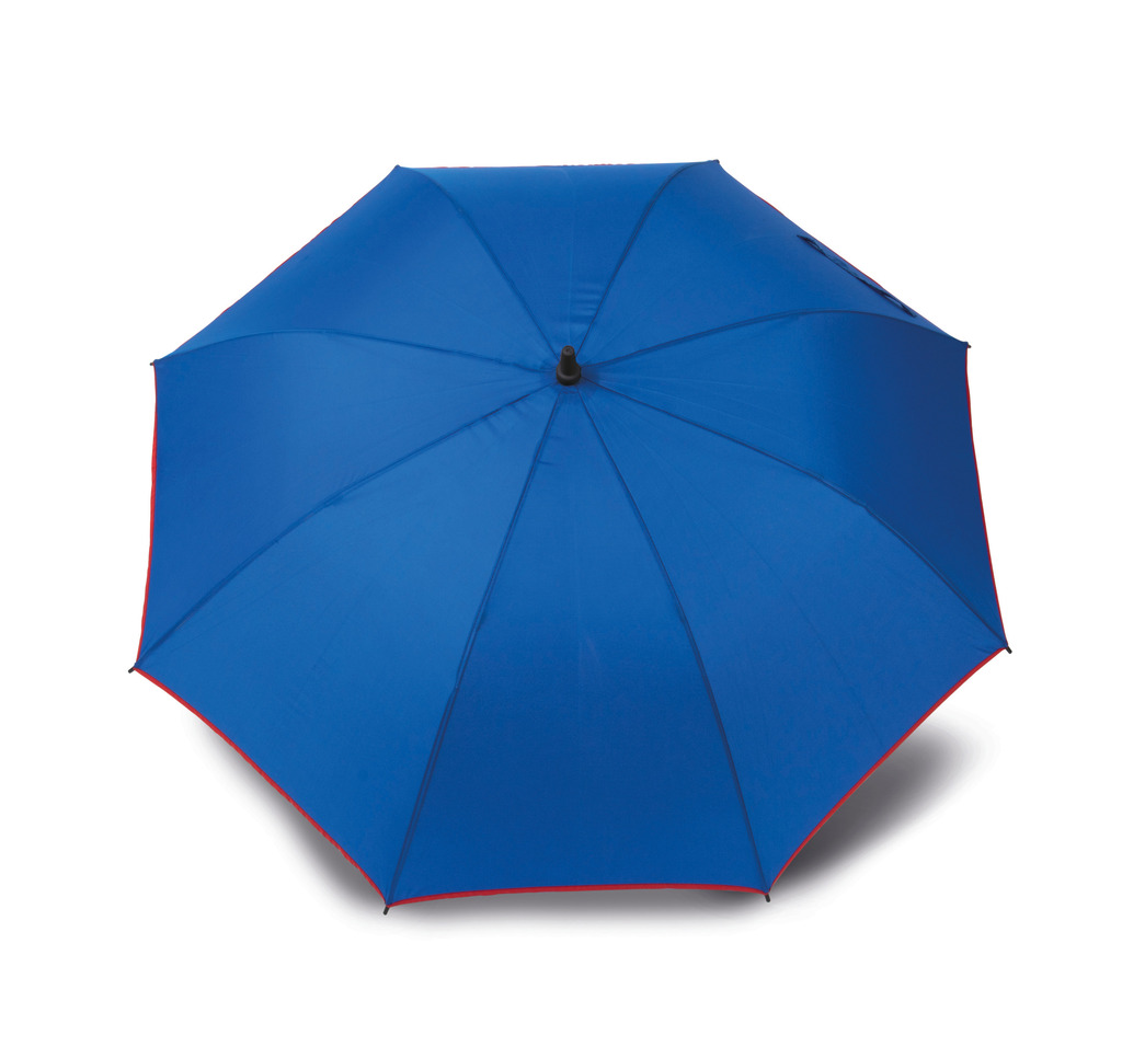 100% poliéster. Chapéu-de-chuva grande tipo golfe, com abertura automática. Com pega em metal de 14 mm, varetas em fibra de vidro e pontas das varetas em policarbonato colorido. Tecido em pongée de poliéster. Bainha, pega e varetas em contraste.