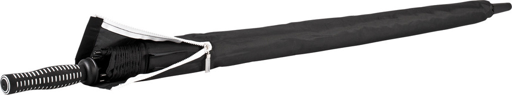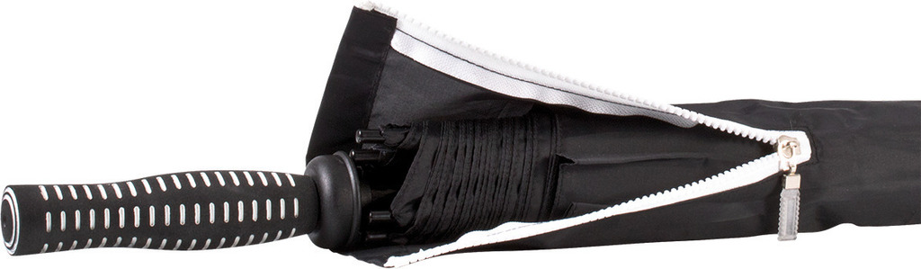 Chapéu-de-chuva de golfe com 29,5 polegadas (75 cm), abertura manual com cursor de segurança. Cabo e varetas em fibra de vidro, pontas das varetas em polipropileno. Tecido em poliéster 210T com tela dupla bicolor anti-rajadas de vento no topo. Pega ergonómica e antiderrapante. Bolsa com fecho em contraste.