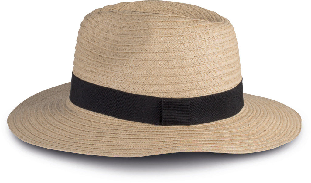 Chapéu em fibra vegetal estilo Borsalino com abas largas de 7 cm. Vendido sem fita. A fita – KP609 – deve ser encomendada em separado com o tamanho correspondente.