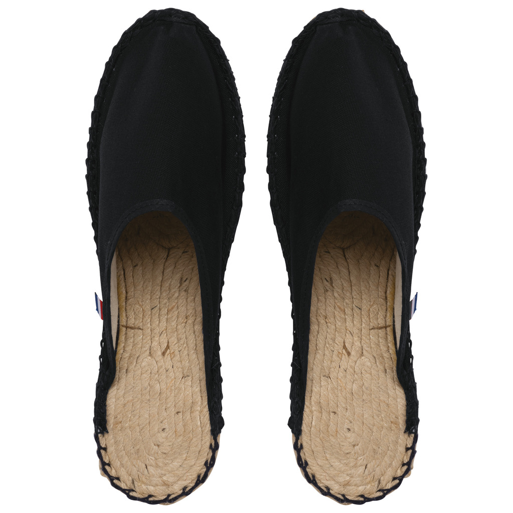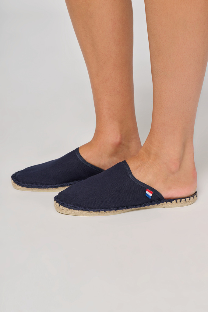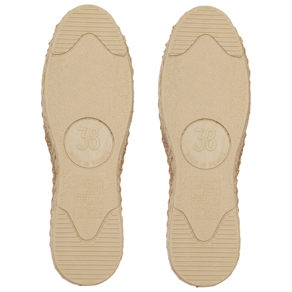 Lona 100% algodão. Sola de borracha vulcanizada e de juta. Acabamento em viés. Etiqueta tricolor em tecido inserida no viés exterior do lado esquerdo quando calçada. Fabricadas em França.