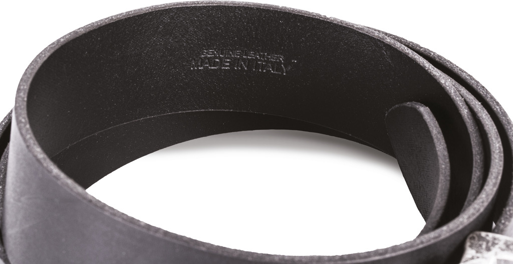 100% couro. Camada em pele de vaca de flor integral com acabamento de anilina. Cinto de corte direito fabricado em Itália. Espessura: 35 mm. Comprimento total do cinto: 125 cm. Regulável do tamanho XS ao XXL, com possibilidade de ser cortado pelo comprimento pretendido, já que a fivela é amovÃvel. Fornecido em bolsa de algodão para facilitar a personalização.