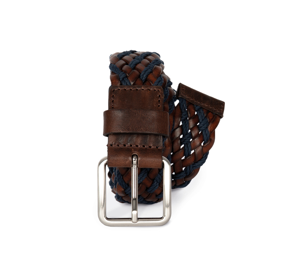Cinto entrelaçado com mistura de algodão e fibras de pele de vaca recicladas com acabamento de anilina com cores em contraste. DisponÃvel em 2 tamanhos, 90 cm e 105 cm, abrangendo, assim, os tamanhos XS ao XXL. Este artigo é fornecido com um pequeno saco de acondicionamento personalizável.