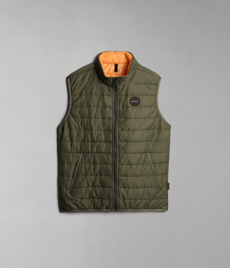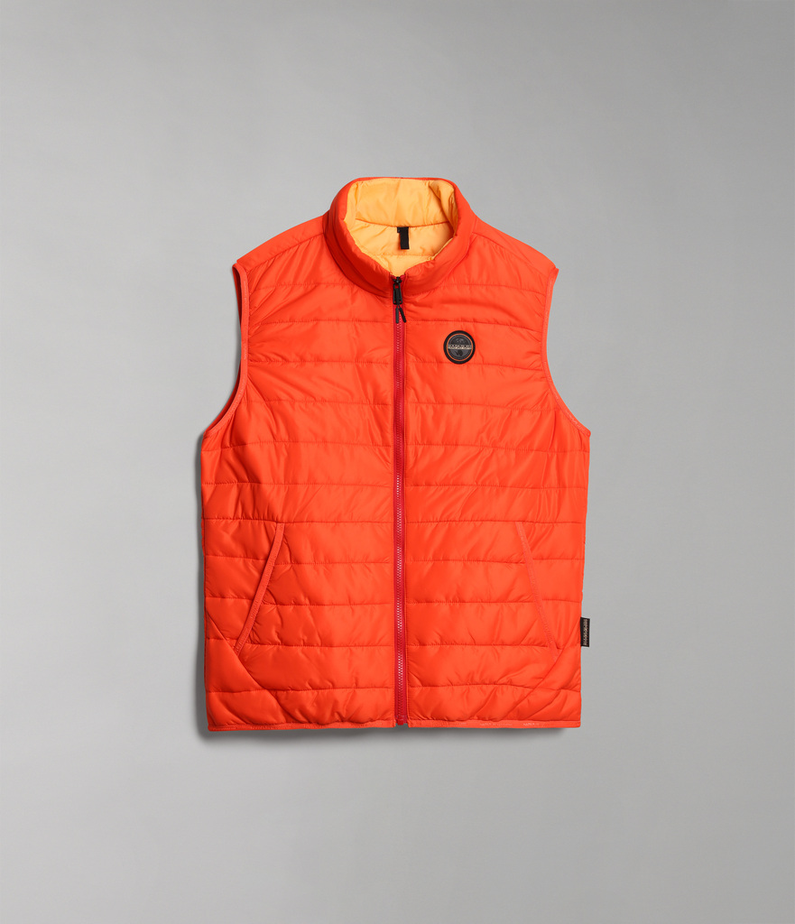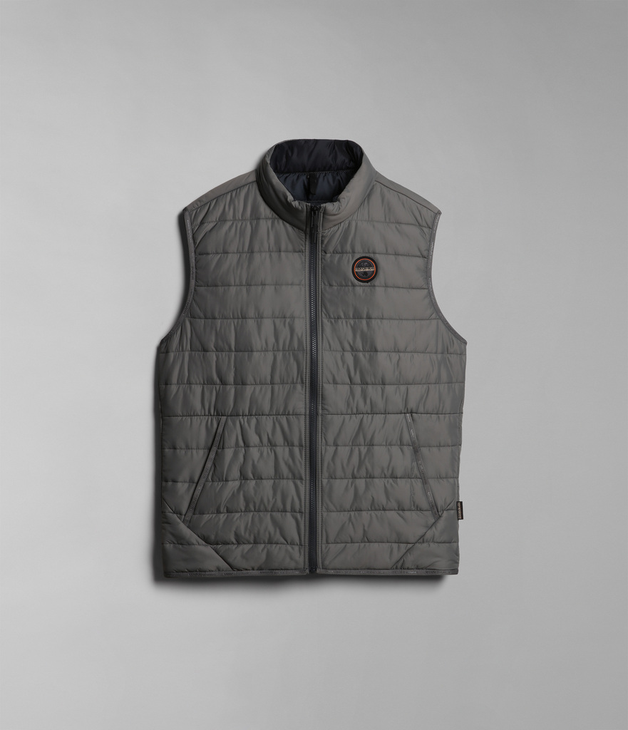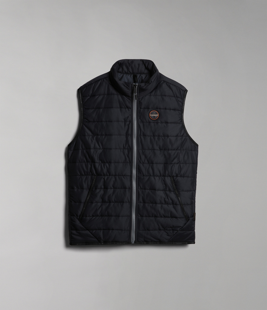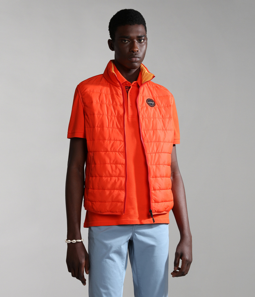 100% poliamida reciclada. Colete integralmente acolchoado com extremidades elásticas e acolchoado sem penas.