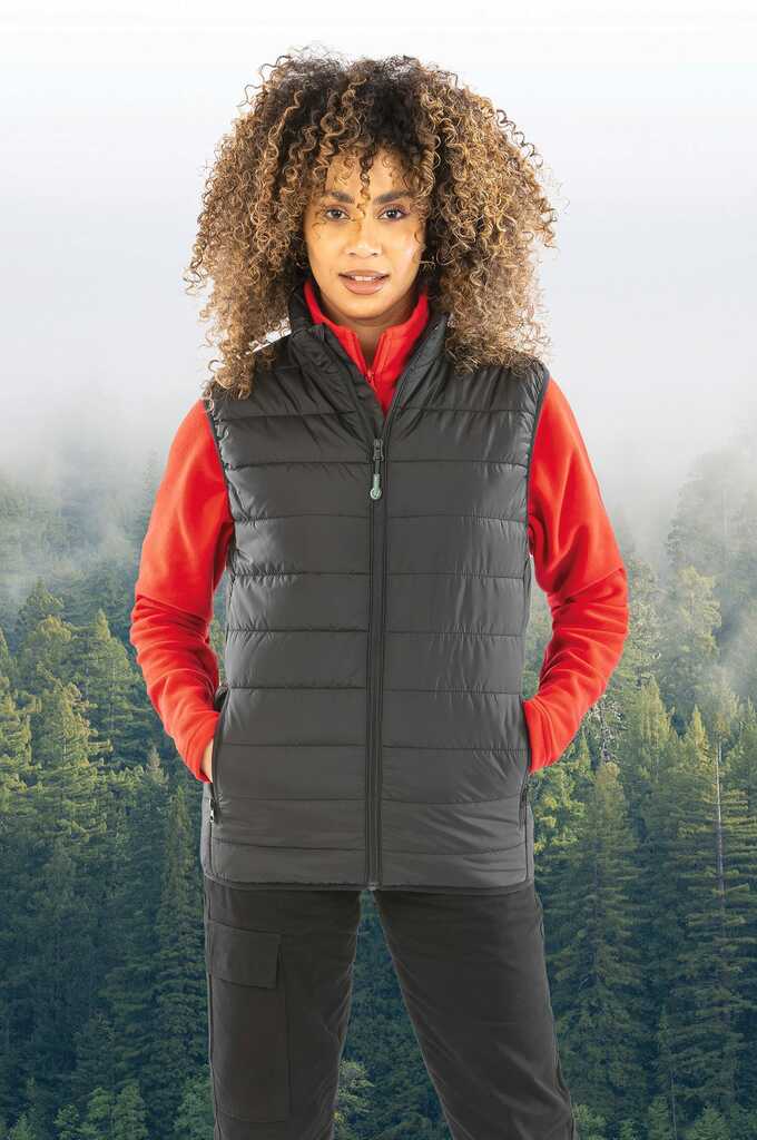 Exterior: 100% poliéster reciclado. 65 g/m². Forro: 100% poliéster reciclado, 160g/m². Fabricados a partir de garrafas em plástico recicladas e de resÃduos pós-industriais. Resistente à água, corta-vento e respirável. Gola subida. Cavas e cintura com acabamento elástico. Fecho na frente com protecção para o queixo. Bolsos laterais com fecho.