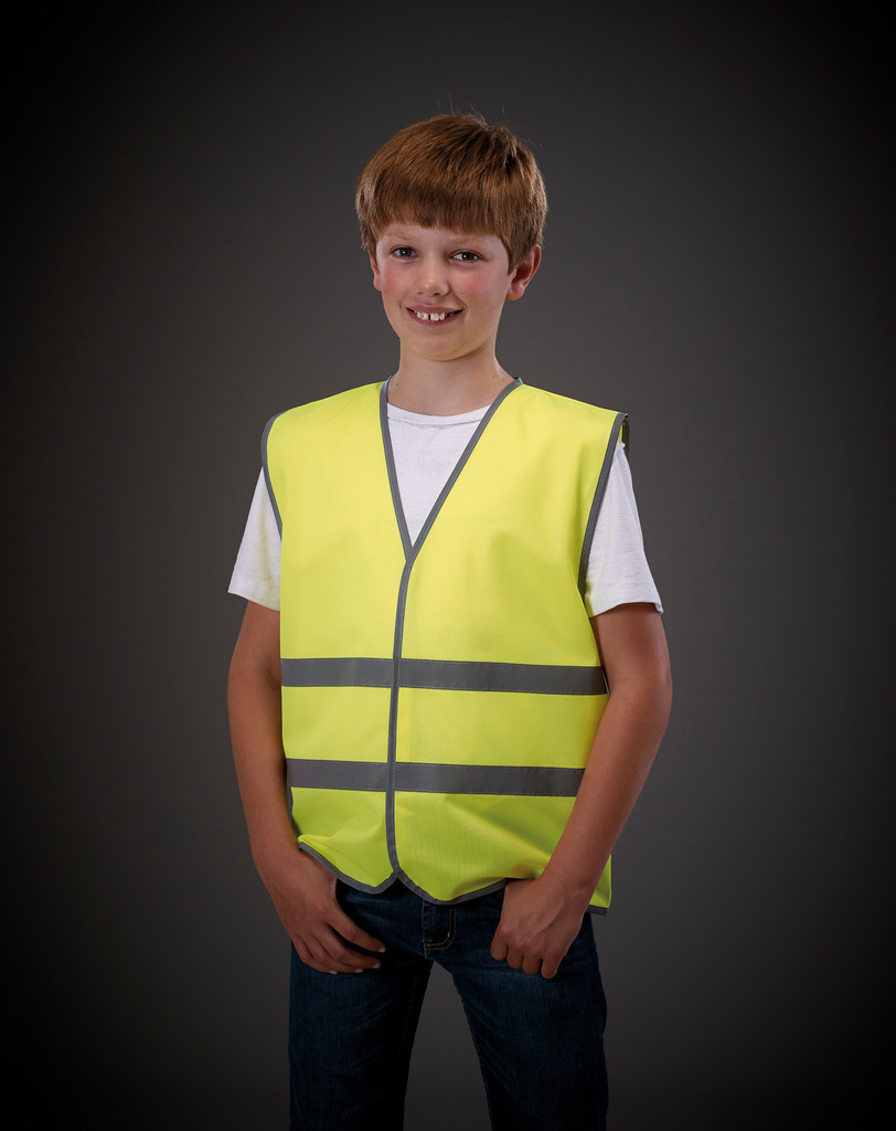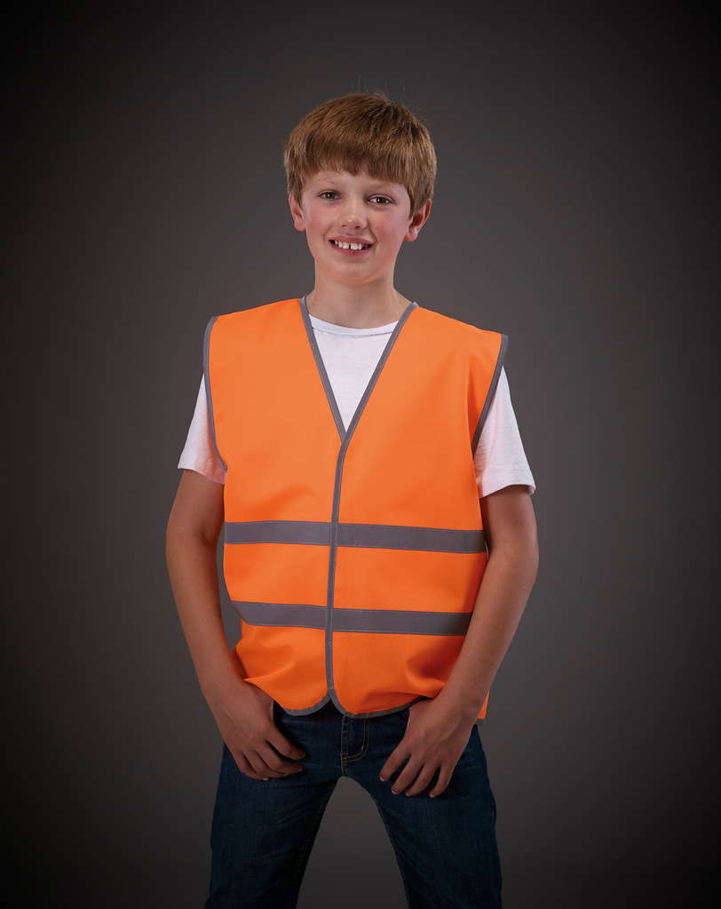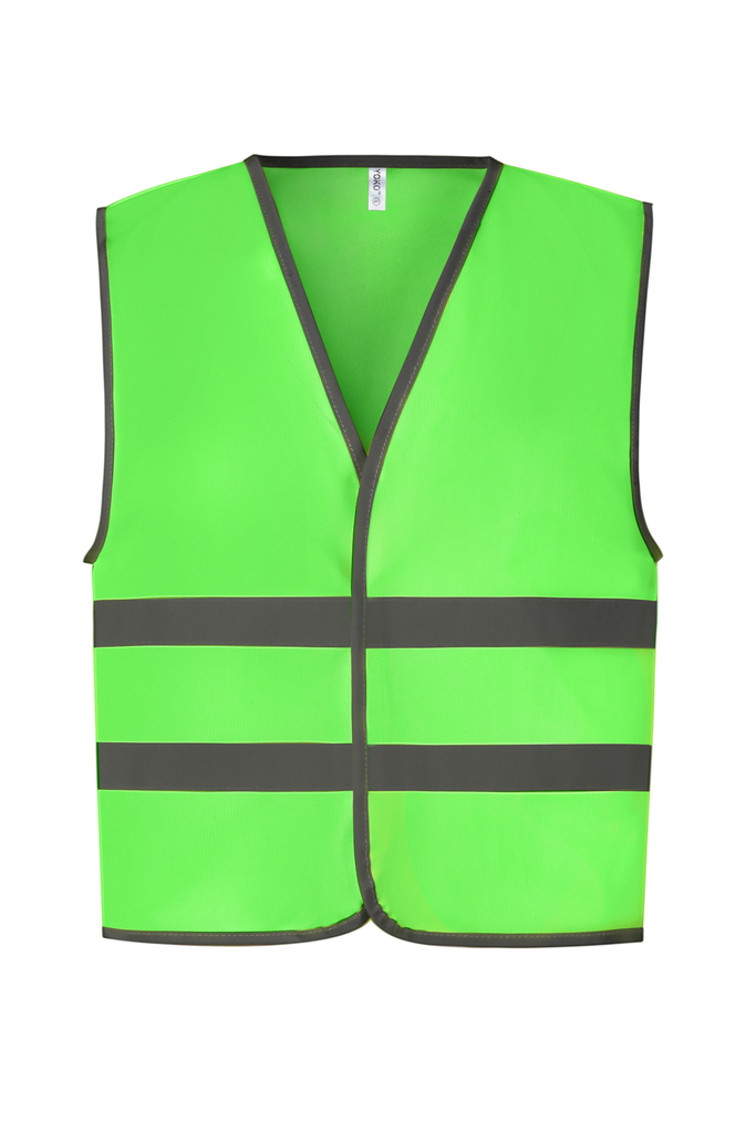 100% poliéster com fecho em Velcro®. Duas faixas/bandas reflectoras com 2,5 cm no corpo. Hi Vis Yellow e Hi Vis Orange em conformidade com a norma EN1150:1999.