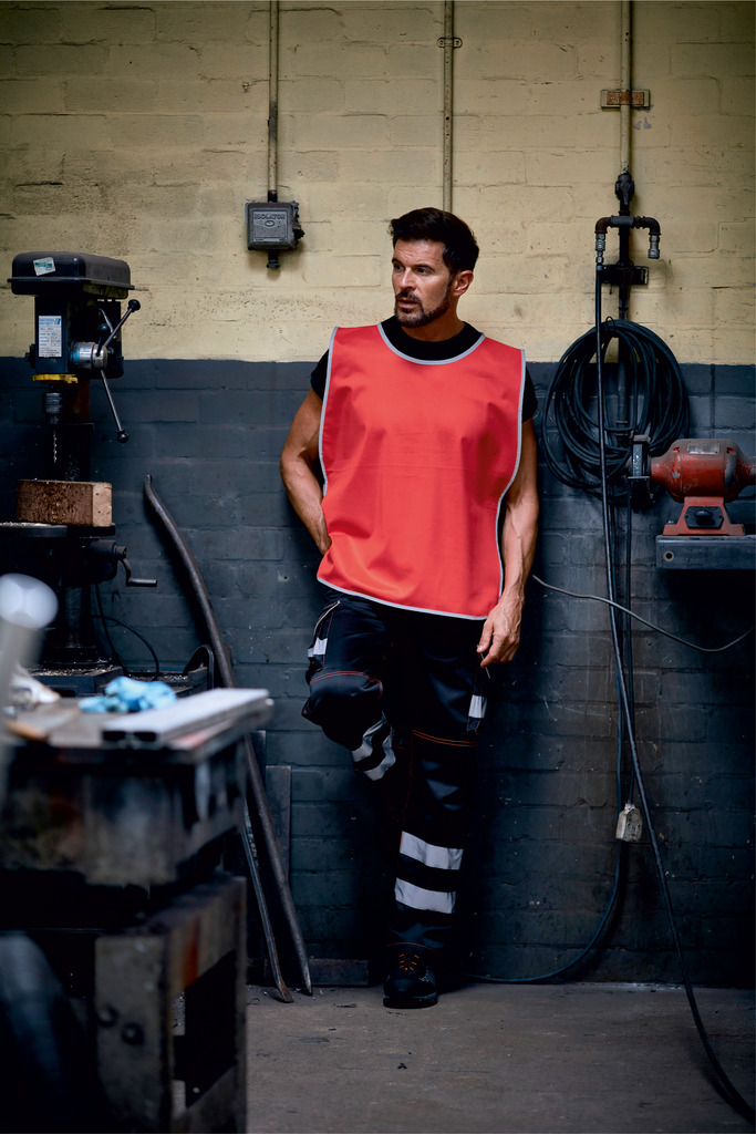 100% poliéster. Acabamento retrorreflector. Elástico e Velcro® com 10 cm de ambos os lados. Grande superfÃcie para personalização nas partes frontal e traseira.