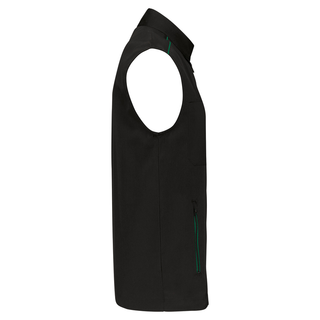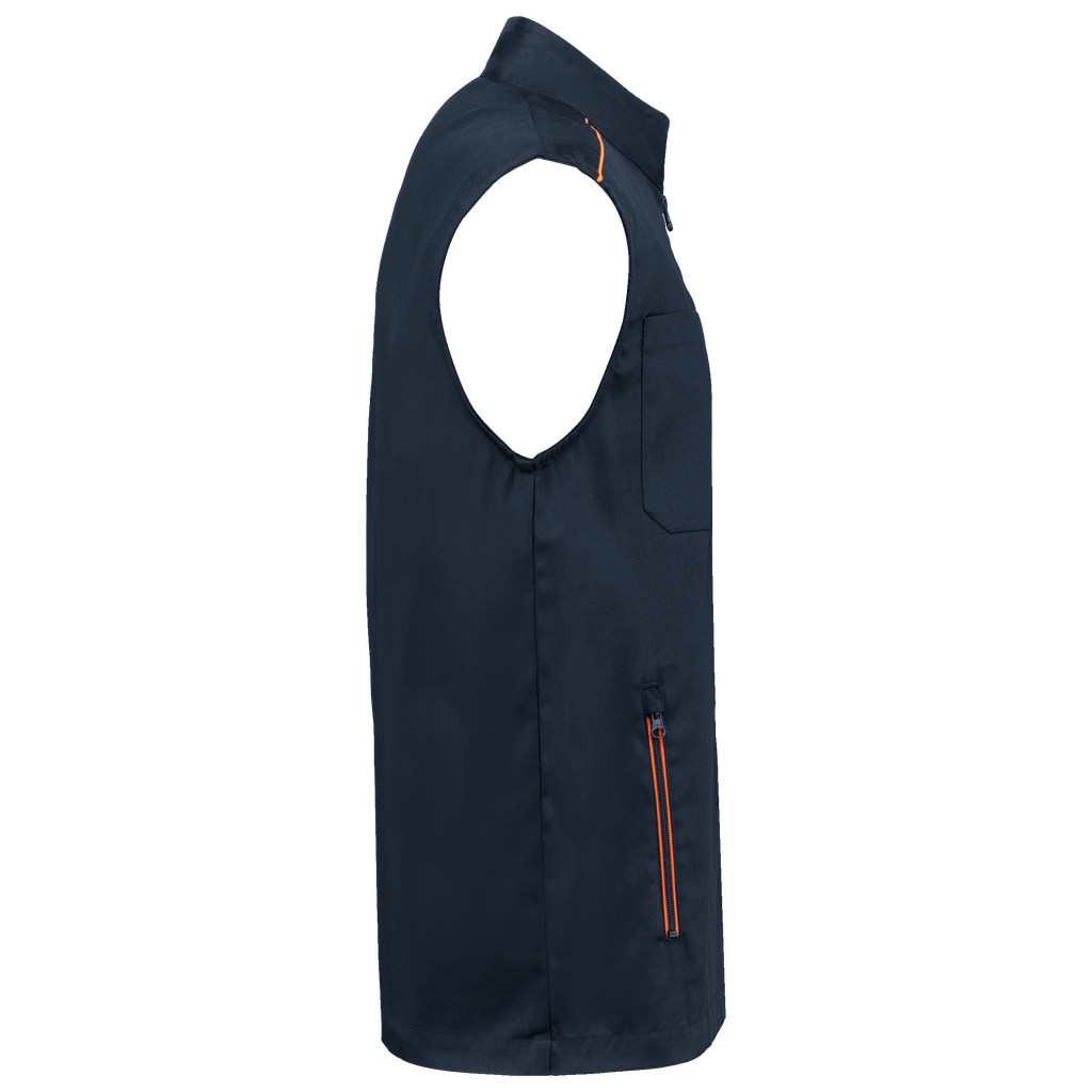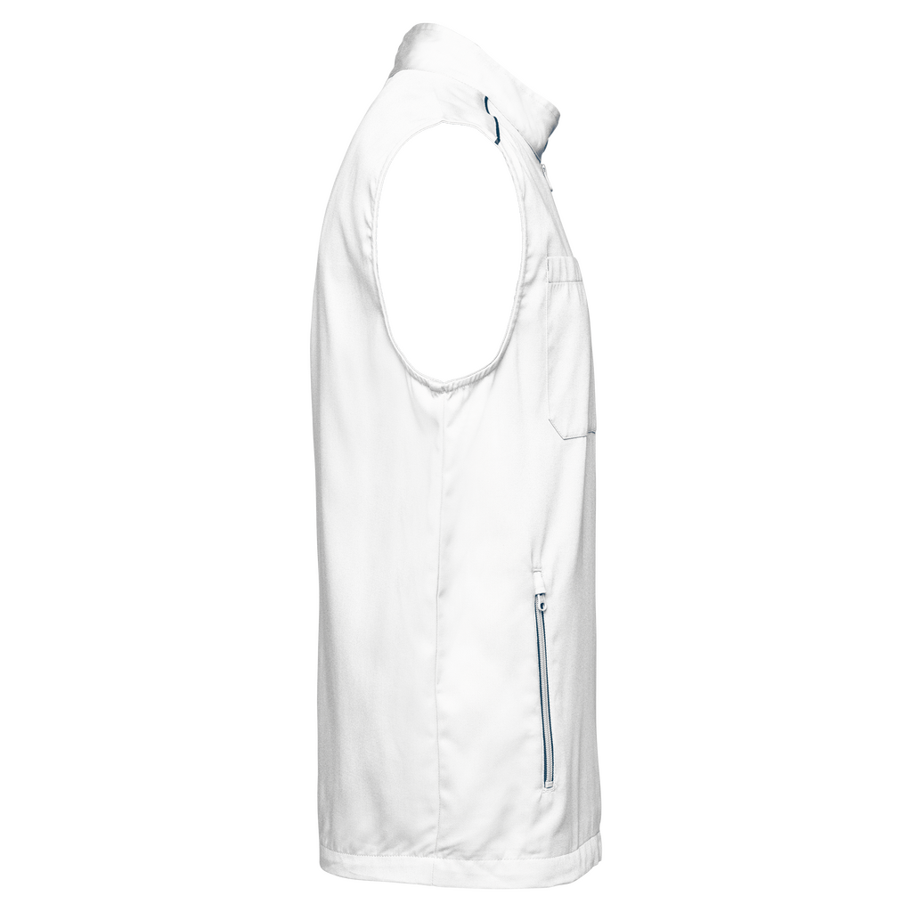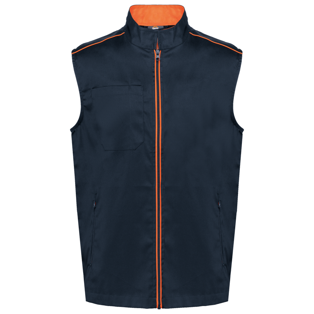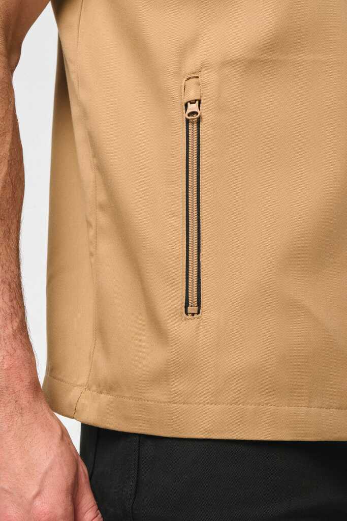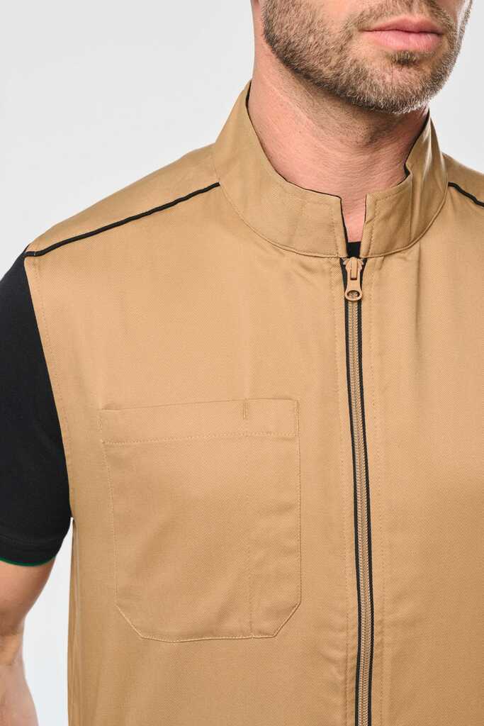 65% poliéster/35% algodão. Lavável a 60°C. 2 bolsos laterais com fecho. 1 bolso no peito direito com porta canetas. 1 etiqueta para nome no interior. Fecho frontal e bolsos em contraste. Detalhe em contraste nos ombros. Interior do decote em contraste com presilha para pendurar. Ideal para um uso diário.