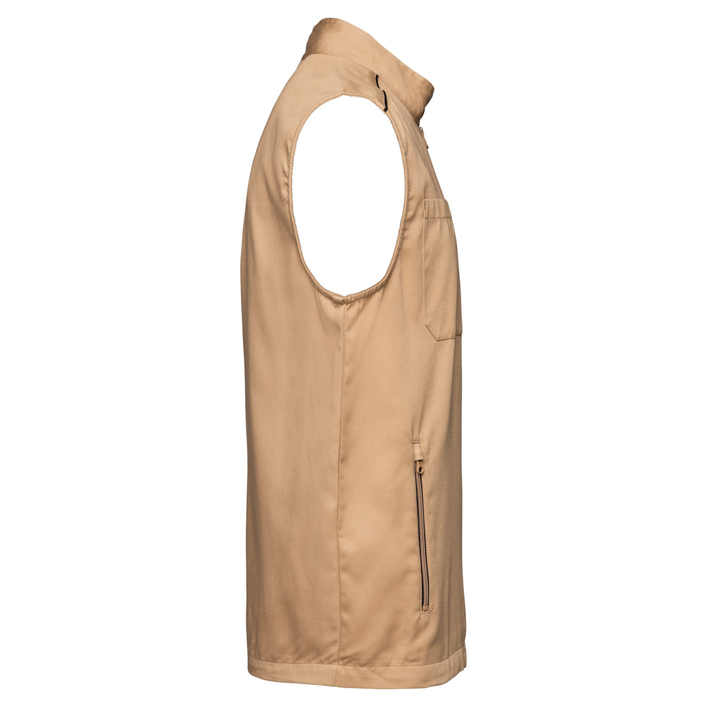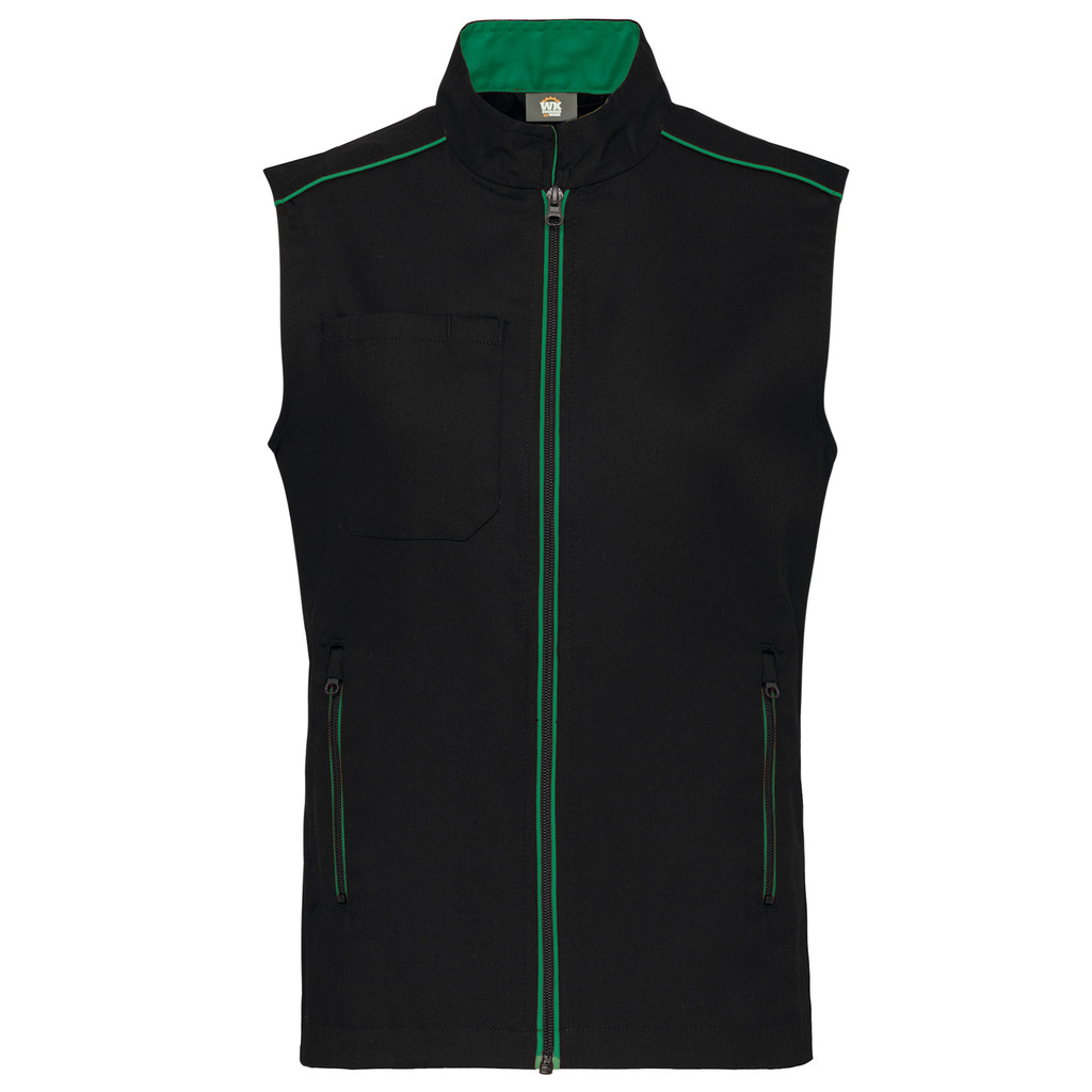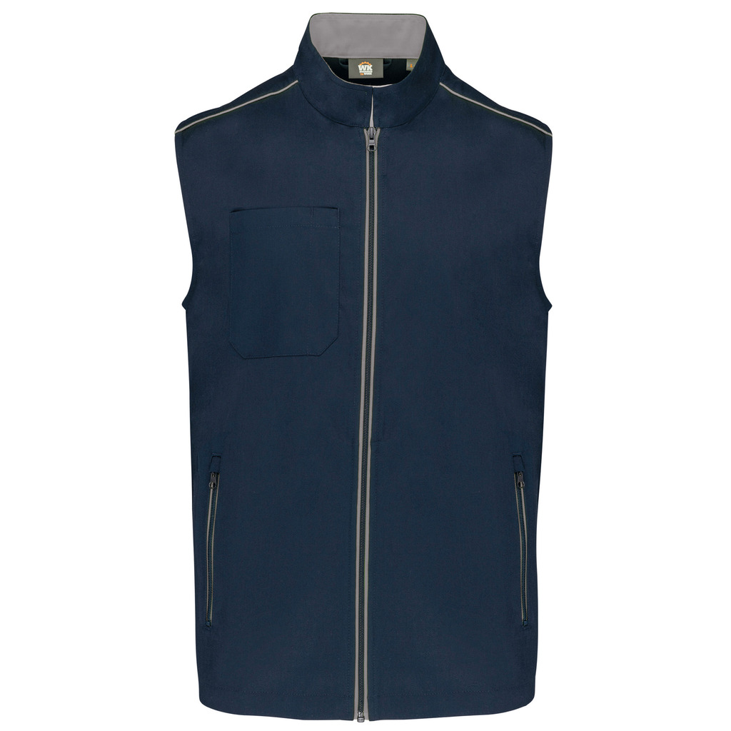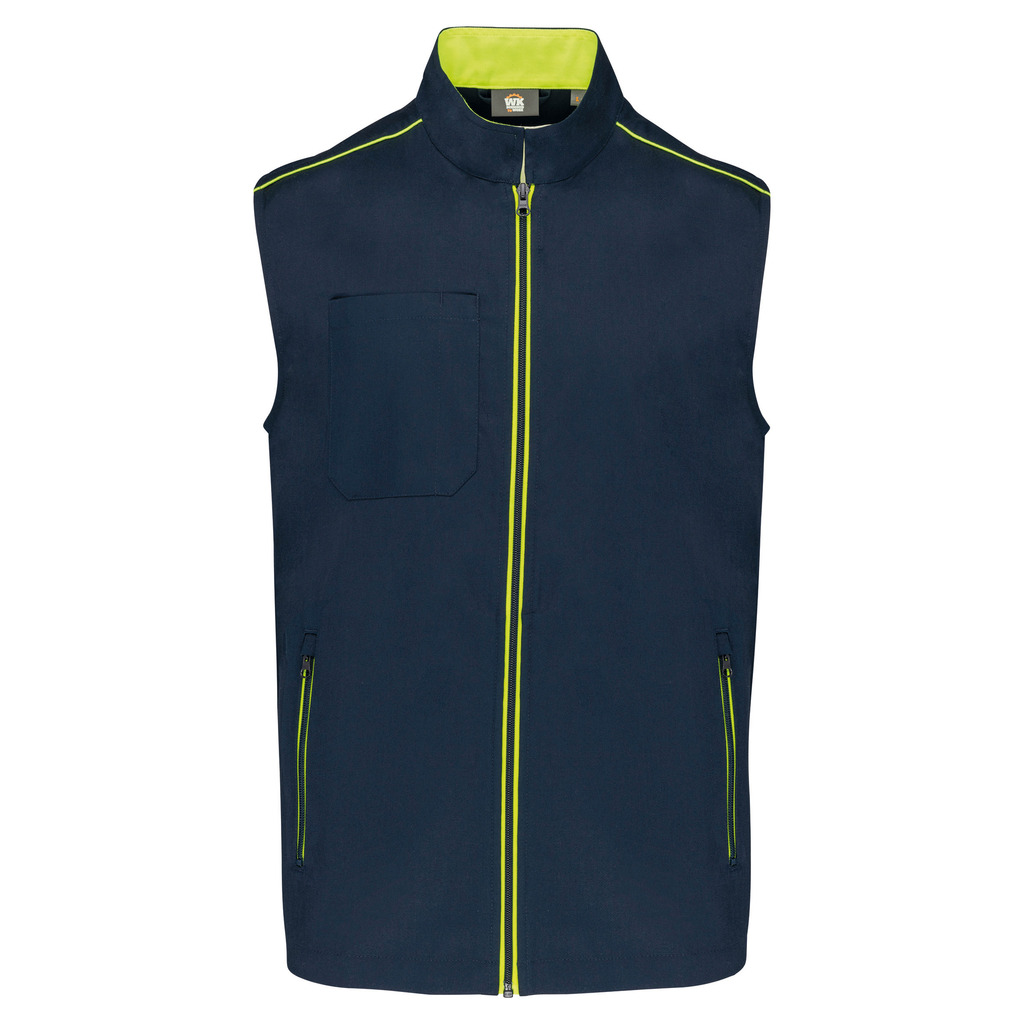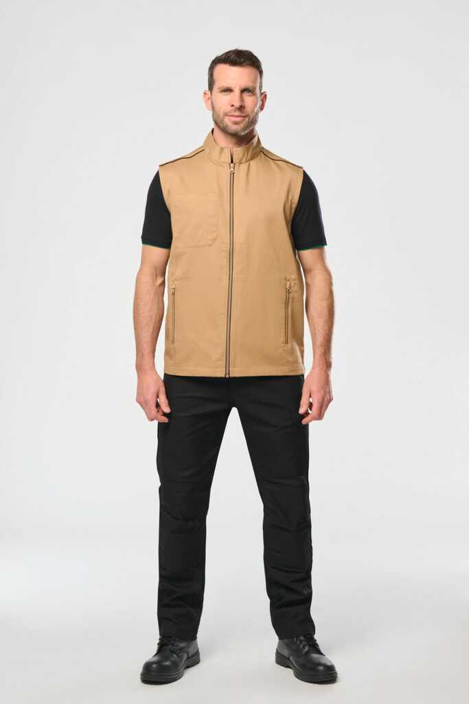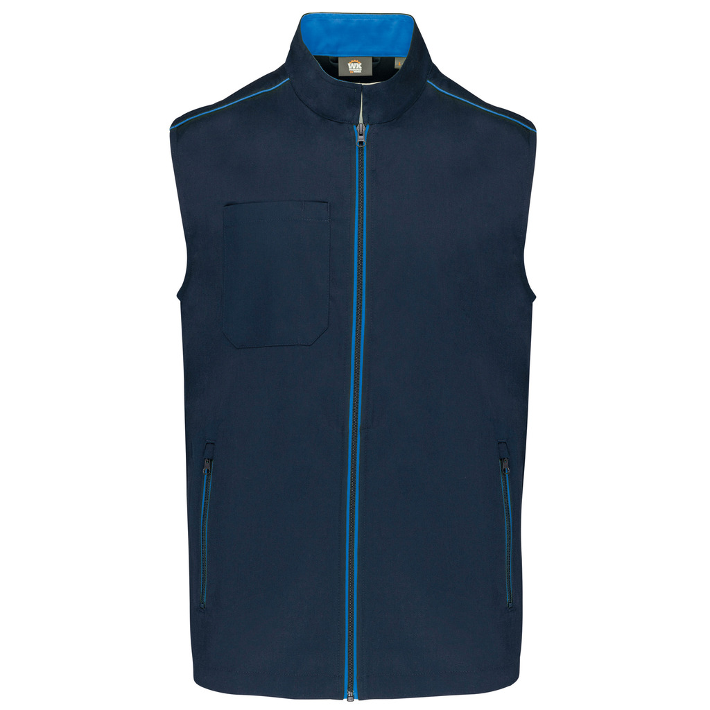 65% poliéster/35% algodão. Lavável a 60°C. 2 bolsos laterais com fecho. 1 bolso no peito direito com porta canetas. 1 etiqueta para nome no interior. Fecho frontal e bolsos em contraste. Detalhe em contraste nos ombros. Interior do decote em contraste com presilha para pendurar. Ideal para um uso diário.
