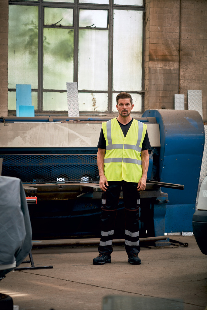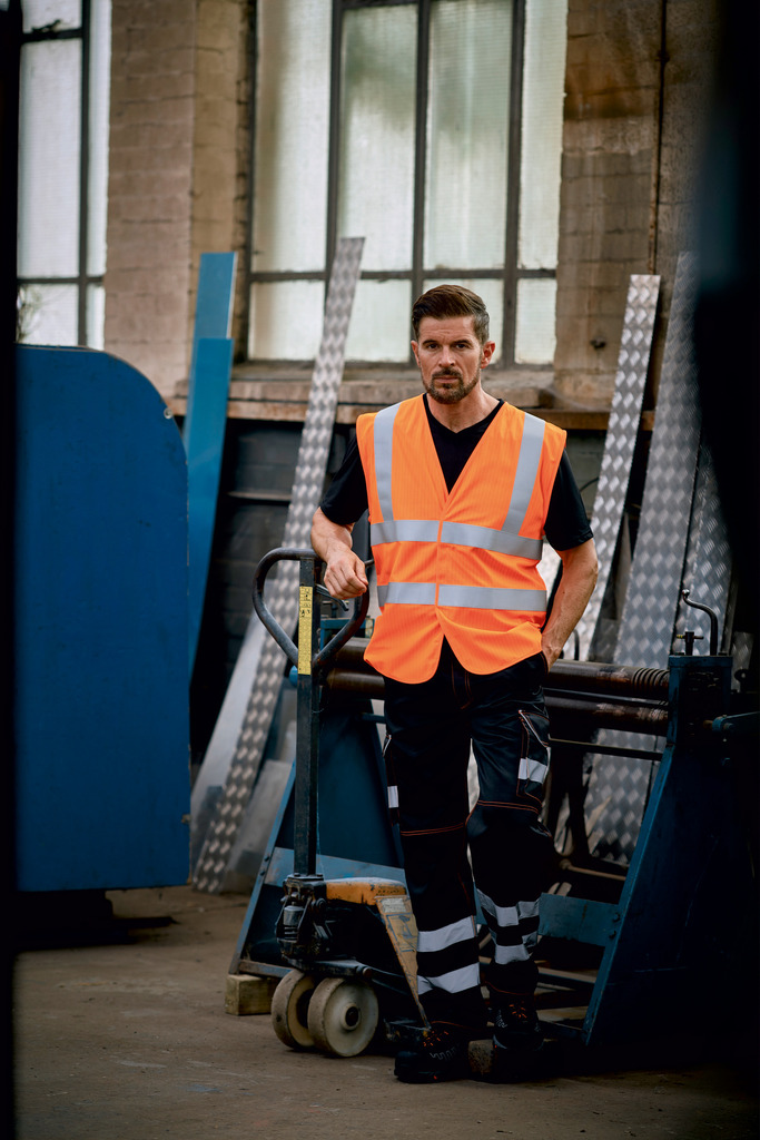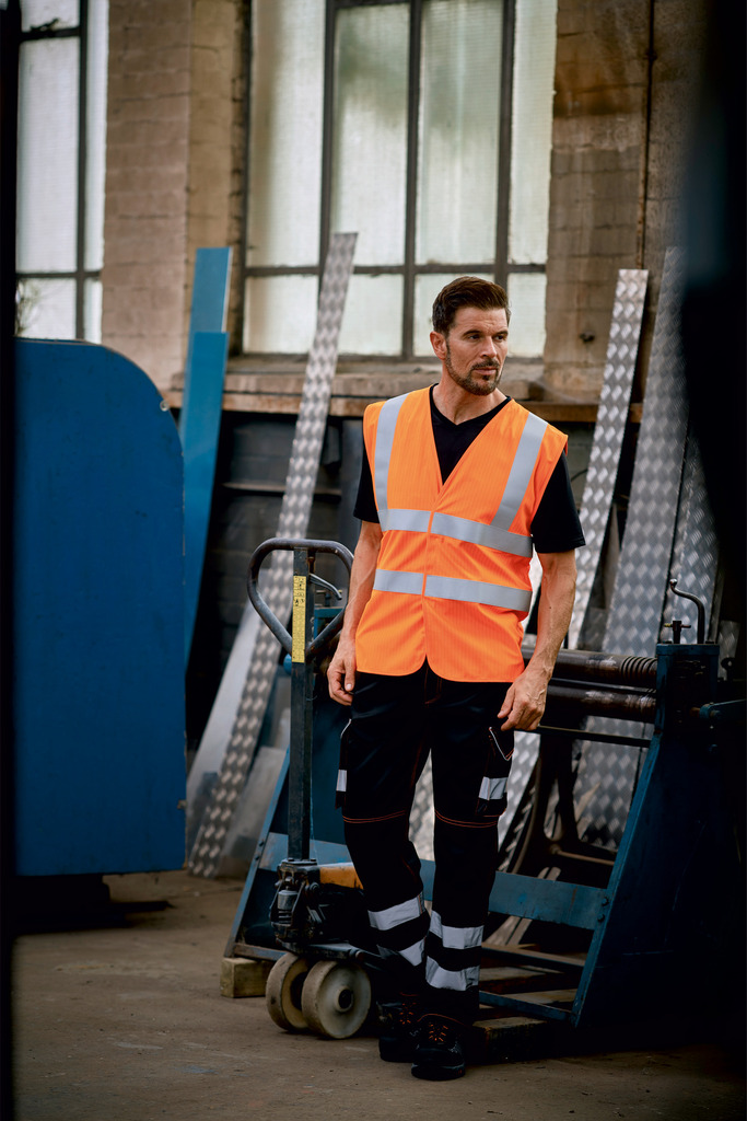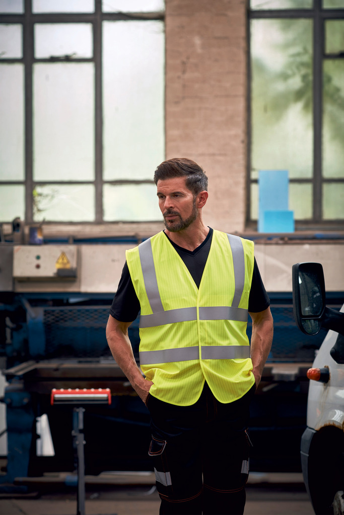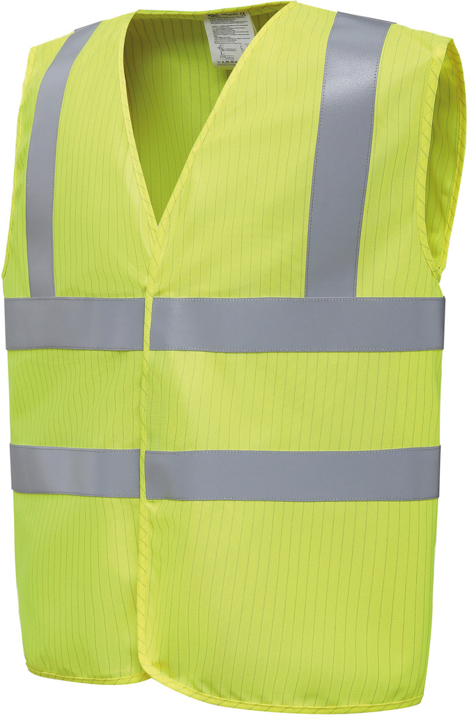 100% em malha poliéster. Duas bandas reflectoras com 5 cm no corpo e nos ombros. Fecho em velcro. Em conformidade com as normas ISO 20471 Classe 2, EN 14116 Index 1 (resistente às chamas e protecção contra o calor) e EN 1149 (protecção antiestática).