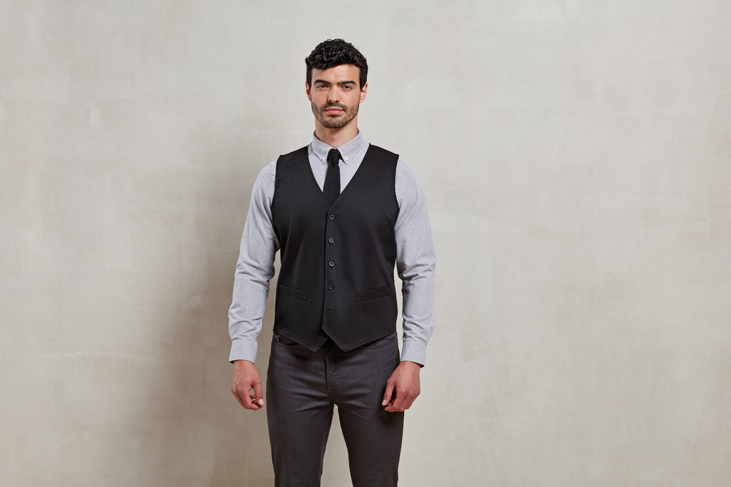 65% poliéster / 35% sarja de algodão. Colete com 5 botões. 2 bolsos frontais. Lavagem doméstica a 60 °C.