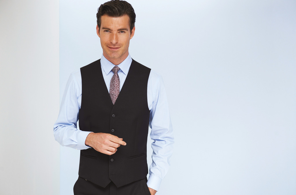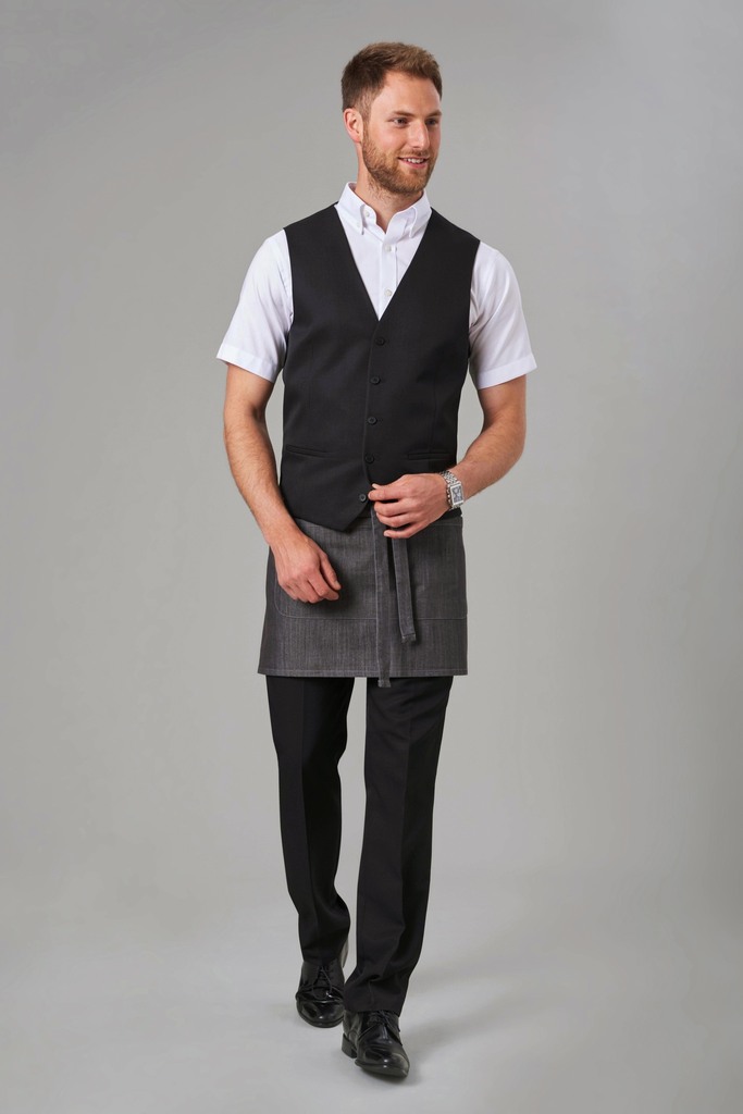 Colete com 5 botões e 2 bolsos, com costas em cetim regulável.