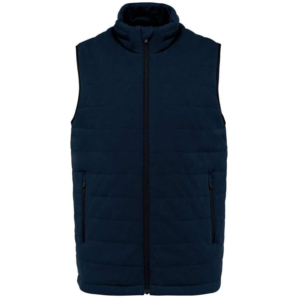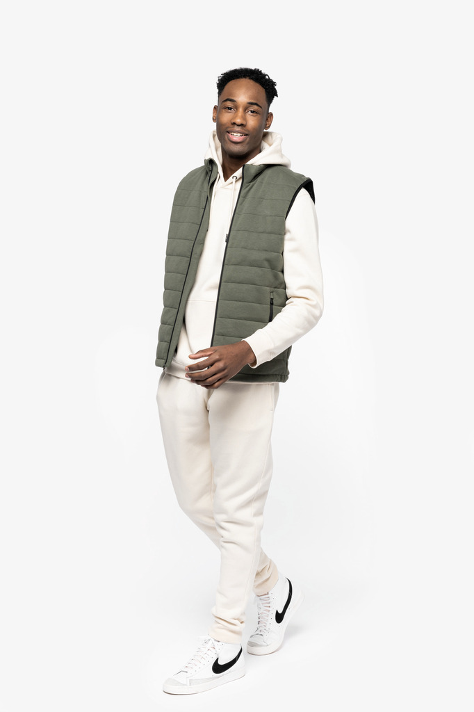 70% algodão biológico / 30% poliéster reciclado pós-consumo. Corte justo. Malha interlock. Gola subida. Patch e fecho de personalização. Fecho frontal invertido em contraste Noir em nylon reciclado e bolsos laterais com puxador em metal reciclado. Forro em contraste Black. Bolso interior. Acabamento debruado nas cavas. Espaço no cimo das costas sem pesponto para facilitar a personalização.