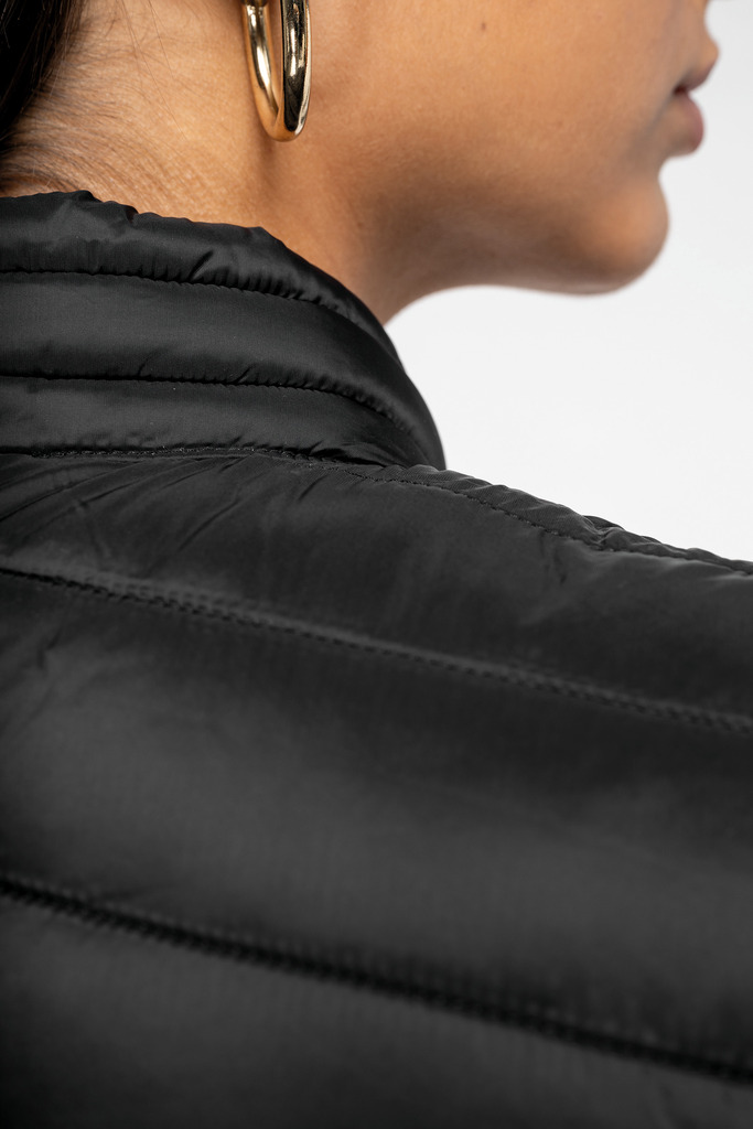 100% poliamida reciclada. Enchimento com efeito de penas em 50% Sorona® e 50% poliéster reciclado. Corte direito ligeiramenta cintado. Gola subida. Toque suave e liso. Tecido repelente à água nÃvel 4 e corta-vento 4 mm/s. Fechos em plástico reciclado tom sobre tom. Dois bolsos laterais com fecho invisÃvel em nylon reciclado. Dois bolsos interiores. Encaixes nos ombros e nas laterais. Ligeiramente mais comprido à frente do que nas costas. Entregue com saco para guardar. Largura entre os pespontos na frente e nas costas: 4,5 cm; meio das costas: 9,5 cm.