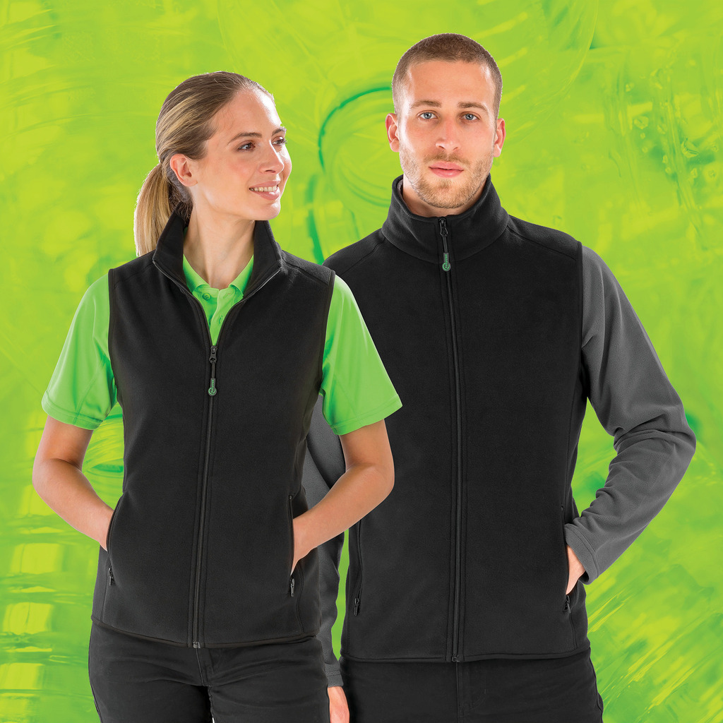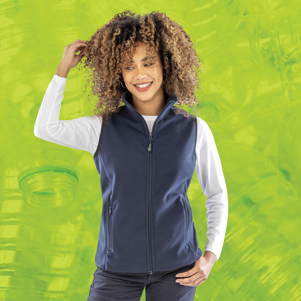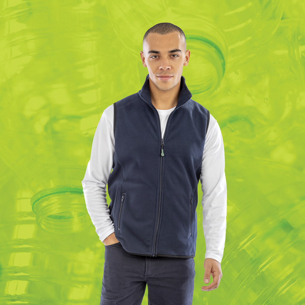 100% poliéster reciclado. Fecho ecológico YKK NATULON na frente e nos bolsos. Cavas e bainhas com acabamento flexÃvel. Bolsos laterais forrados com polar. Pesponto decorativo no tronco. Presilha para pendurar. Produzido a partir de fios sustentáveis de elevada qualidade, através da utilização de garrafas 100% de plástico PET. Reciclável no fim de vida.