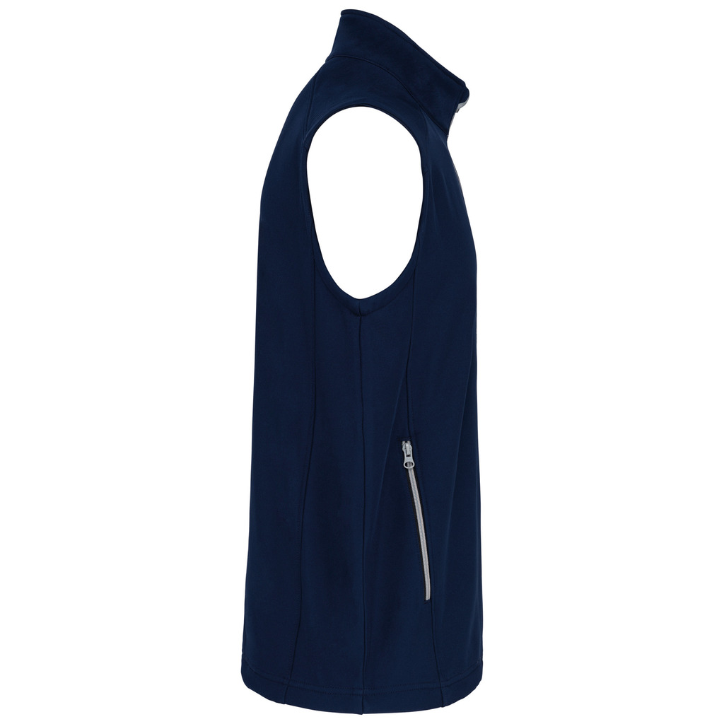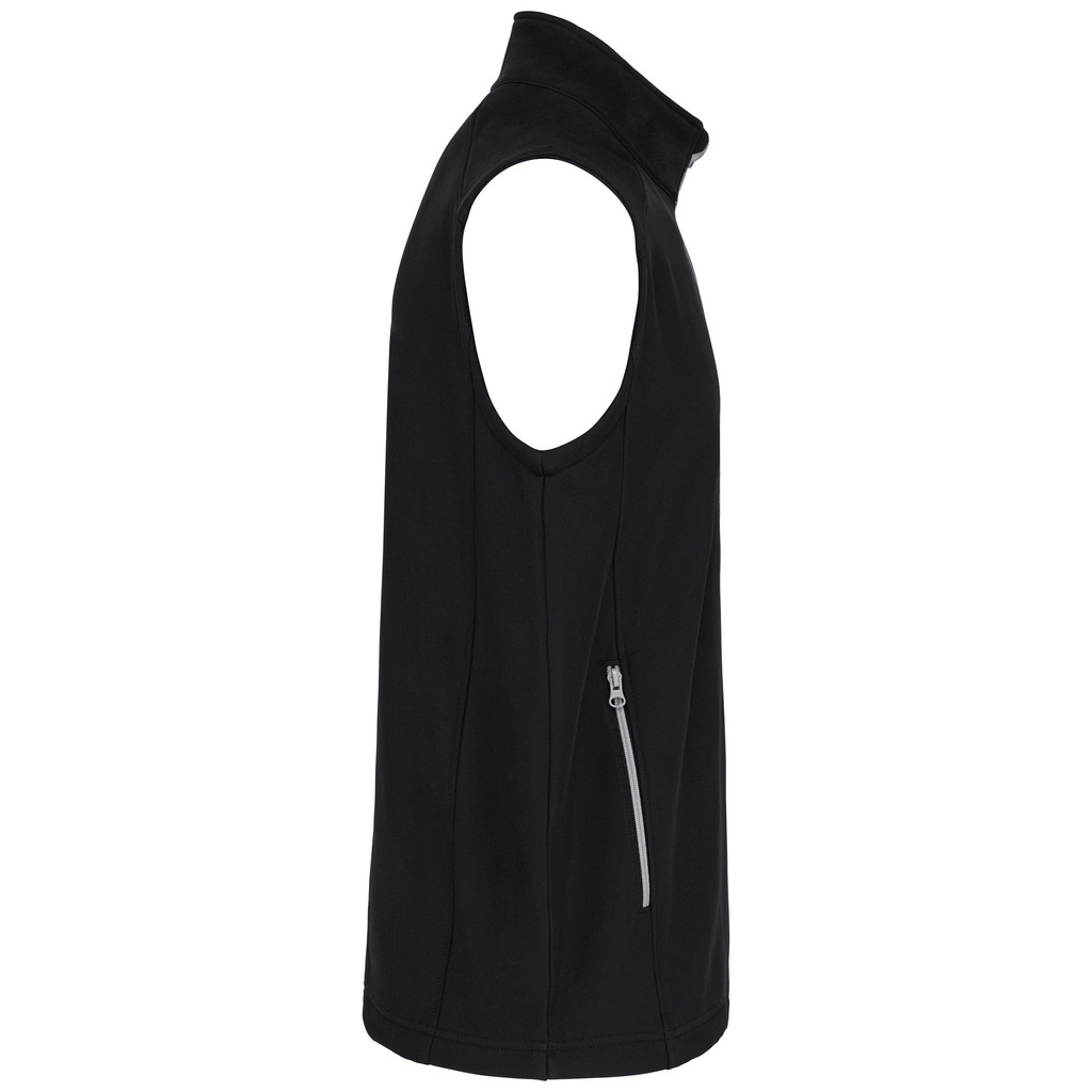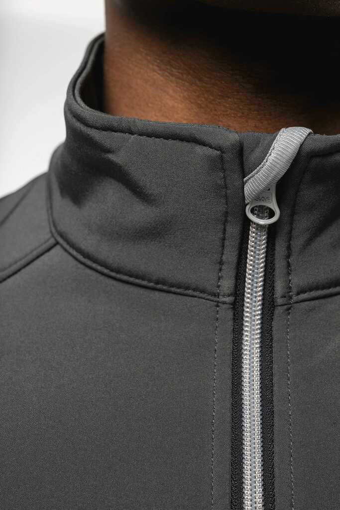 95% poliéster / 5% elastano. Interior: 100% poliéster micropolar. Tecido repelente à água. 2 bolsos exteriores com fecho. Fechos em contraste. Acabamento com pespontos na zona lateral e nos ombros.