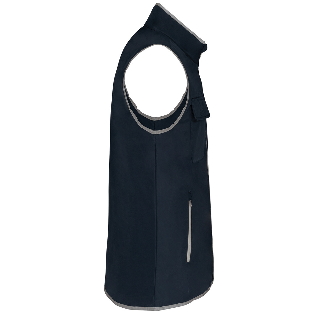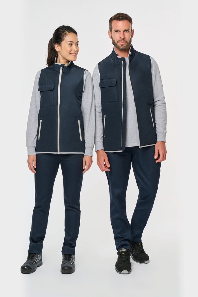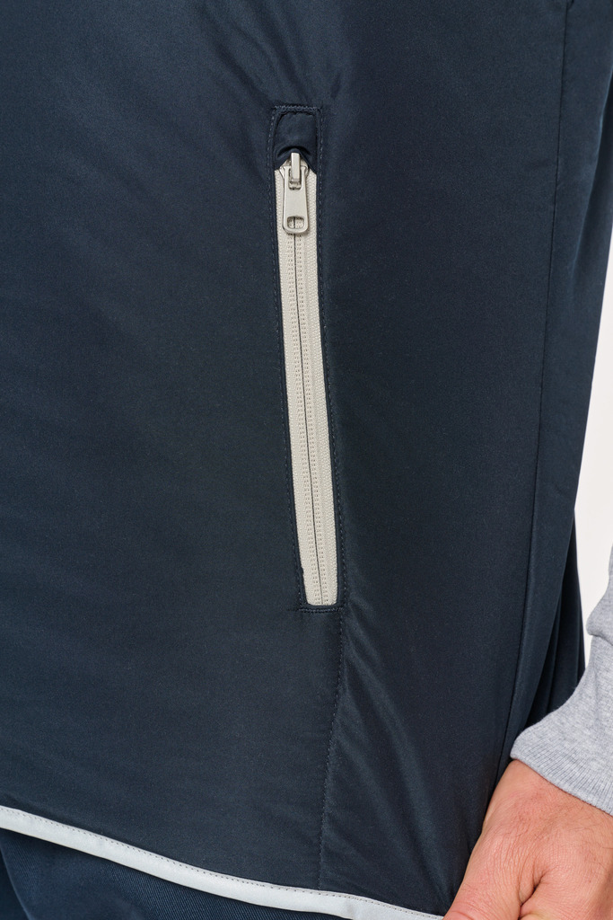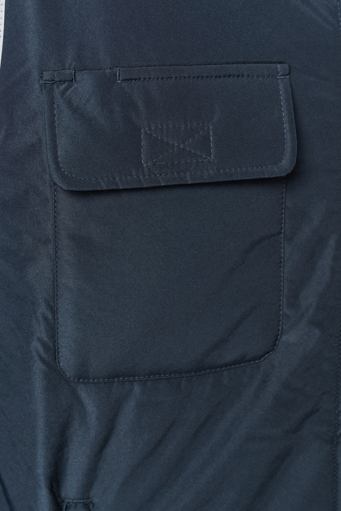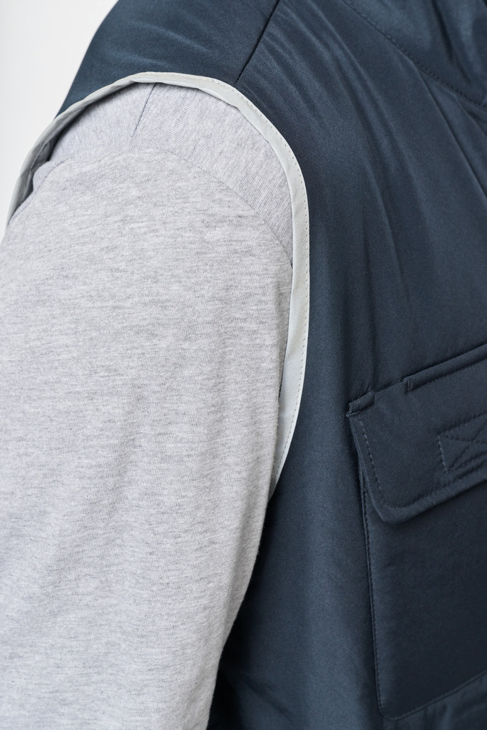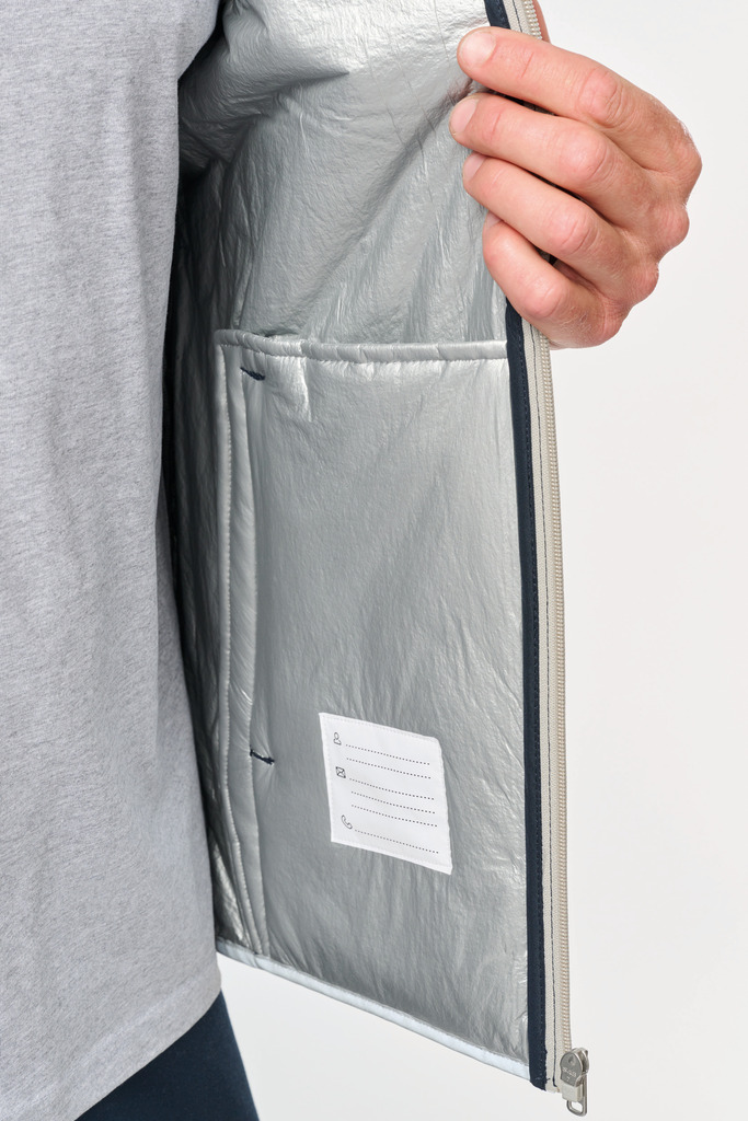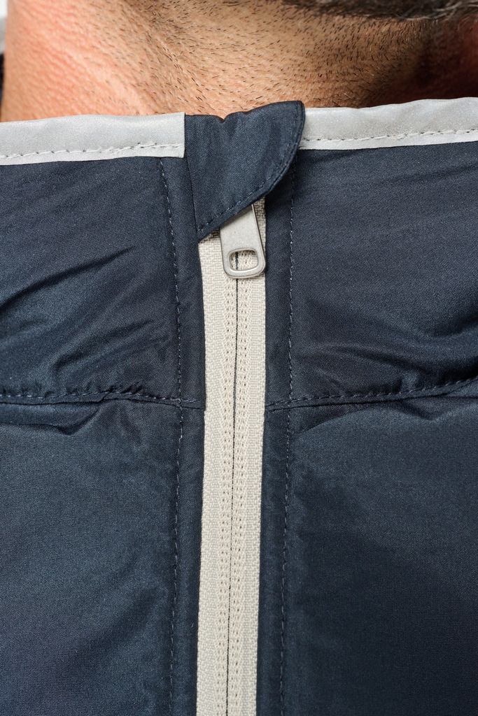 100% poliéster. 4 camadas: exterior em taffeta 240T. Polifios 60 g. Membrana PU prateada no interior. Desempenho técnico: impermeável a 5000 mm e corta-vento a 5000 mm. Resistência térmica (norma ISO 11092-2014) RCT: 0,138 m² k/w. Corte direito. Com fecho em nylon. 2 bolsos laterais com fecho. 1 bolso no peito com pala e espaço para caneta, costura de reforço, fecho em velcro. Recobrimento em tecido prateado no acabamento do decote, das cavas e do cós. 2 grandes bolsos interiores. Etiqueta para identificação no interior da peça. Presilha na gola. Mais comprido nas costas. Etiqueta de marca «tear-away» para facilitar a personalização.