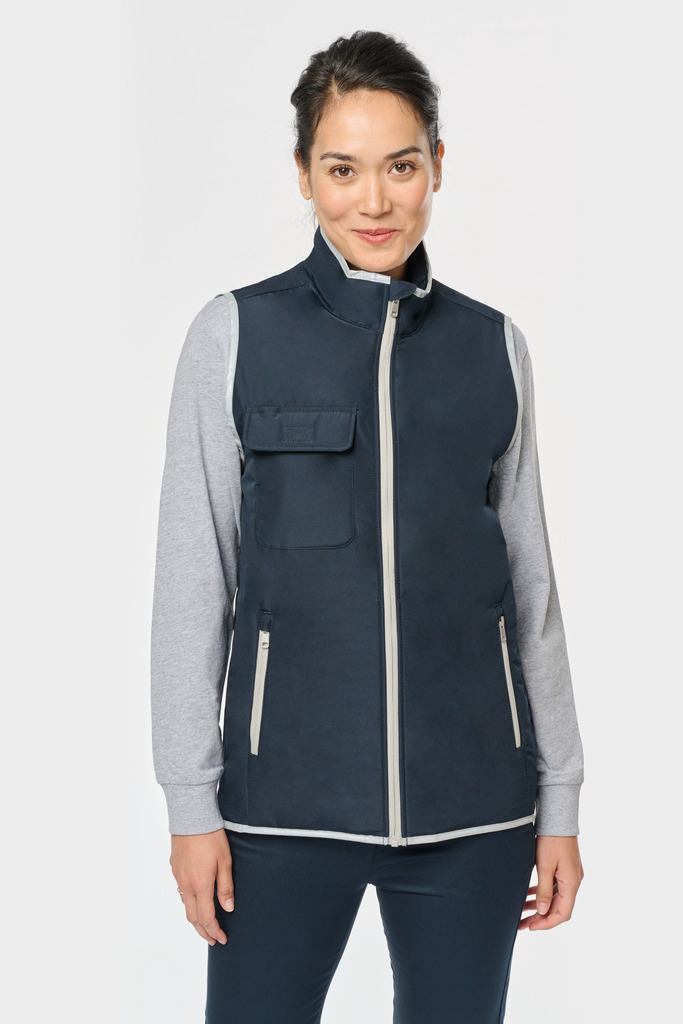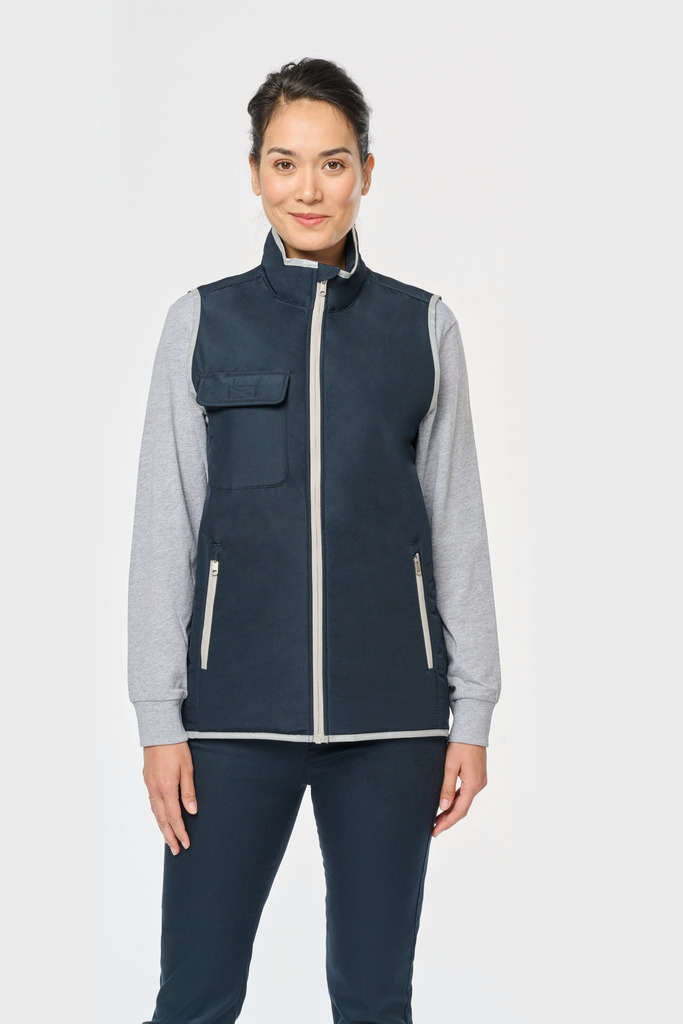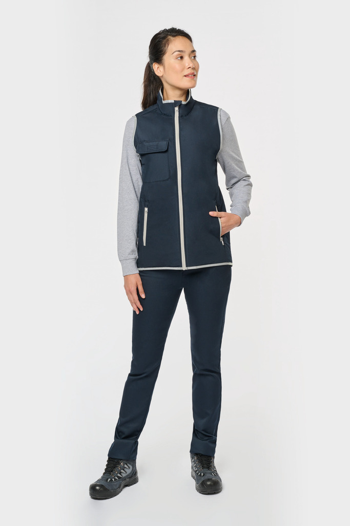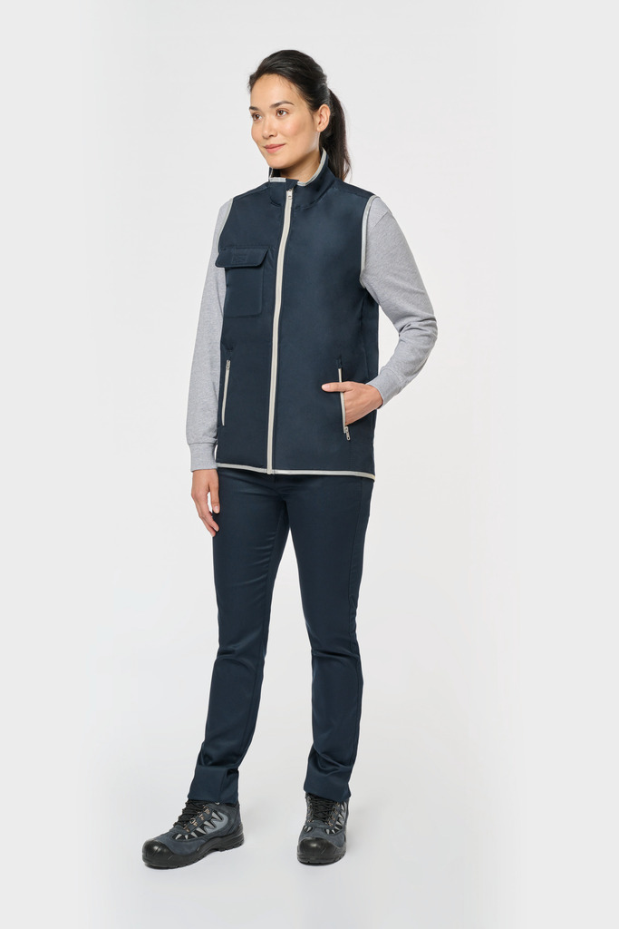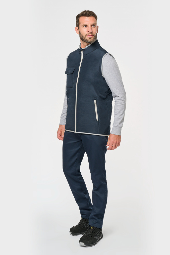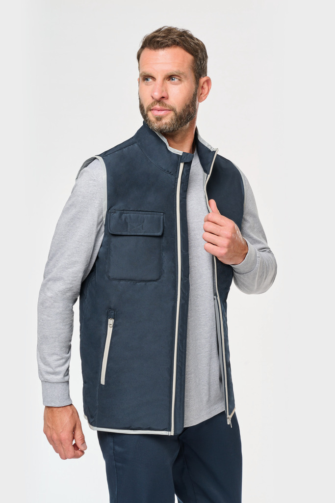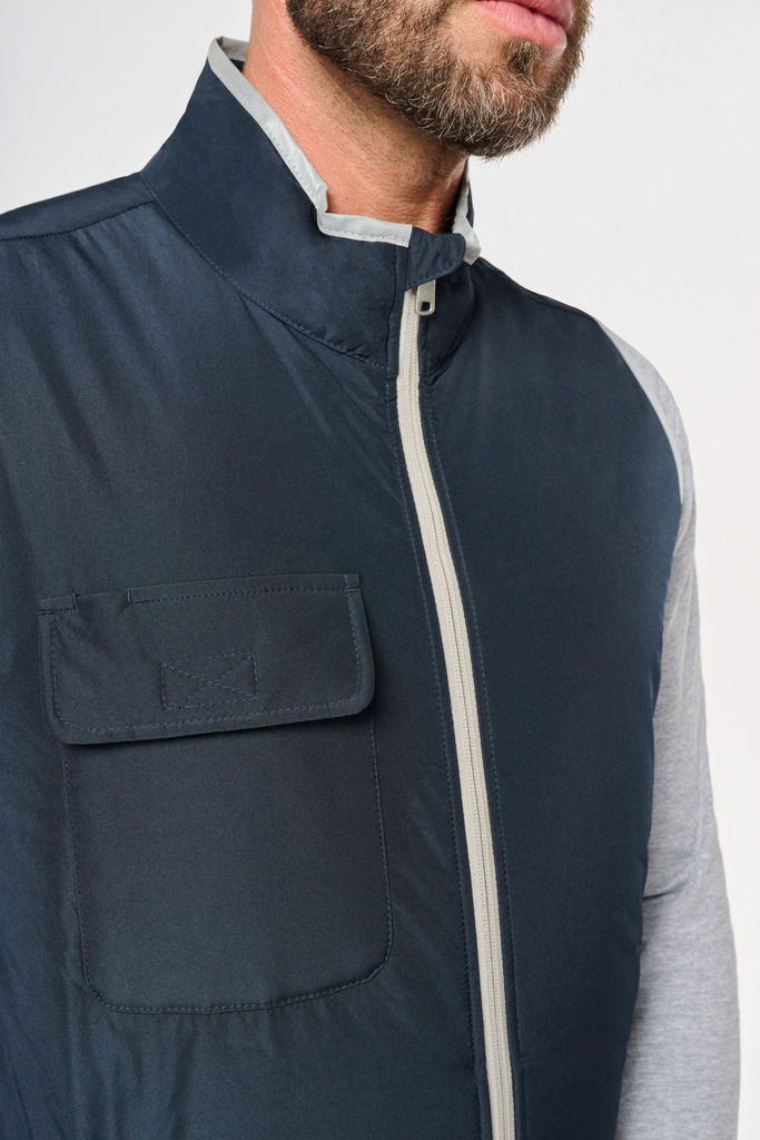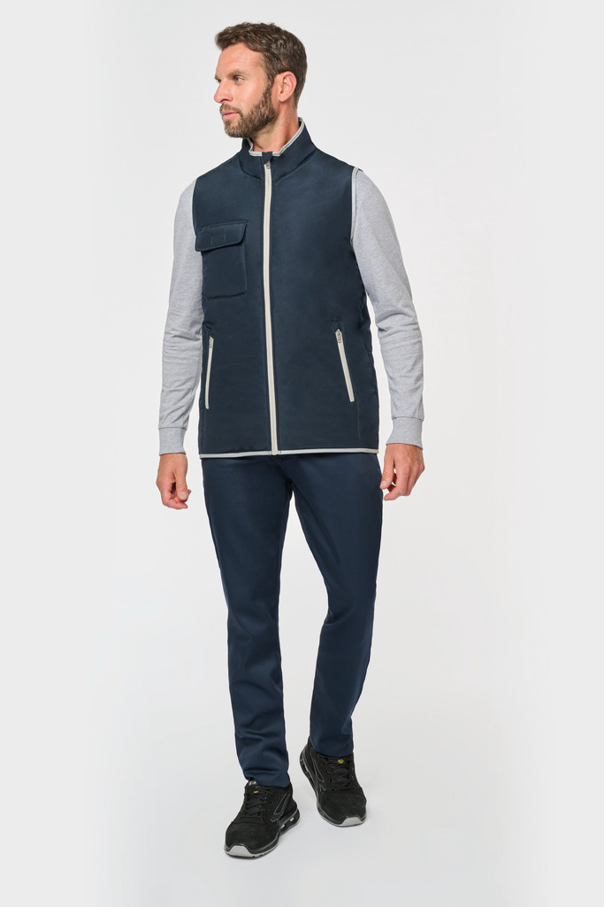 100% poliéster. 4 camadas: exterior em taffeta 240T. Polifios 60 g. Membrana PU prateada no interior. Desempenho técnico: impermeável a 5000 mm e corta-vento a 5000 mm. Resistência térmica (norma ISO 11092-2014) RCT: 0,138 m² k/w. Corte direito. Com fecho em nylon. 2 bolsos laterais com fecho. 1 bolso no peito com pala e espaço para caneta, costura de reforço, fecho em velcro. Recobrimento em tecido prateado no acabamento do decote, das cavas e do cós. 2 grandes bolsos interiores. Etiqueta para identificação no interior da peça. Presilha na gola. Mais comprido nas costas. Etiqueta de marca «tear-away» para facilitar a personalização.