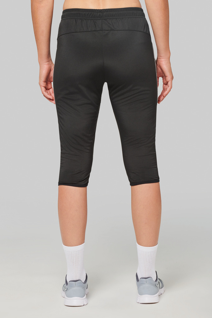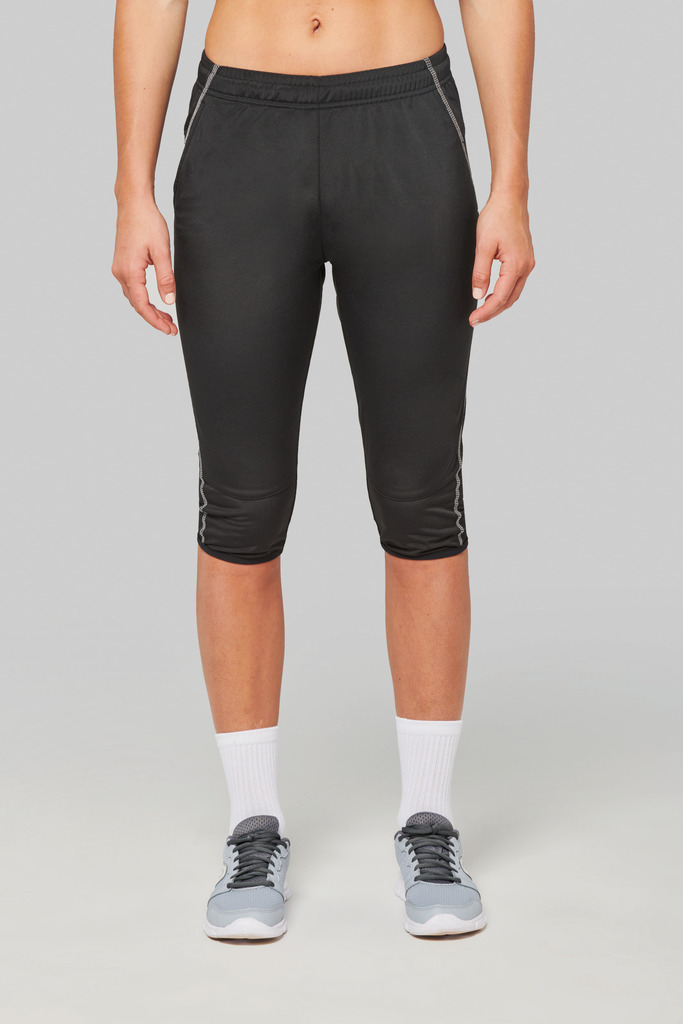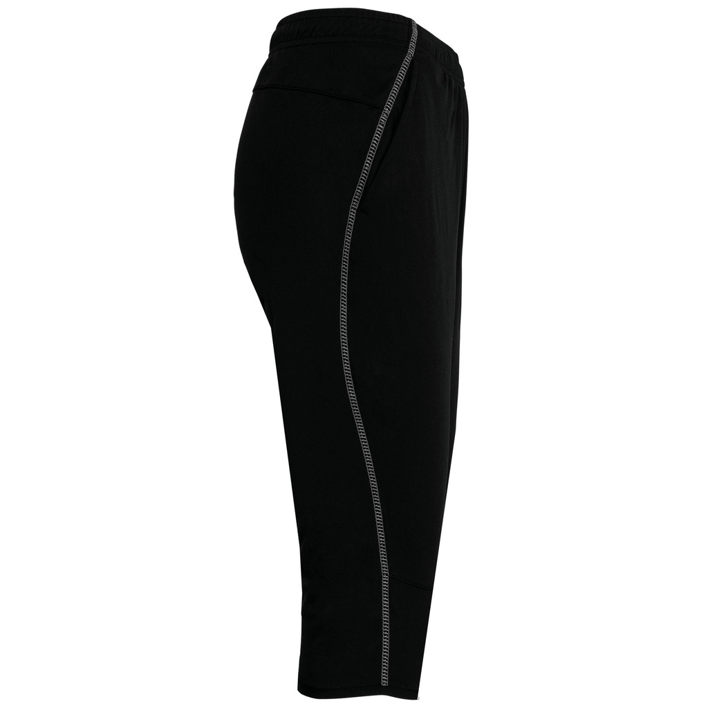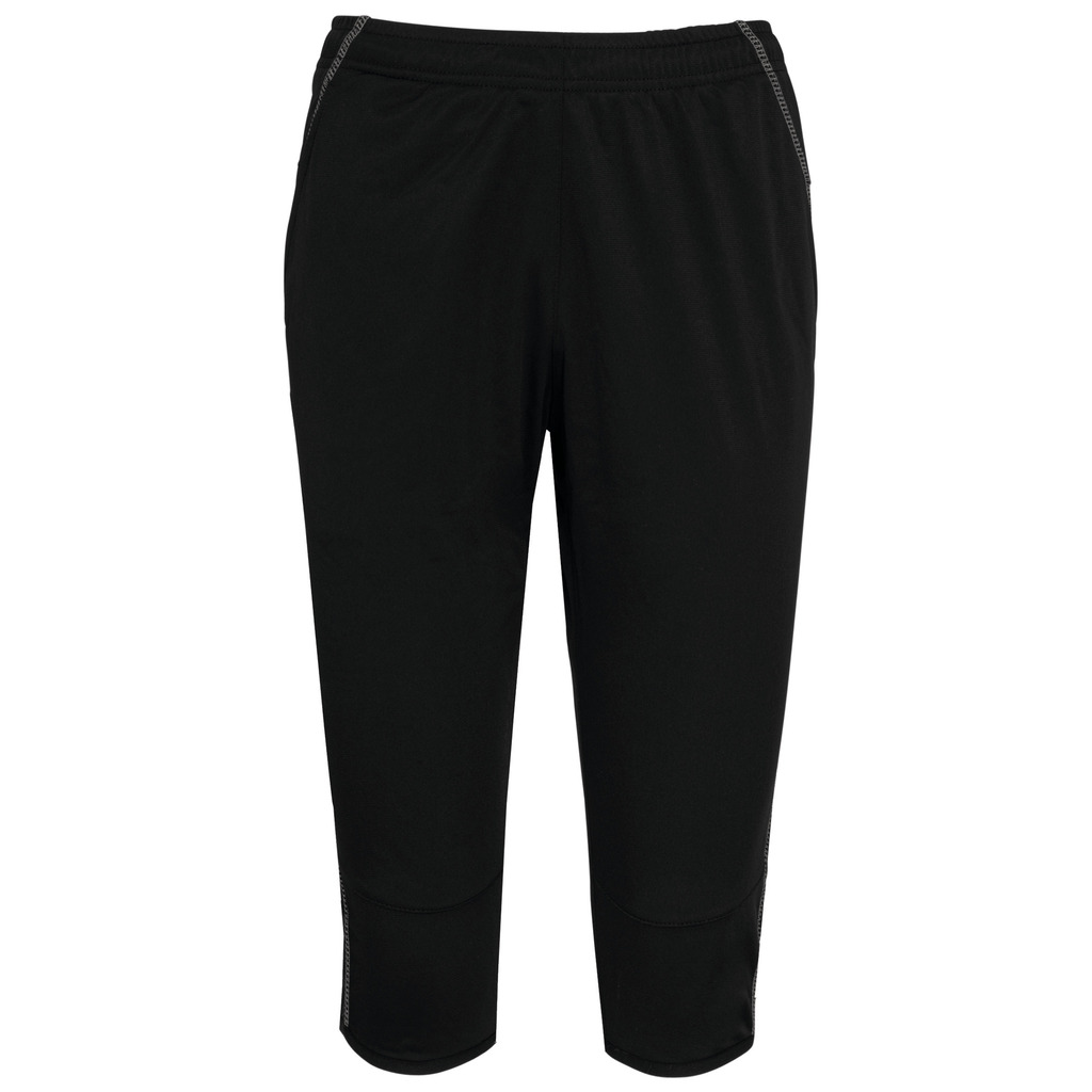 100% poliéster. 1 bolso lateral. Cintura elástica com cordão de ajuste. Acabamento da perna com punho elástico. Costuras em contraste.