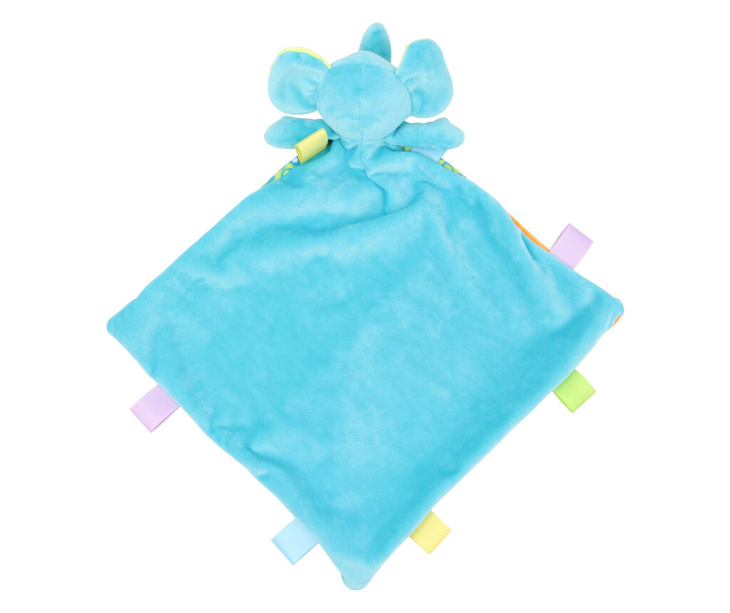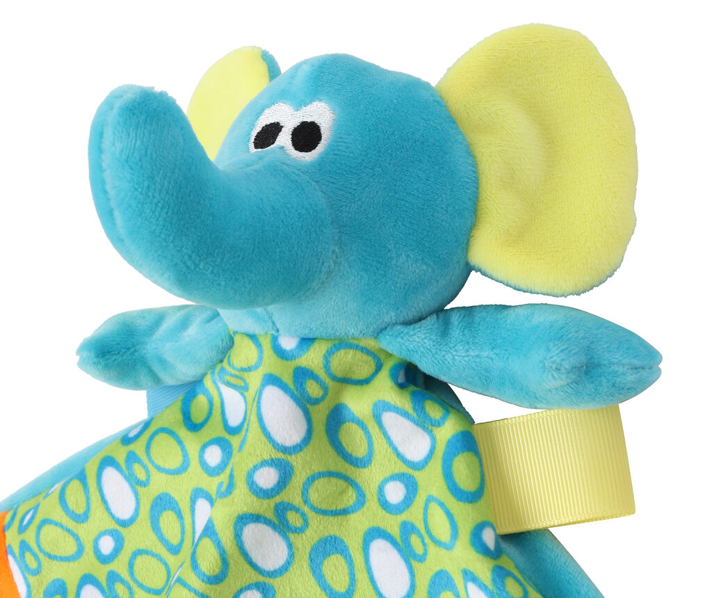 100% poliéster. Doudou/manta elefante com chocalho integrado. Capa com cores vivas estilo patchwork. Acesso com fecho para personalização. Em conformidade com a norma europeia EN71 para os brinquedos. Ideal para todas as idades.