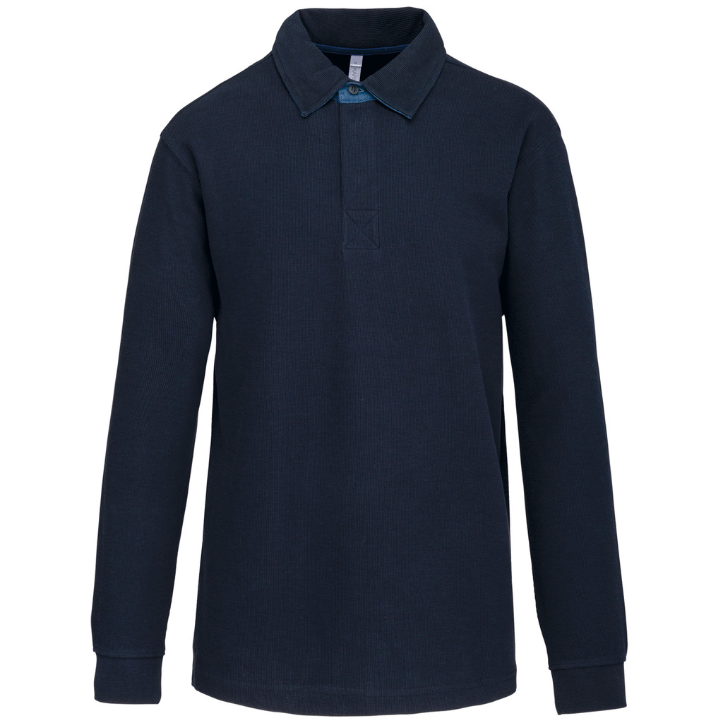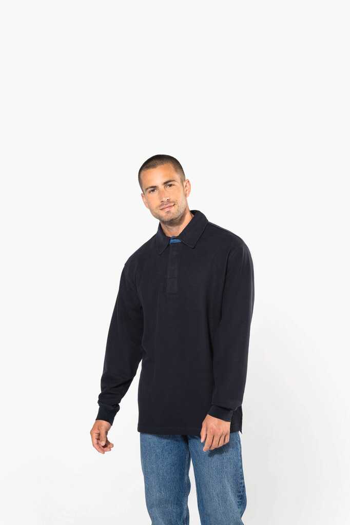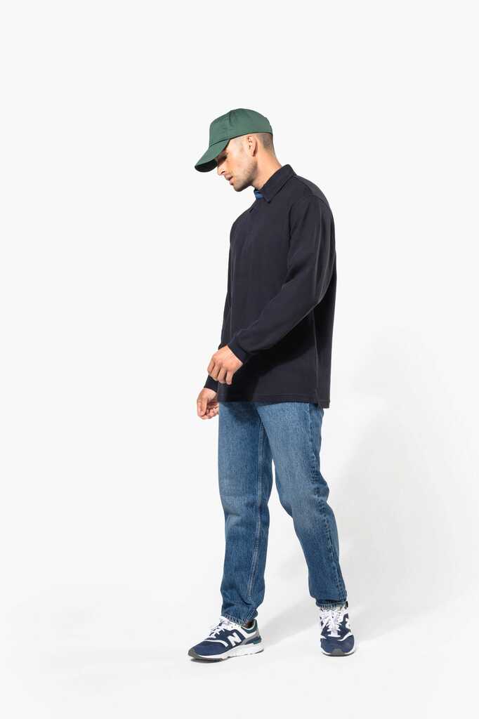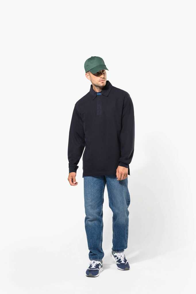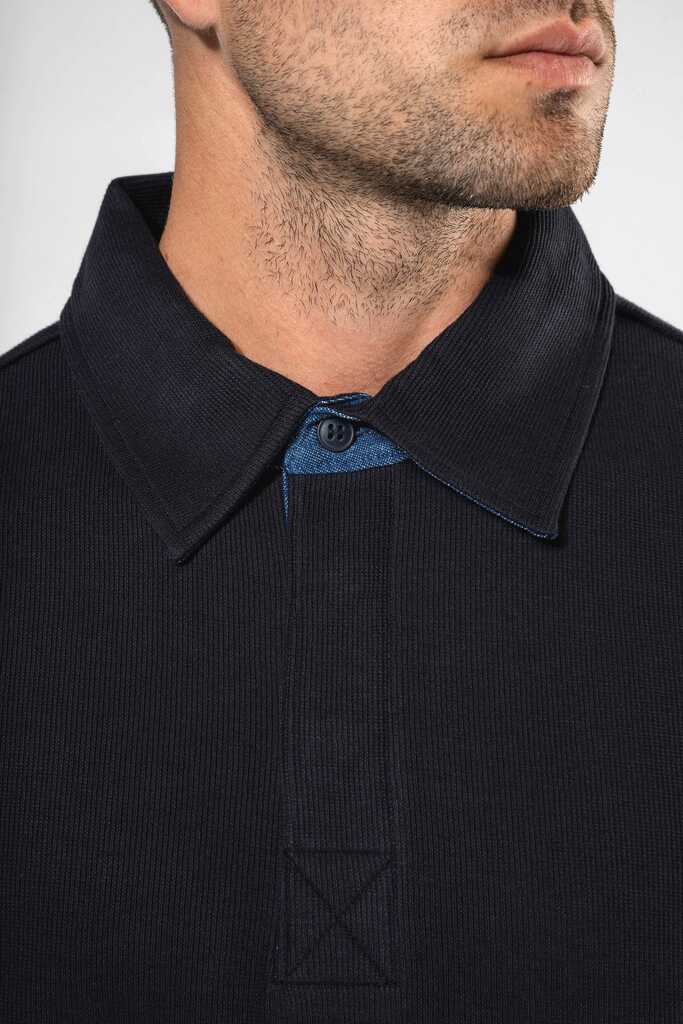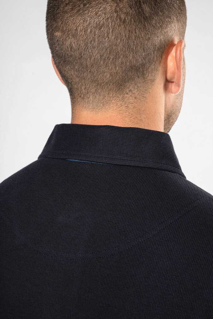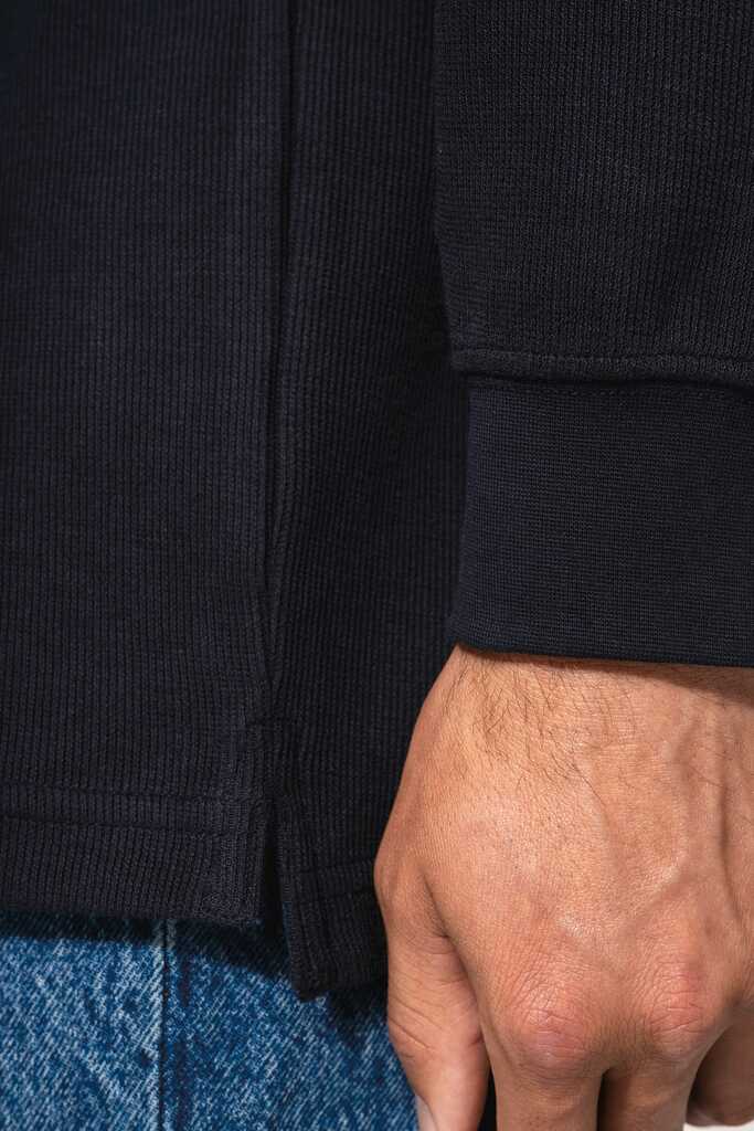 100% algodão rib (85% algodão,15% viscose na cor Heather Grey). Contraste na carcela e no interior da gola. Carcela com 3 botões. Aberturas laterais. Acabamento com costura dupla.