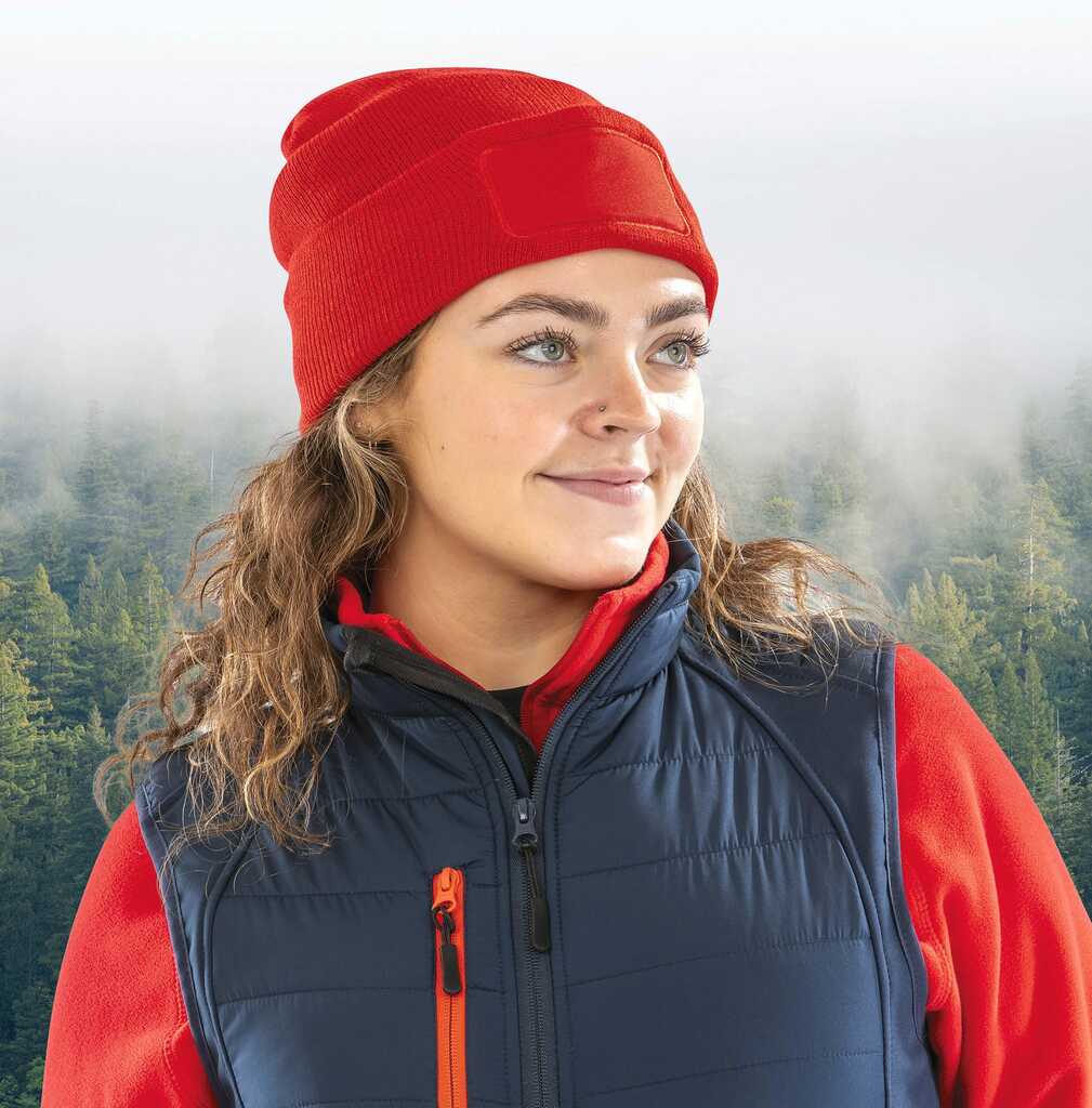 50% poliéster reciclado/50% poliacrÃlico. Patch em 100% algodão sarjado para impressão. Fios resistentes e de alta qualidade. Peça fabricada a partir de garrafas de plástico PET reciclado. Secagem rápida (Quick Dry). Gorro com dobra. Espessura dupla. Forro 3M Thinsulate.