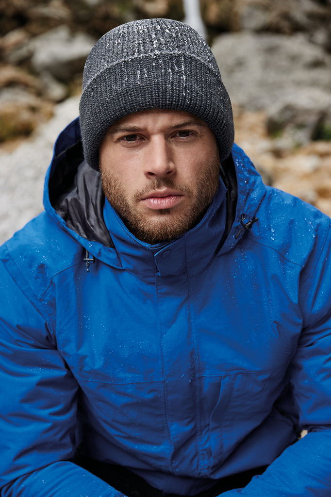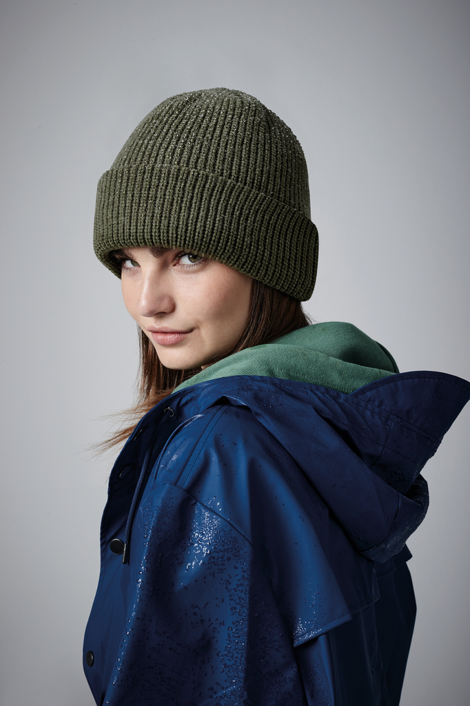 100% acrÃlico. Forro em micropolar 100% poliéster. Malha canelada. Tratamento repelente à água para uma protecção excepcional contra as intempéries. Forro em micropolar para mais conforto e calor. Com dobra para optimizar a personalização. Etiqueta TearAway para facilitar a personalização.