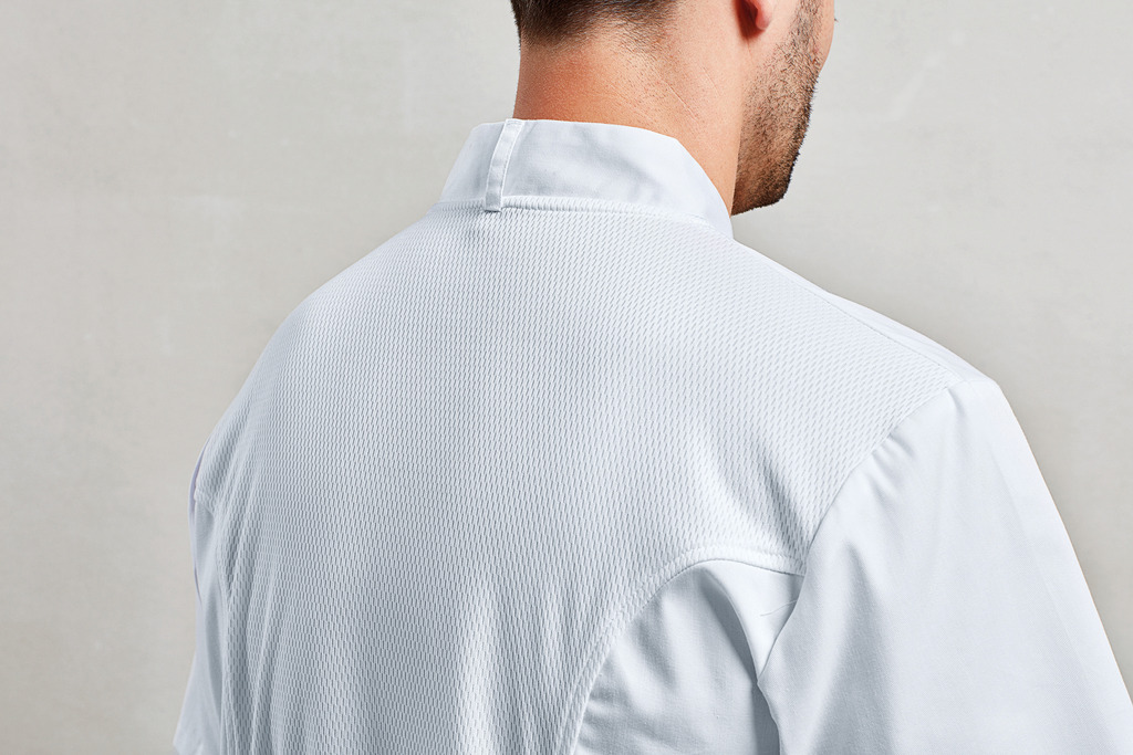 65% poliéster, 35% algodão. Aperta com dez botões em tecido. Um bolso duplo para canetas na manga esquerda. Gola à padre. Painel central das costas é fabricado a partir de tecido Coolchecker® que permite a gestão da humidade e a saída da transpiração. Lavagem doméstica a 60 °C.