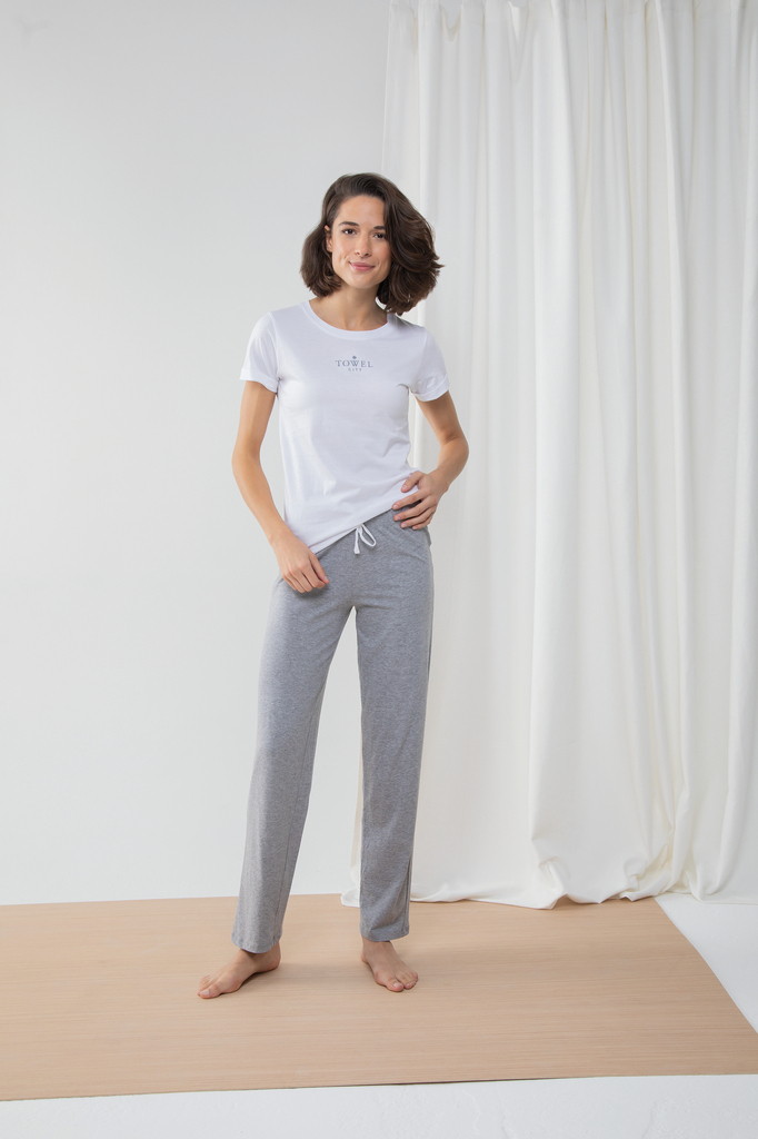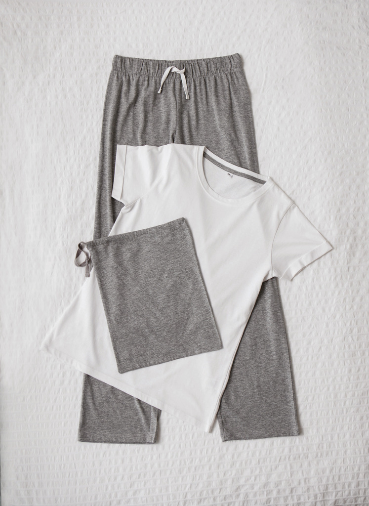 Jersey simples 100% algodão (Heather Grey: 85% algodão/15% viscose). Kit pijama com: 1 t-shirt White com decote redondo de manga curta + 1 calças com cós elástico + 1 saco com cordão.
