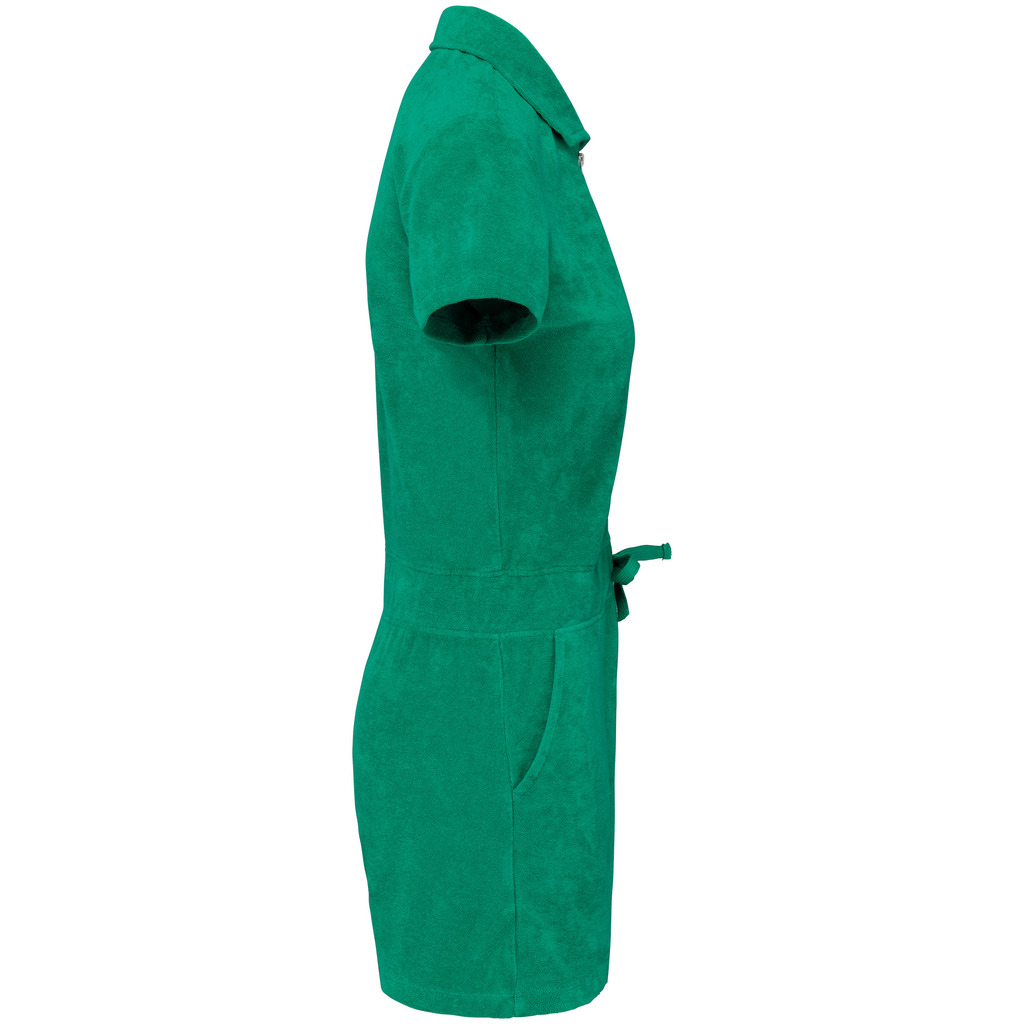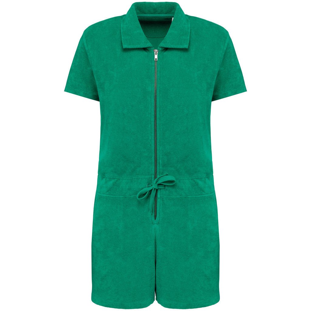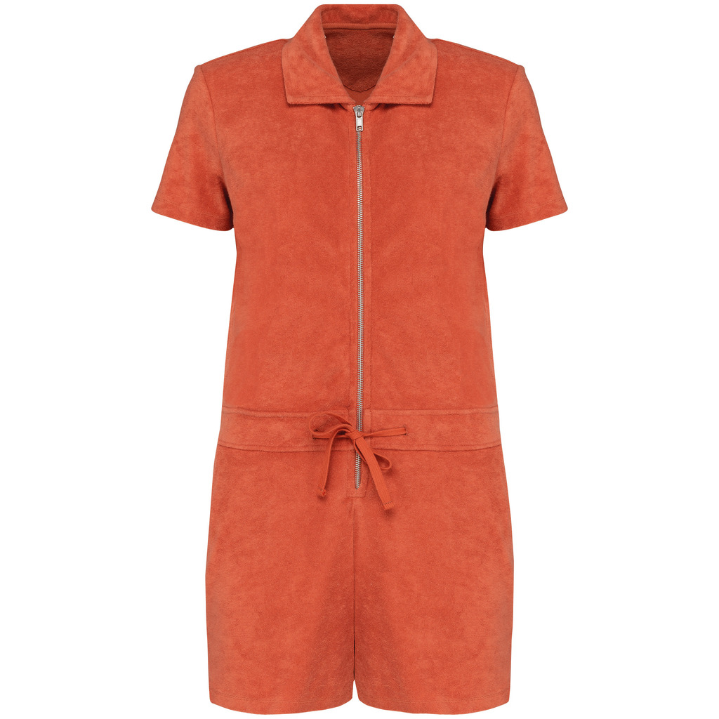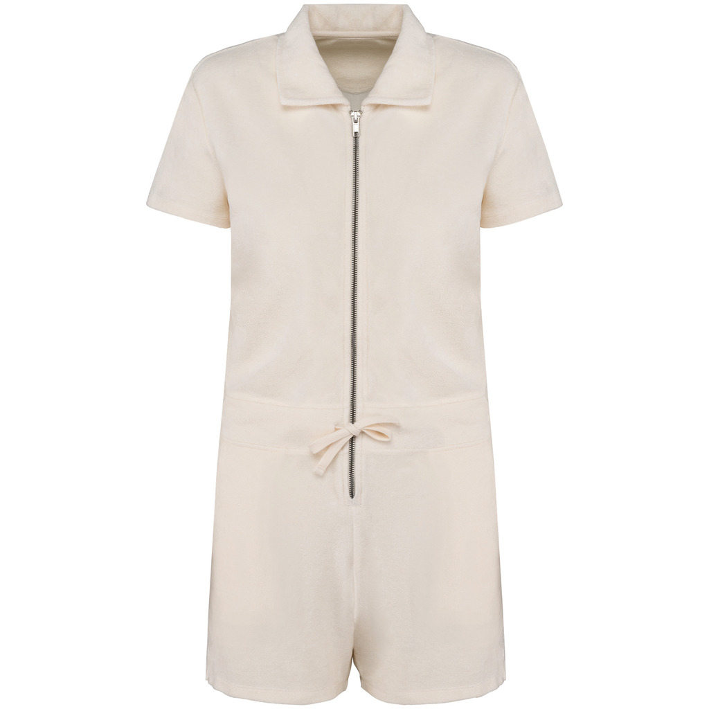 80% algodão biológico / 20% poliéster reciclado pós-consumo. Fabricado em Portugal. Algodão penteado. Material turco. Com banho de enzimas. Corte direito. Acabamento do decote com tapa-costuras em chevron tom sobre tom. Costura dupla nas mangas e na parte inferior. Cintura com cordão de ajuste e ilhós bordados para a passagem do cordão. Fecho traseiro no meio em metal reciclado. Dois bolsos laterais na cintura com pesponto na abertura do bolso. Meia-lua nas costas.
