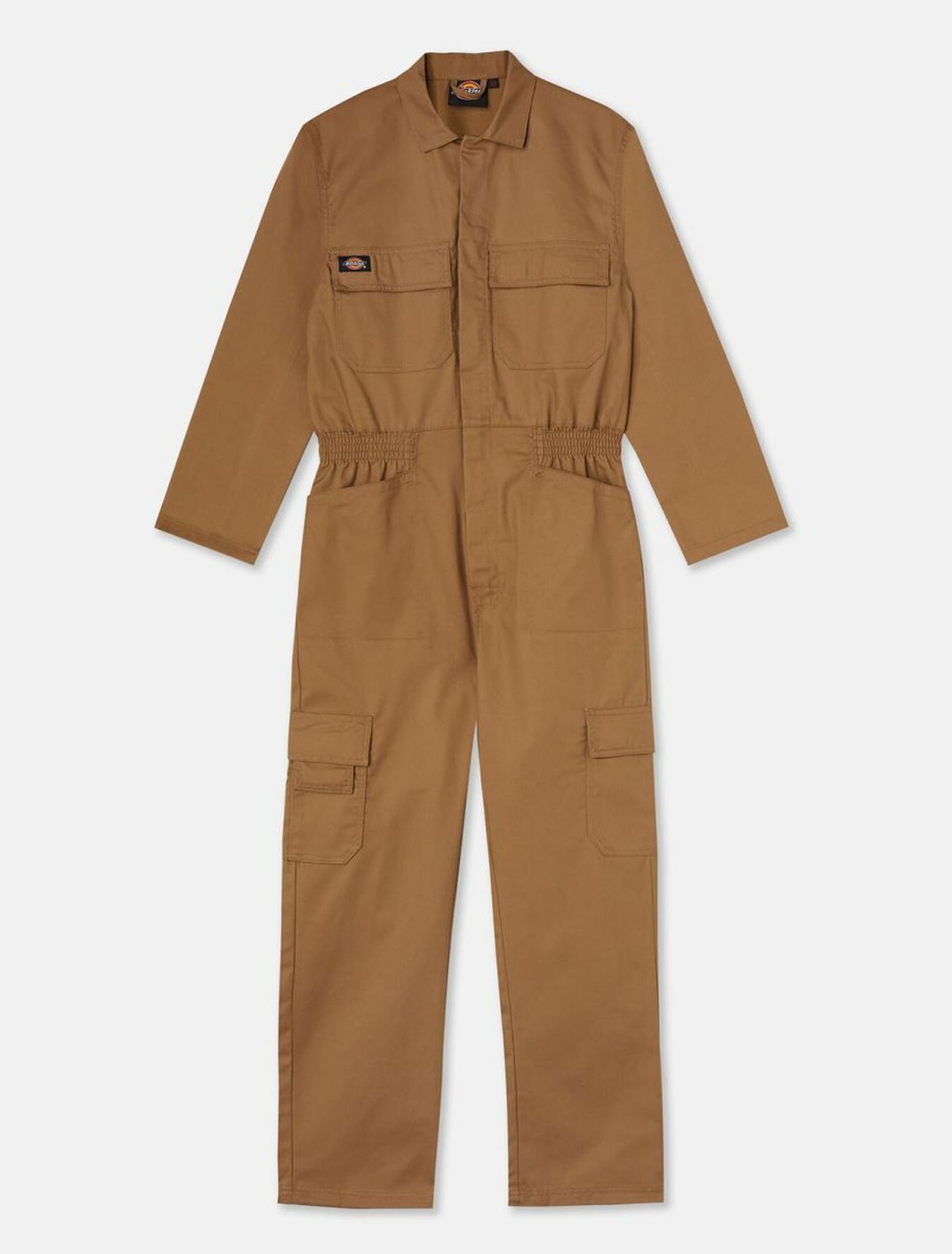 65% poliéster / 35% algodão. Fato de salto com pregas nas costas para facilitar o movimento. Cintura dorsal elástica. Bolsos laterais. Bolsos de carga multiusos em ambas as pernas. Lavável a 60°.