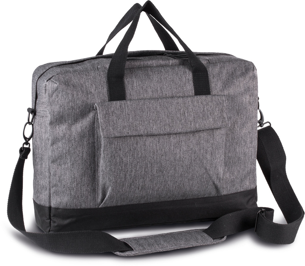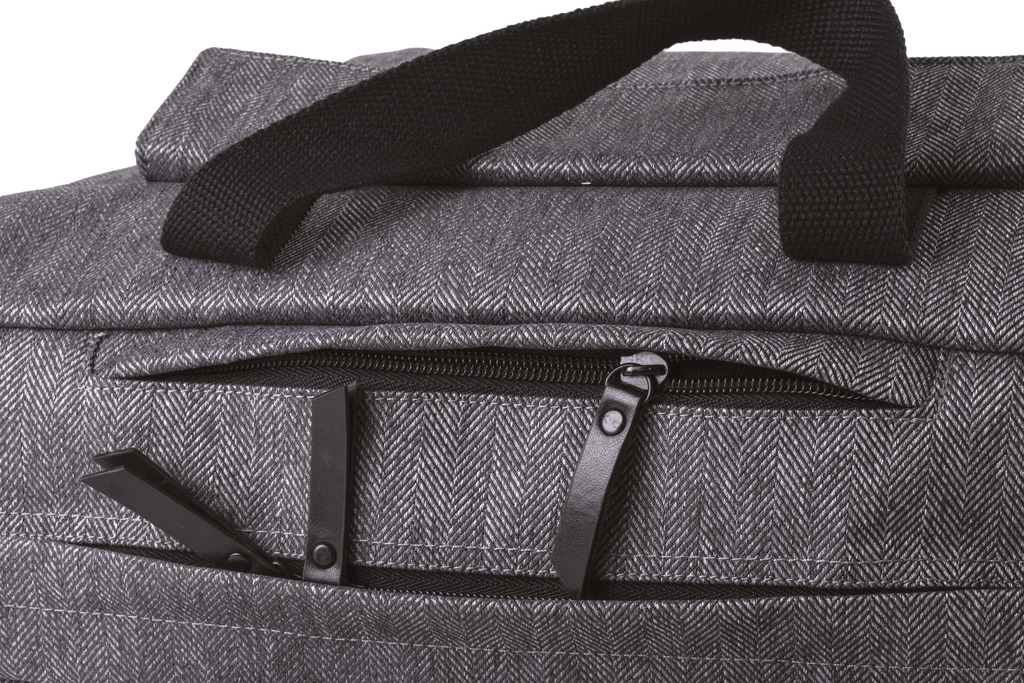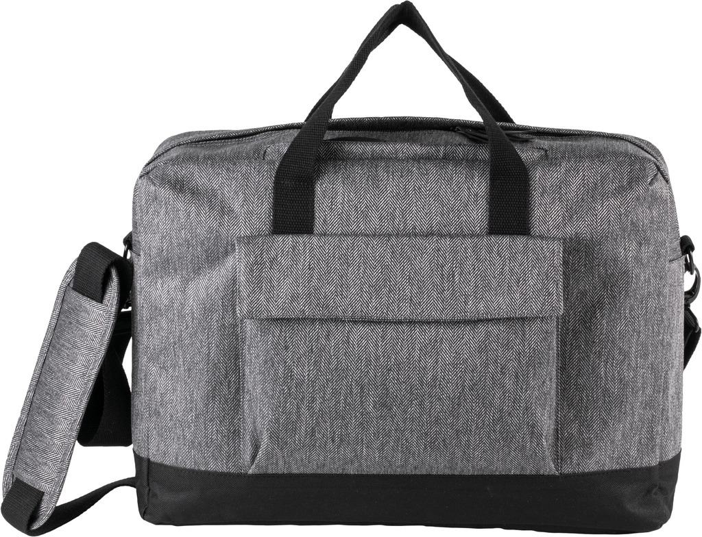 Mala porta-computador em poliéster, fundo da mala em contraste em poliéster 600D. Compartimento acolchoado para guardar um computador até 15″ e um bolso com fecho acolchoado para colocar um tablet. 2 bolsos interiores, 1 bolso com fecho na parte superior da mala para guardar o telemóvel, 1 bolso à frente com pala em contraste e molas. Presilha nas costas para fixação num trolley, alça de ombro amovÃvel.