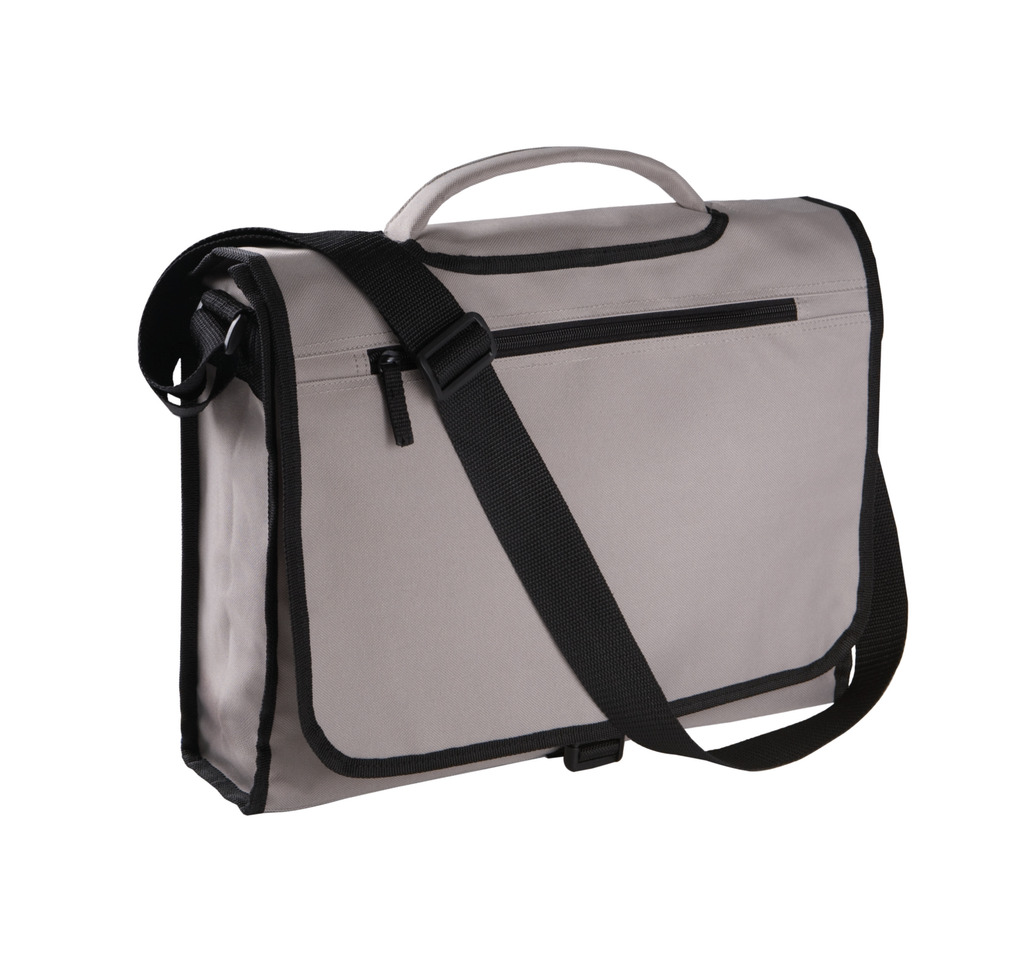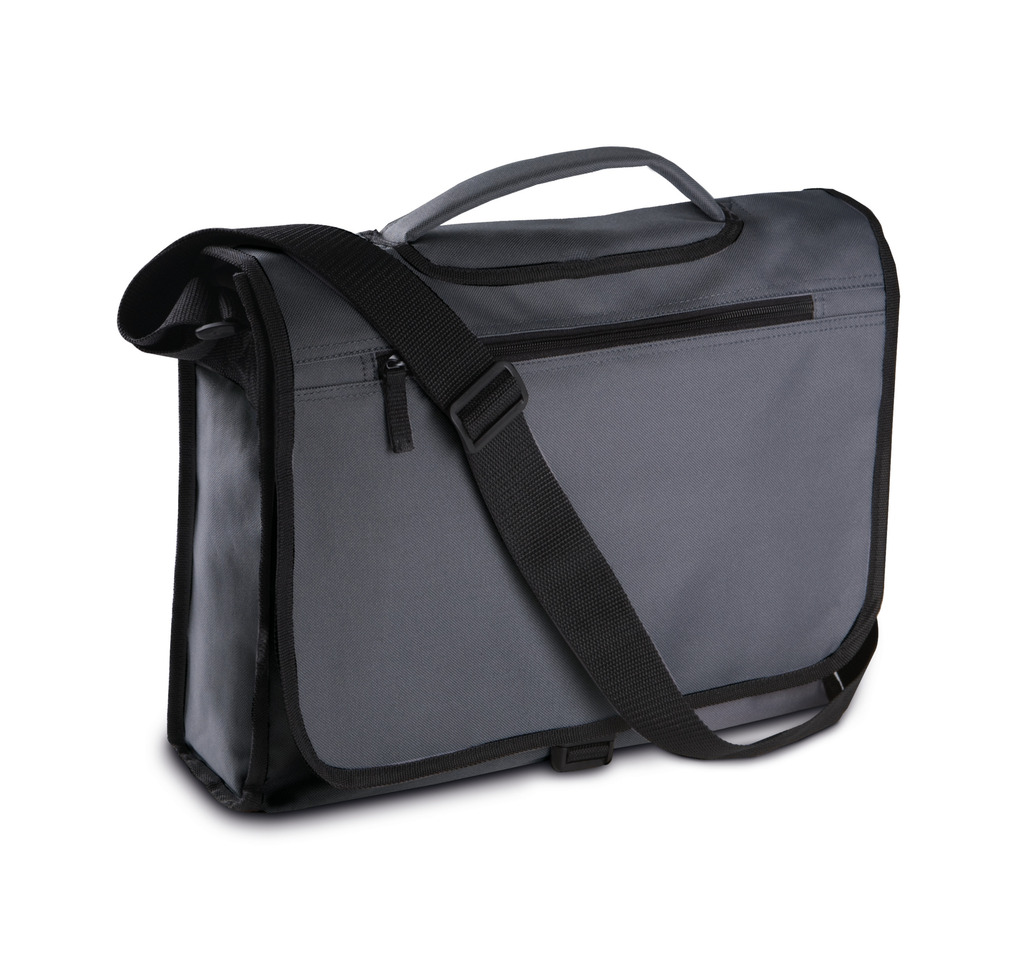 Pasta para documentos em poliéster 600D. Alça de ombro ajustável. Aba frontal com bolso com fecho e mola de encaixe. Tem porta-canetas e porta-cartões.