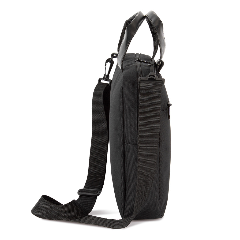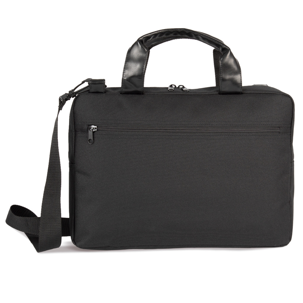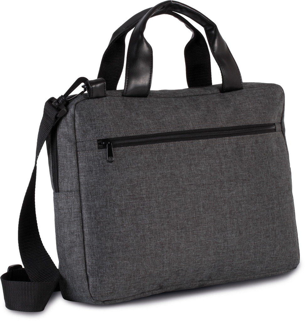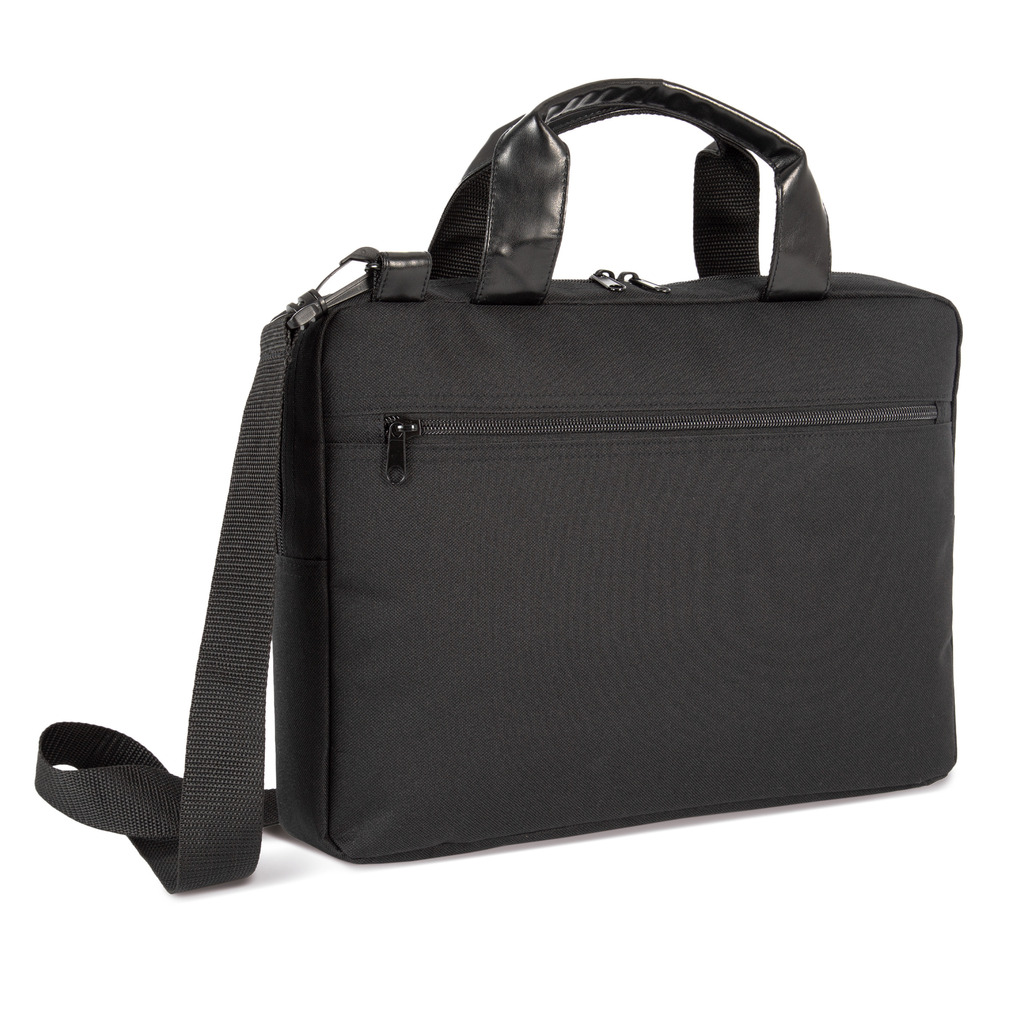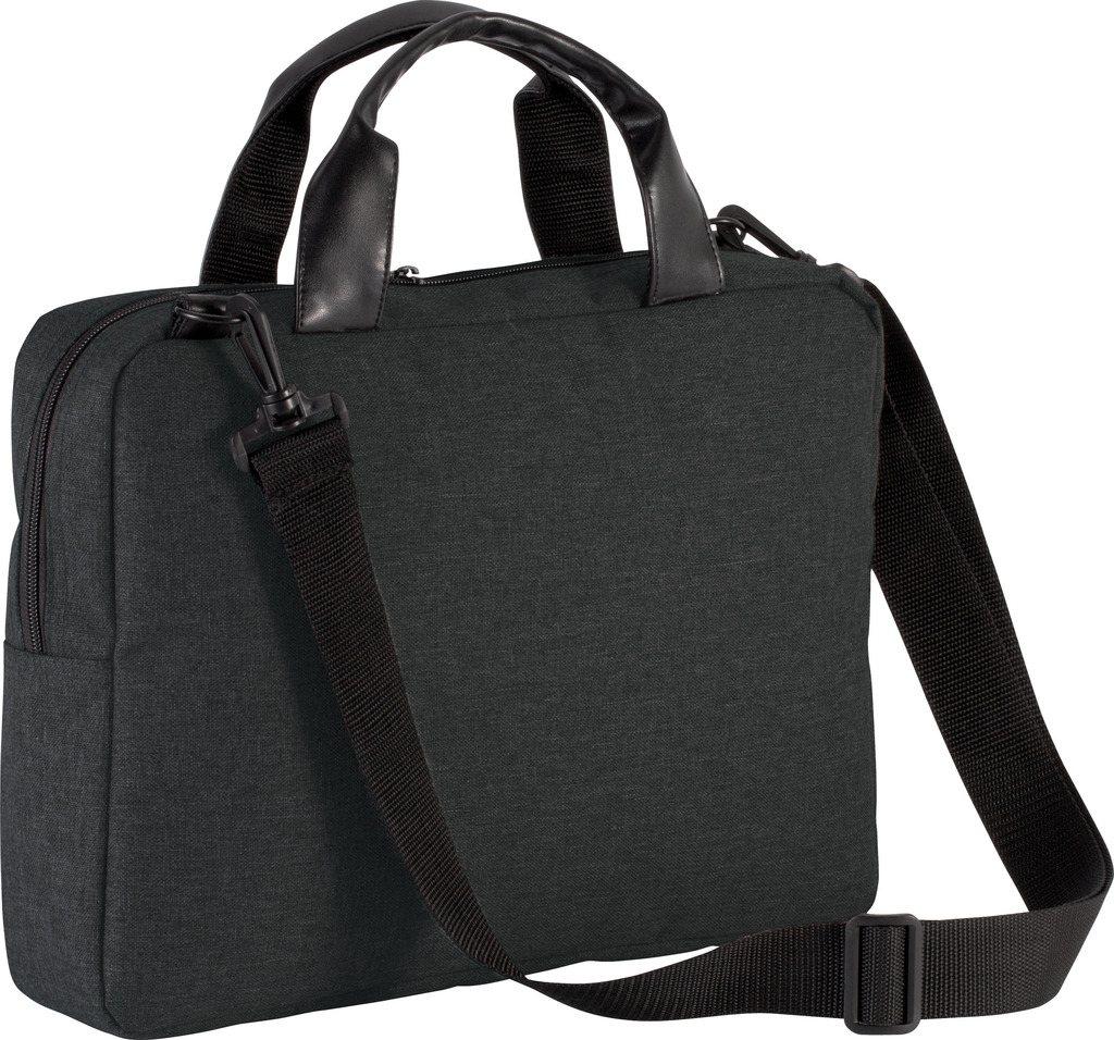 Mala porta-documentos/computador em poliéster 600D. Bolso acolchoado para computador até 13″, bolso com fecho à frente, pegas em contraste. Alça de ombro amovÃvel.