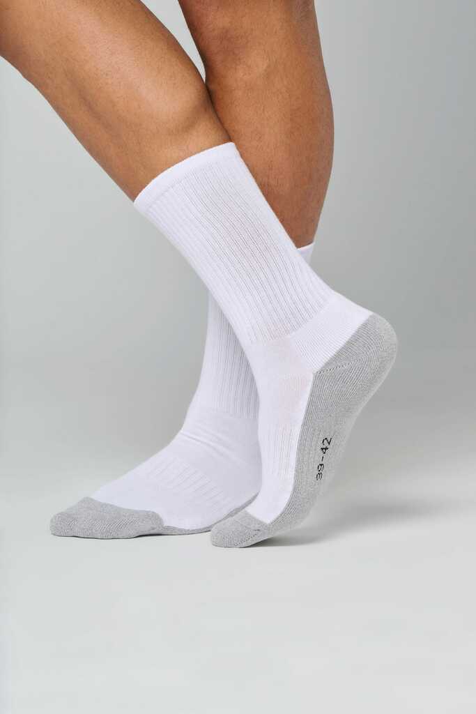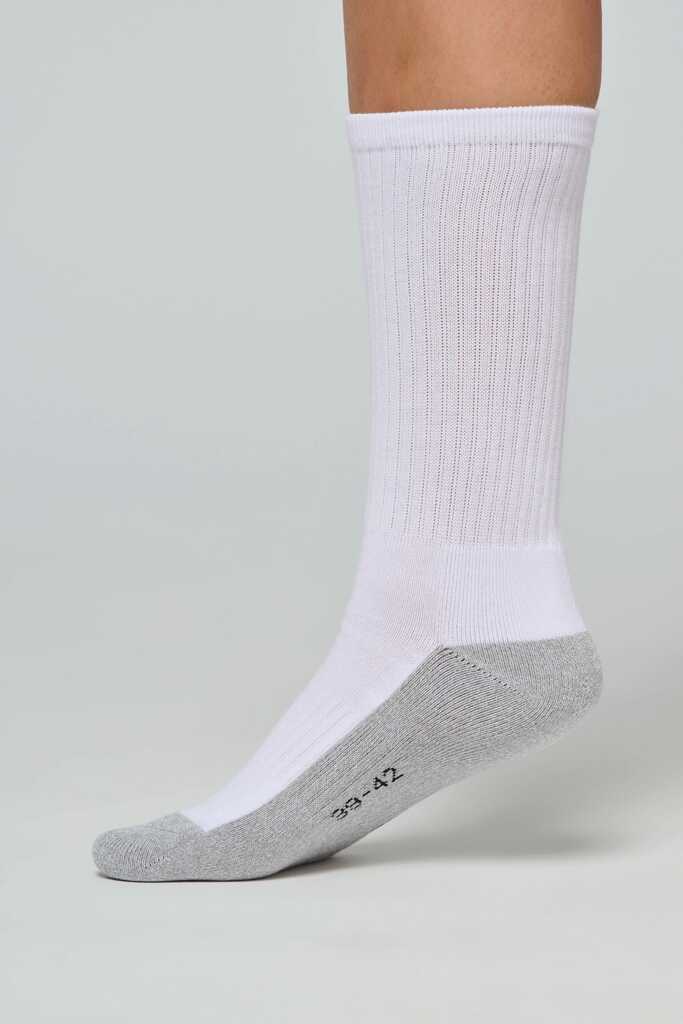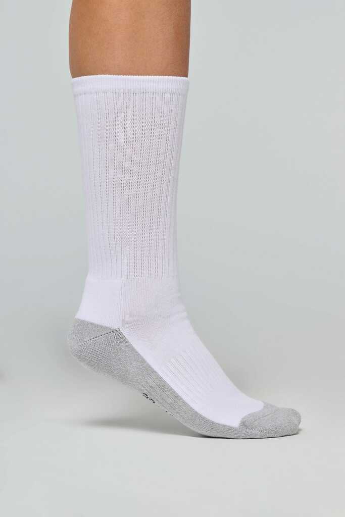 80% algodão / 11% poliéster / 7% poliamida / 2% elastano. Malha turca no interior para maior conforto. Costura plana junto aos dedos dos pés. Malha apertada no tornozelo e na zona central do pé para maior conforto e protecção. Sola em malha cinzenta.