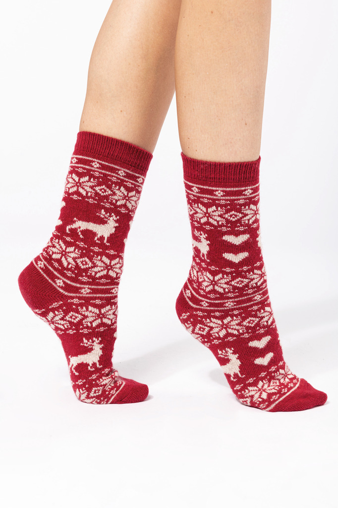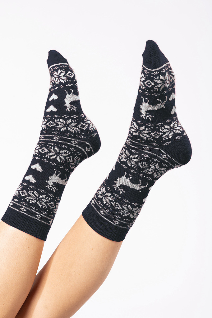 36% lã / 34% poliamida / 20% viscose / 8% caxemira / 2% elastano. Malha arqueado 6. Fabricadas em Itália. Semi-longas. Calcanhares e pontas reforçados. Motivos veados e flocos em jacquard. Acabamento duplo 2,5 cm acima do tornozelo para um máximo de conforto. Suporte com orifÃcio para pendurar em expositores. Peso médio do par: 46 gr.