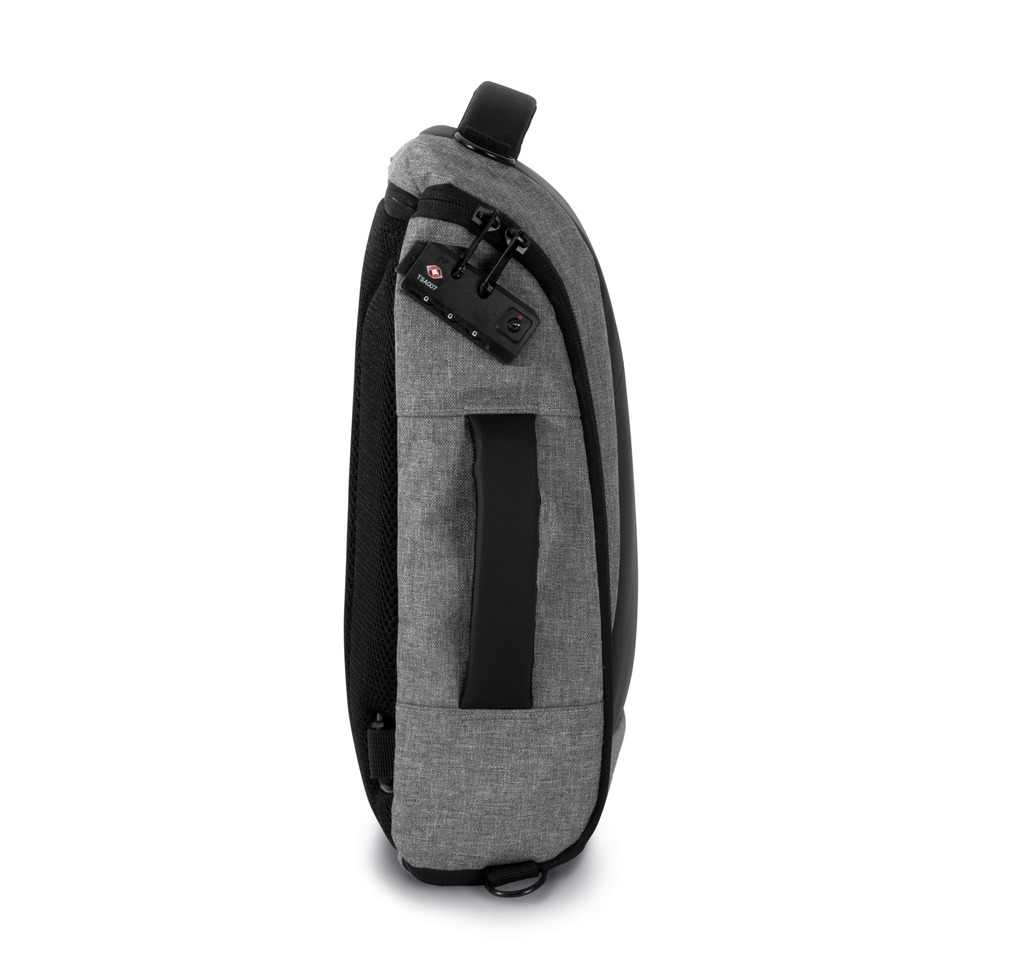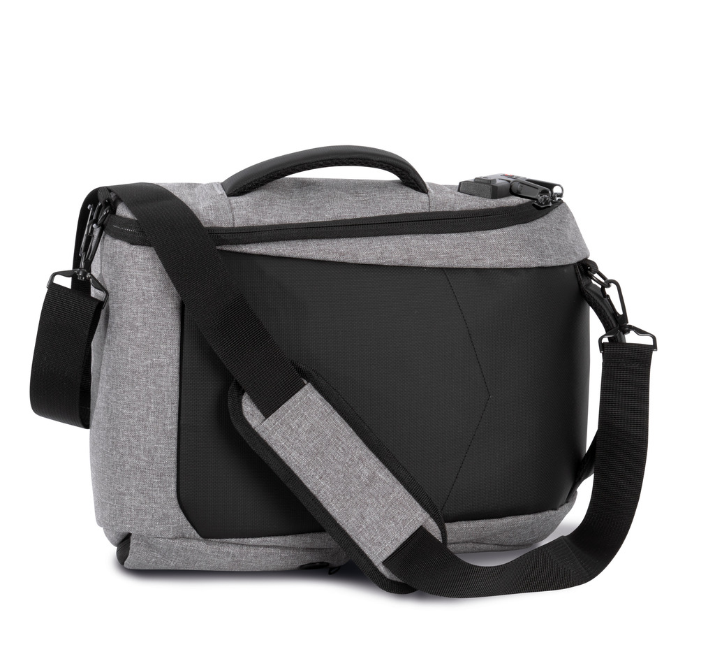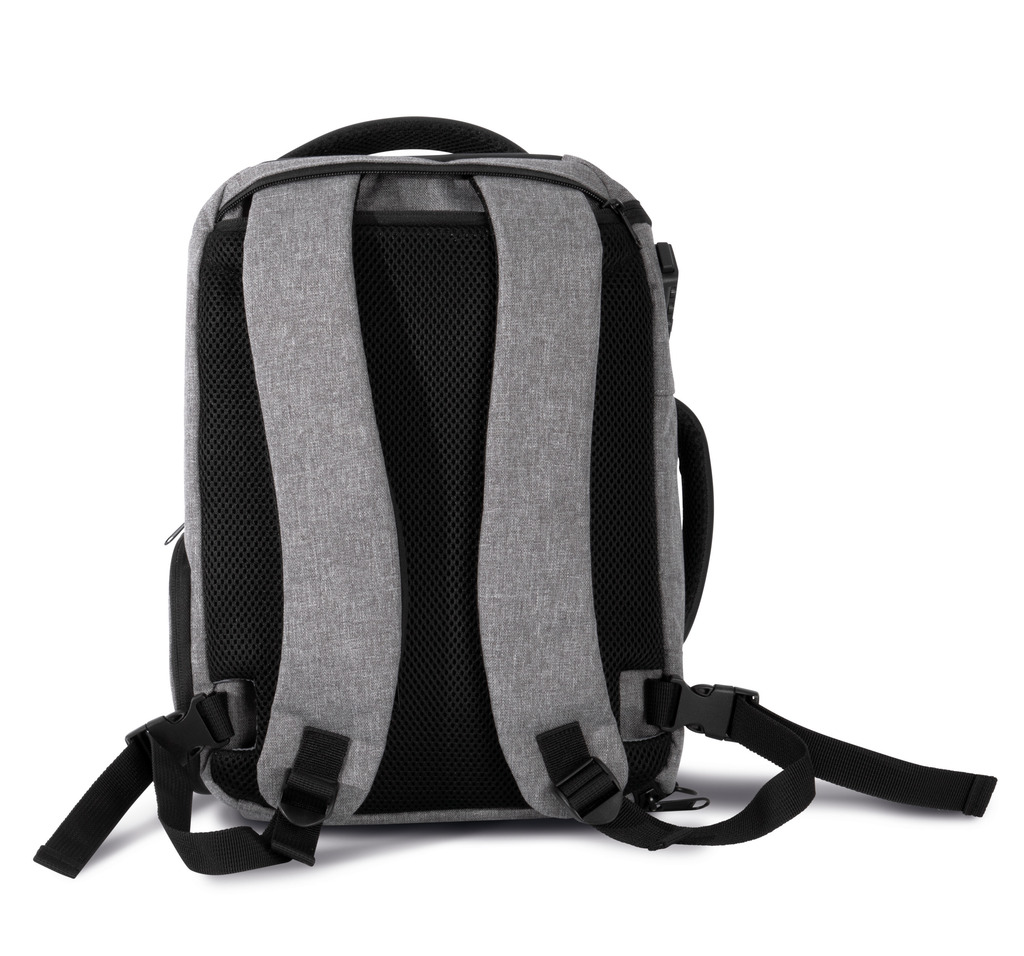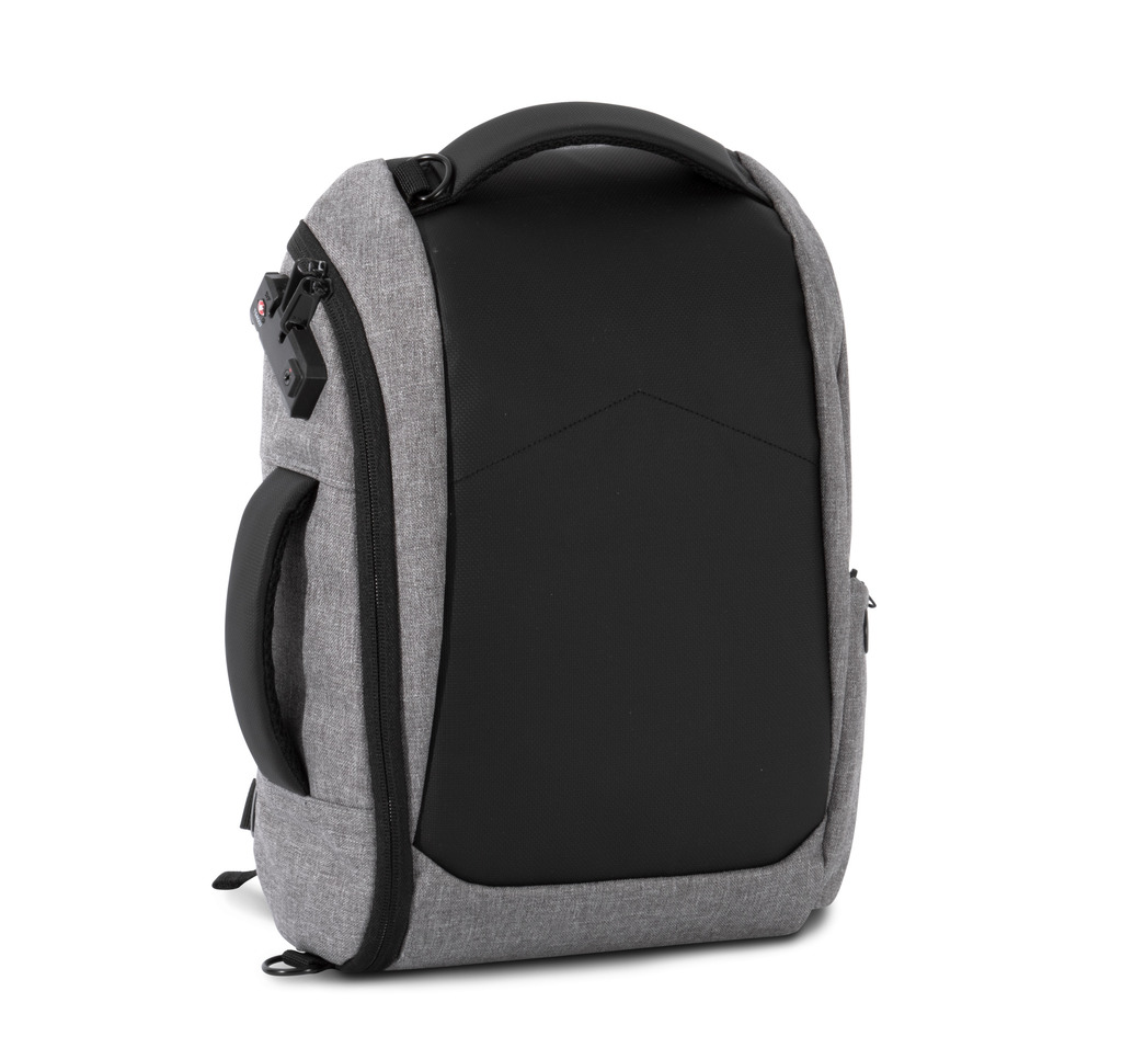 100% poliéster reciclado. Versão mais pequena da mochila KI0888 para um tablet com 13”. Com fecho nas costas com sistema de bloqueio TSA. Bolso com fecho de acesso rápido nas costas. Alças de ombro e peito ajustáveis. 2 bolsos com fecho nas alças. 2 fivelas para fixação no saco para transportar camisolas, casacos, etc. 2 bolsos laterais. 1 bolso lateral com uma porta USB e cabo micro-USB (incluído) que permite a ligação de uma powerbank. 1 bolso lateral com cabo anti-roubo em espiral para prender o saco ao pé de uma mesa ou cadeira. 2 bolsos em rede com fecho. 2 bolsos amovíveis com fecho para cabos ou acessórios. 2 bolsos interiores, um para garrafas/cantis e um para powerbanks.