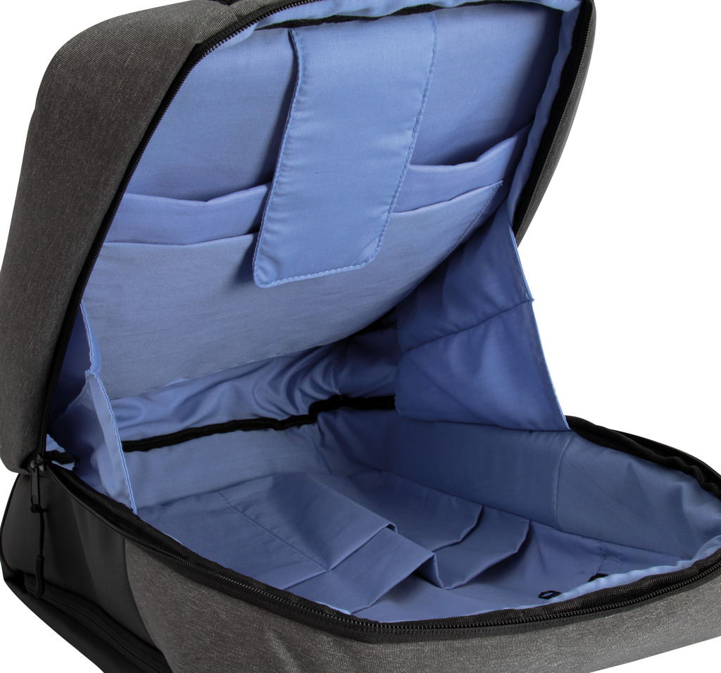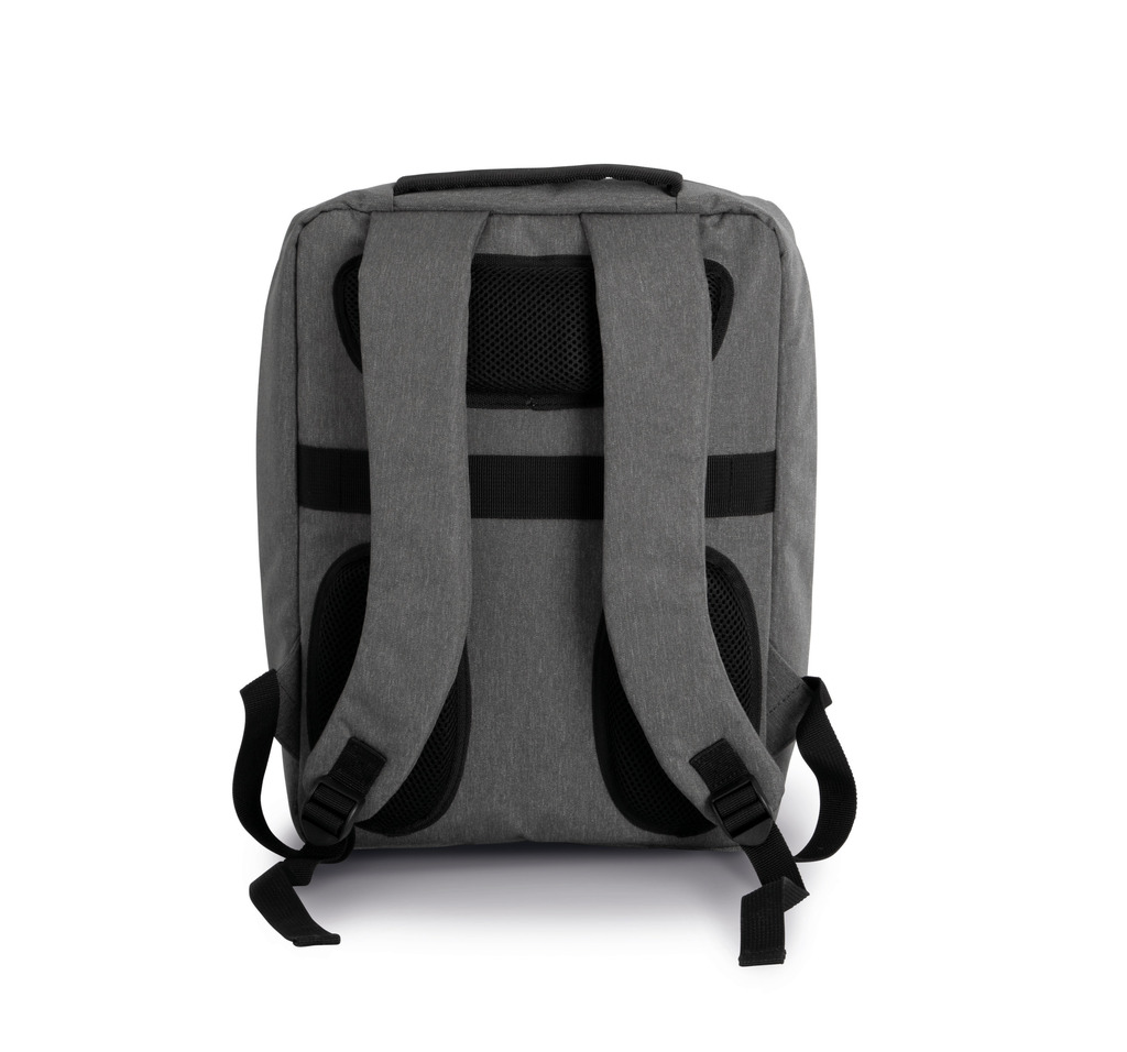100% poliéster. Mochila business estilo descontraído em poliéster. Com um compartimento principal com espaço para um computador com até 13” ou um tablet com 11” e um bolso com fecho para acessórios. Além disso, possui um grande compartimento frontal com fecho, um espaço para óculos e outros acessórios e um grande bolso lateral com fecho. Encaixes práticos para fixação a um trolley na parte traseira para facilitar o transporte.