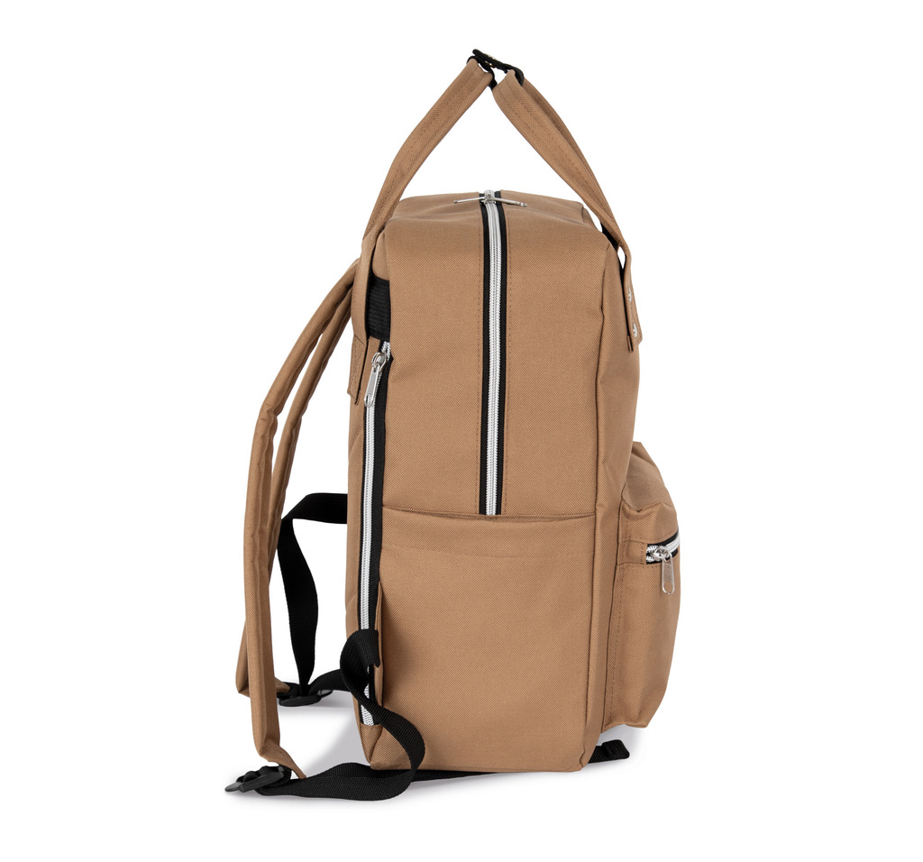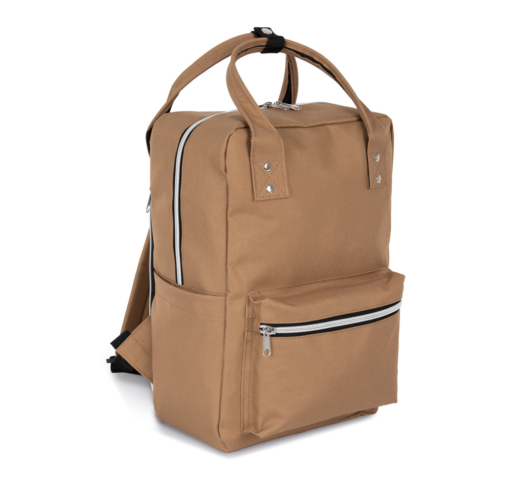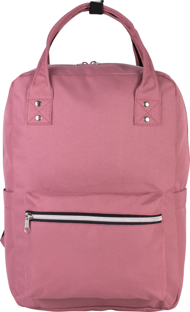 Mochila em poliéster 600D, podendo ser utilizada como mochila de mão graças às suas pegas na parte superior. Bolso interior acolchoado onde pode ser colocado um tablet ou um telemóvel. Abertura com fecho nas costas. Alças e costas acolchoadas. Bolso frontal com fecho. Fechos em contraste.