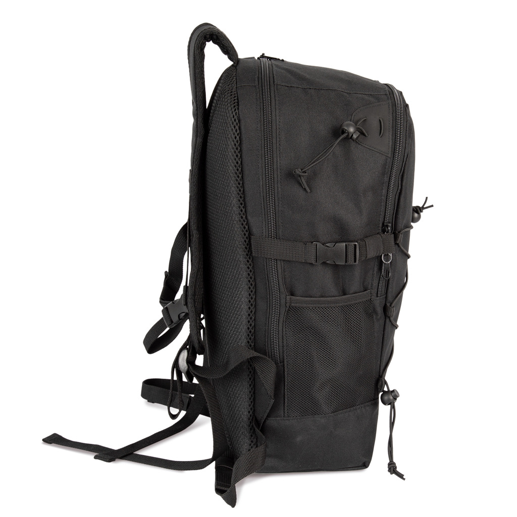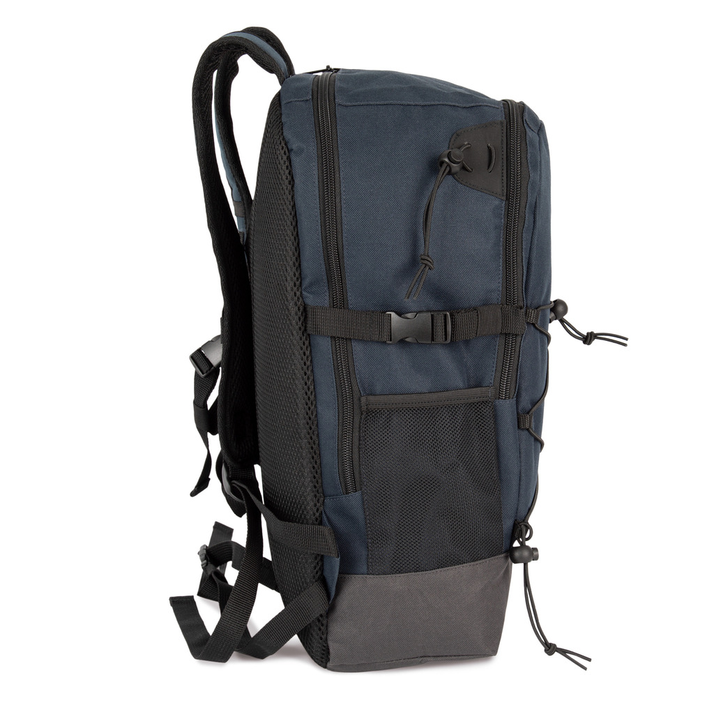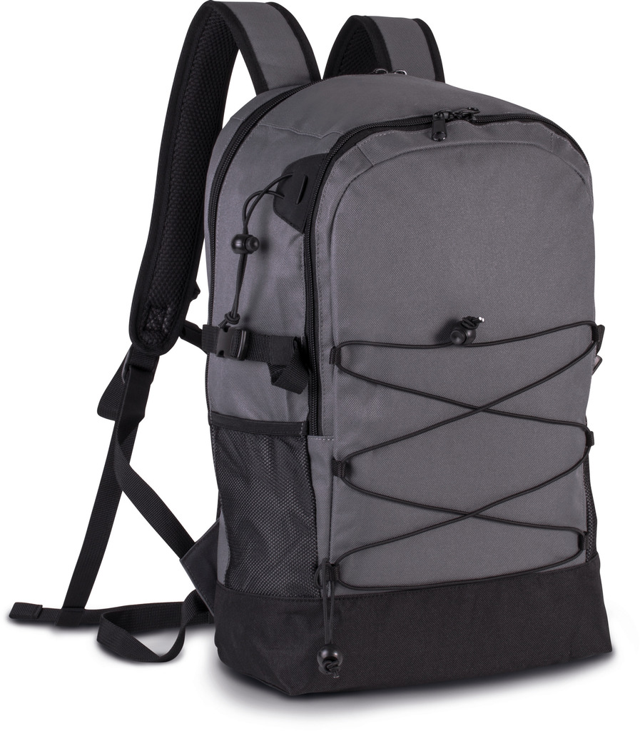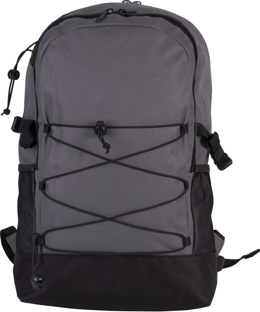 Mochila em poliéster 600D. 2 compartimentos interiores com 1 bolso com fecho. Rede elástica na zona frontal. Alças e costas acolchoadas e respiráveis. 2 bolsos com rede nos lados. Alças/Presilhas ajustáveis na cintura e no peito.